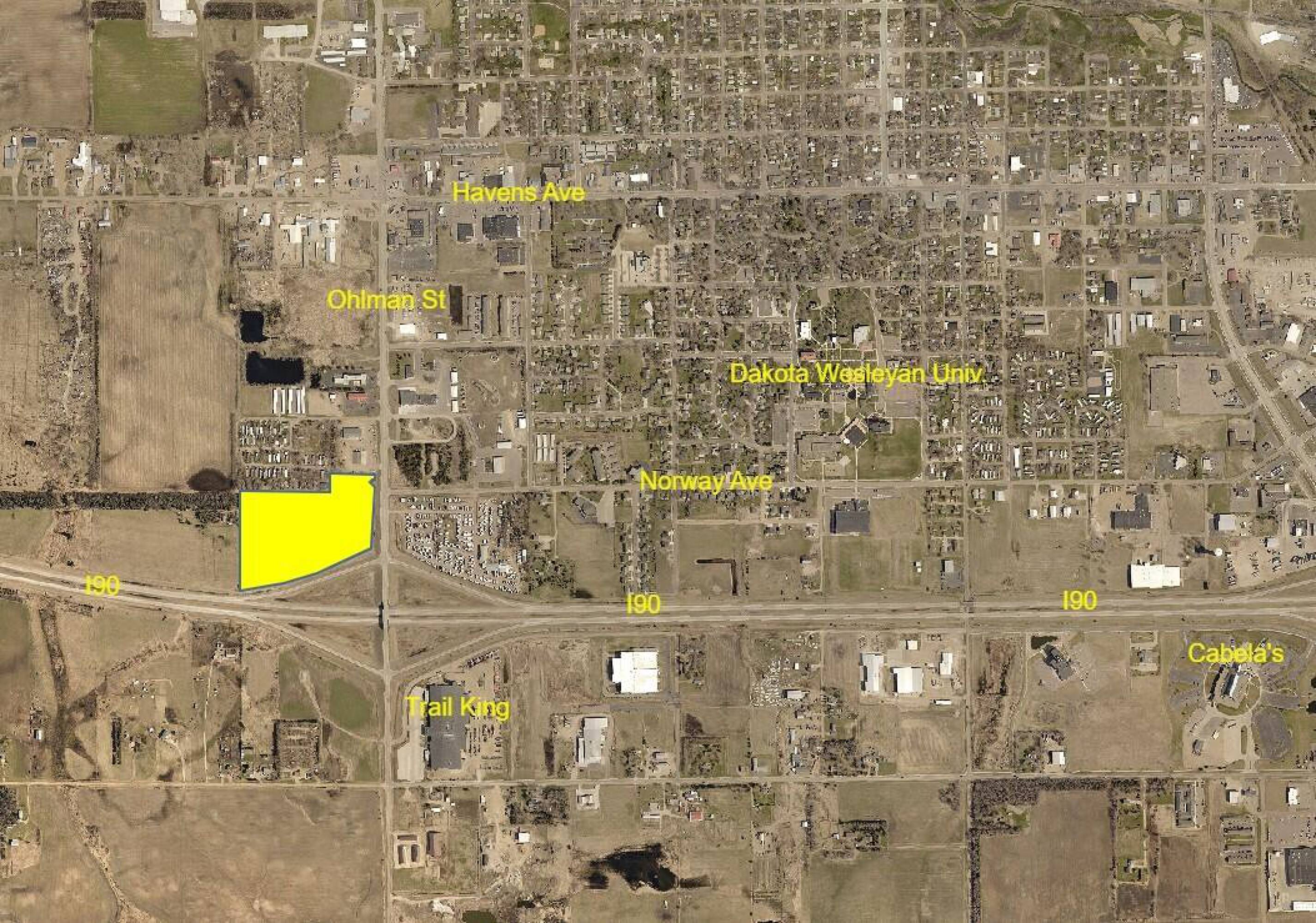 This is a large commercial development site of over 22 acres. It is located at the northwest corner of Exit 330 of I-90 and Highway 37 (South Ohlman Street) in the City of Mitchell. The site has high visibility and accessibility to I-90, which sees 3.7 million vehicles per year. The intersection traffic count is 20,000 per day. It is suitable for a hotel, convenience store/truck stop, healthcare facility, warehouse, distribution center, auto, implement, or RV sales, storage, or retail outlet mall.