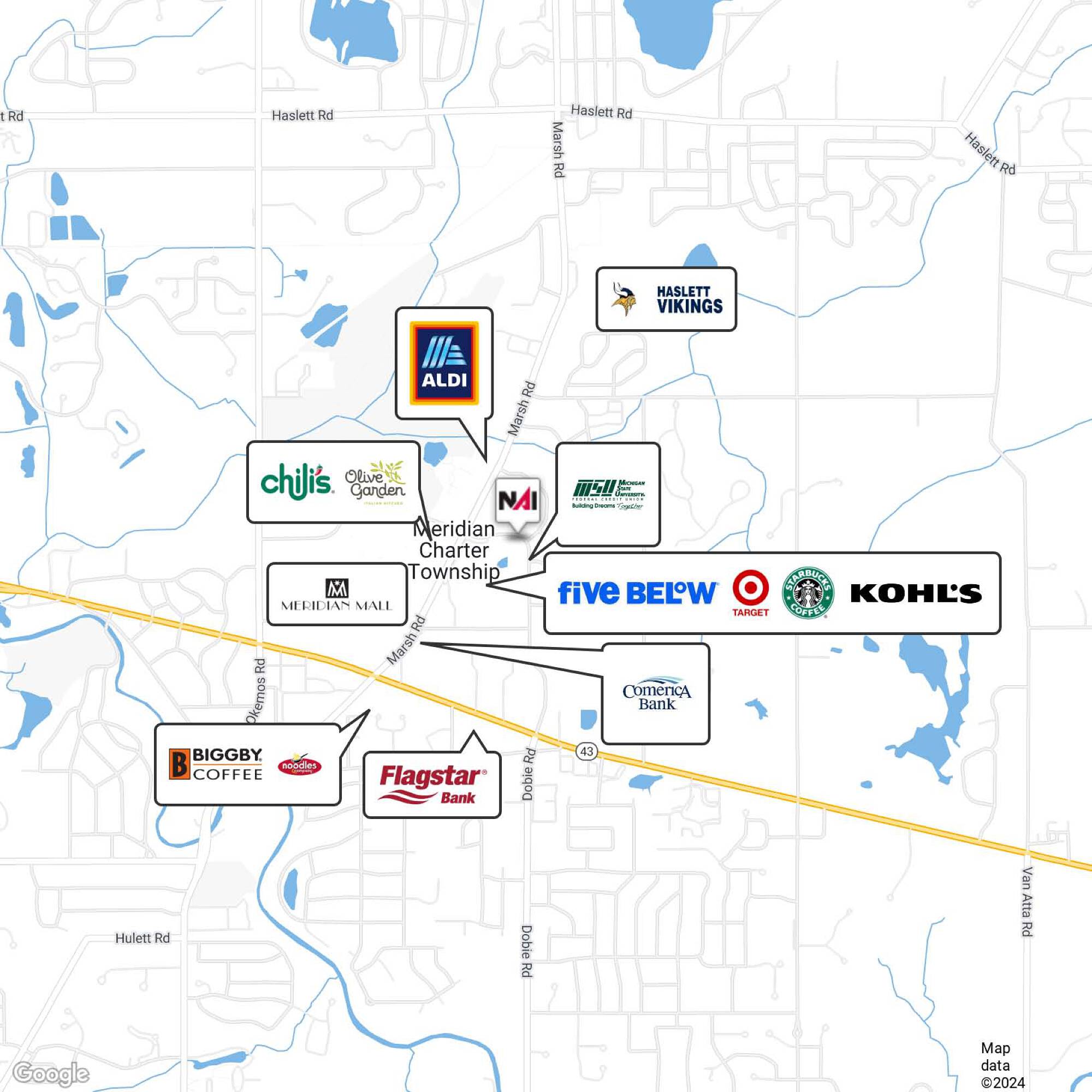 Retail and office spaces for rent in Okemos, Michigan.