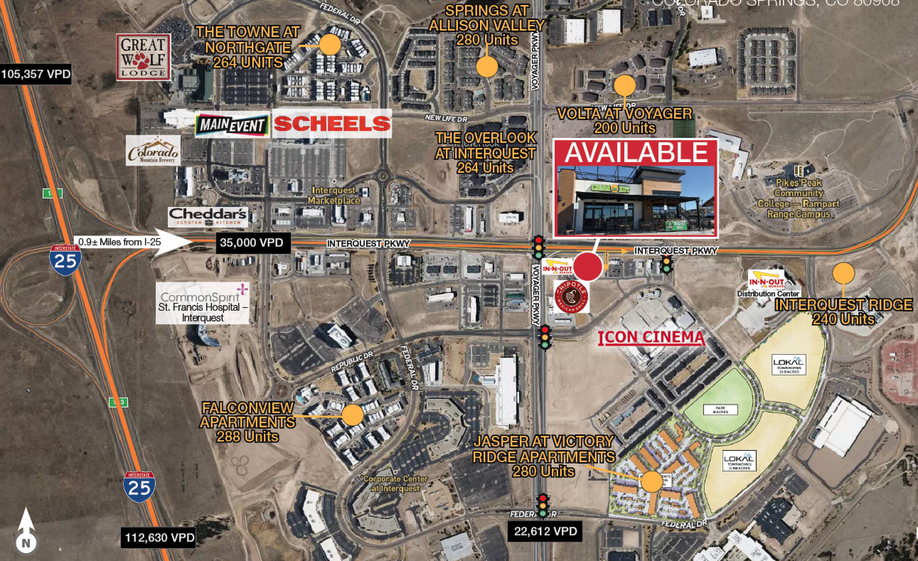 This is a restaurant property located in the Victory Ridge mixed-use development in northern Colorado Springs. Situated less than a mile from Interstate 25 and with frontage on Interquest Parkway, the location offers high visibility and accessibility. The surrounding area includes major retailers, large office complexes, entertainment venues, hotels, and residential apartments. The property is located on the Interquest Parkway corridor, known for its dining options. The property features a rooftop patio and outdoor seating areas. The property size is 4,228 square feet.
