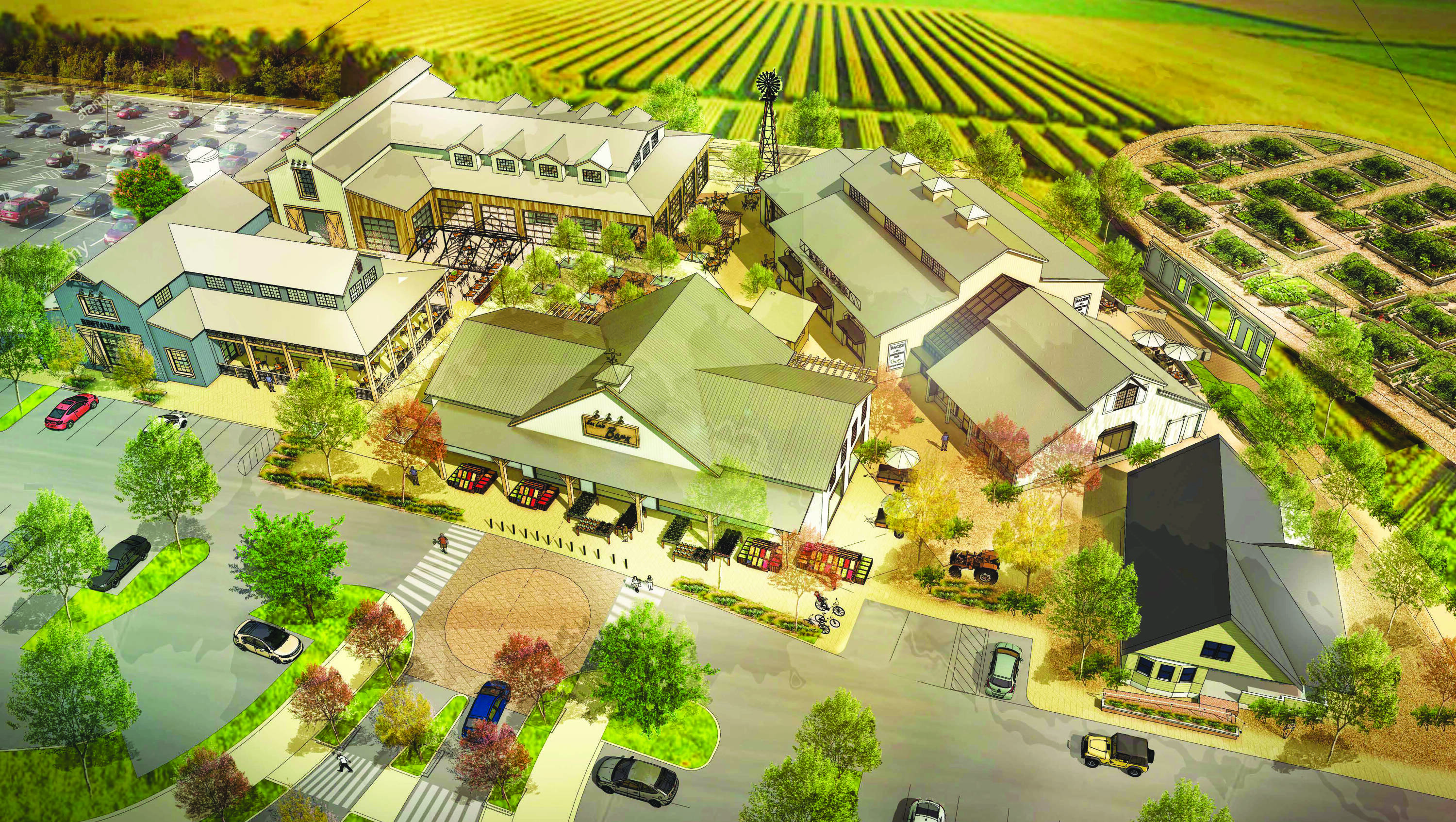 Farm and marketplace with retail, restaurant, and agricultural processing spaces.