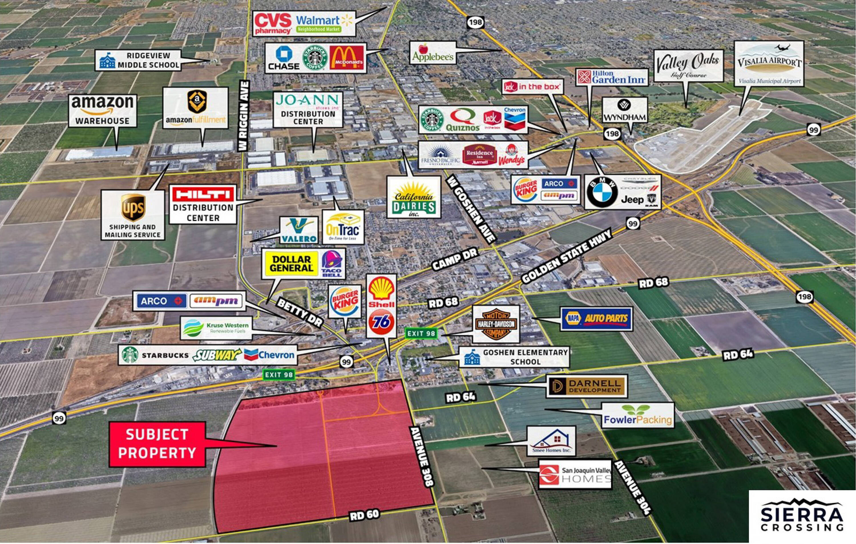 Available for sale are parcels ranging from approximately 0.97 to 45 acres of shovel-ready development land. The site is located adjacent to a new convenience store and fuel station. Utility improvements, including water, power, and gas, are in place, along with curb and gutter. The property benefits from nearby access to Betty Drive and convenient access to State Highway 99. Acreage is available for sale, with the potential for ground leases on individual parcels, and seller financing is an option. There is also an option for the owner to build retail buildings ranging from 2,500 to 30,000 square feet for lease. This property offers a development opportunity with centrality to the market, high exposure, and easy access. Situated at the northwest corner of Betty Drive and State Highway 99 in northwest Visalia, California, the location provides high visibility and easy access to Highway 99, connecting to Fresno, Clovis, Tulare, Hanford, Madera, and Fowler. The flexible zoning allows for various commercial uses. Betty Drive, a full interchange Highway 99 overpass, serves as a convenient stop for travelers and commuters heading to destinations such as Yosemite National Park, San Francisco, Sacramento, Santa Cruz, Monterey, Pismo Beach, Santa Barbara, and Los Angeles. Potential uses include a big-box site, fast food, hotel, supermarket shopping center, medical offices, lodging, restaurant, freeway-oriented hotel, and vehicle sales. Parcels are offered for sale, ground lease, lease with option, and seller-carry. The location at the full interchange features both north and south bound loop on and off-ramps, with traffic counts of approximately 163,722 cars per day in the area; CA-99: 68,000 northbound and 63,000 southbound; 11,685 westbound and 21,037 eastbound.