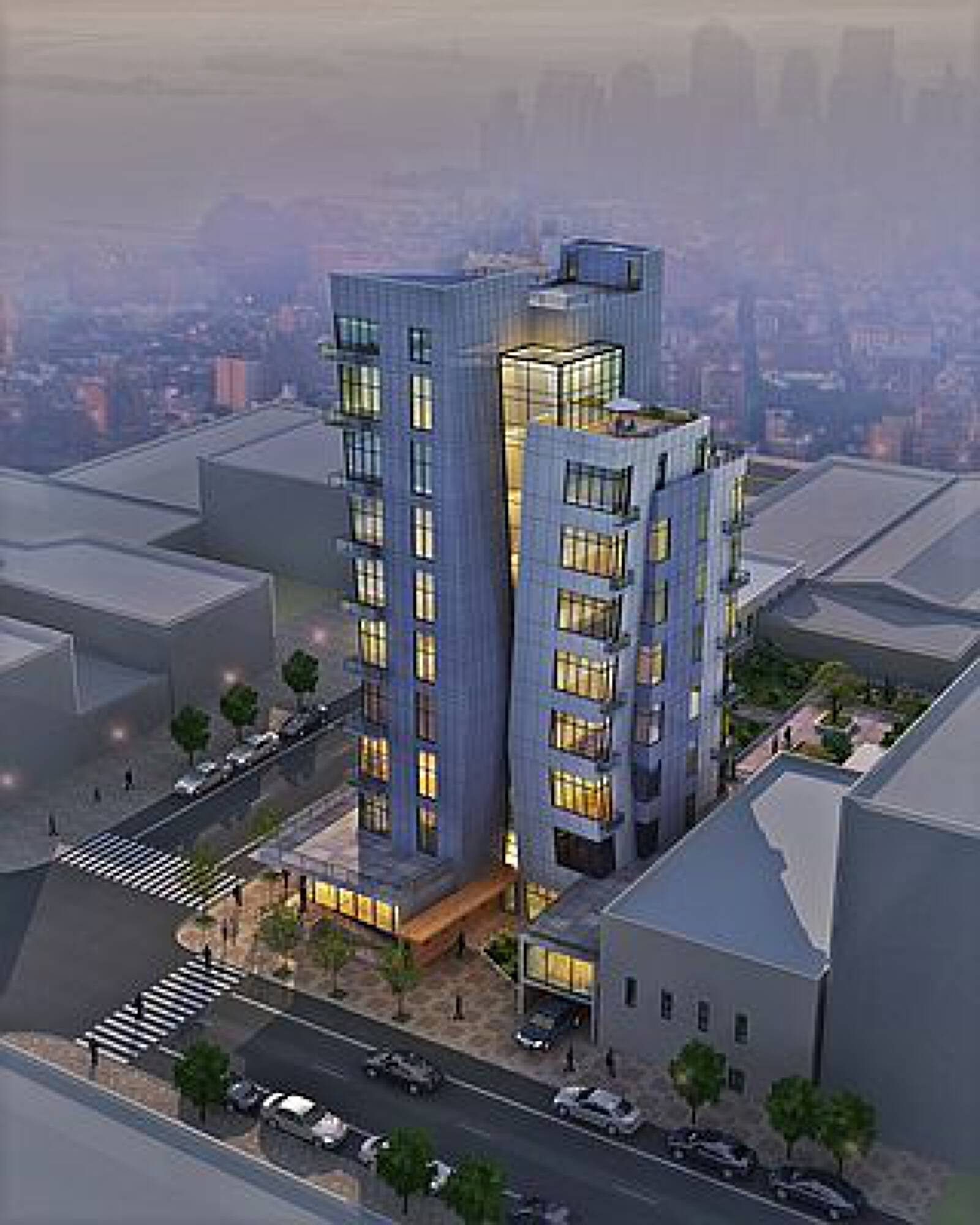 Ten-story mixed-use building featuring residential lofts and commercial space.