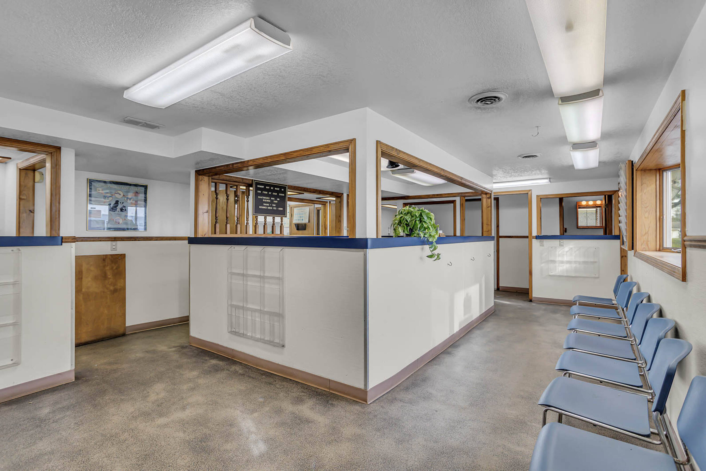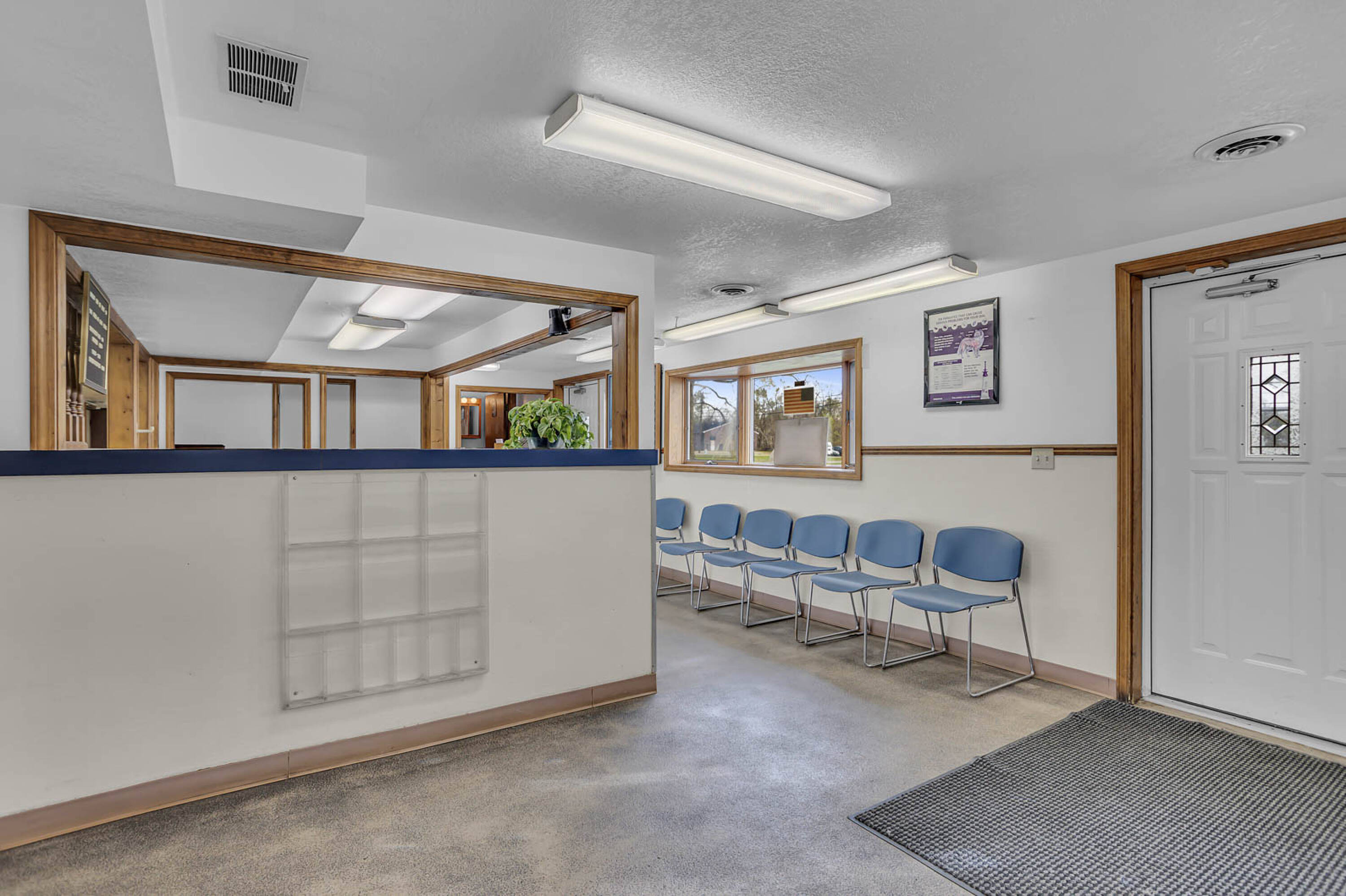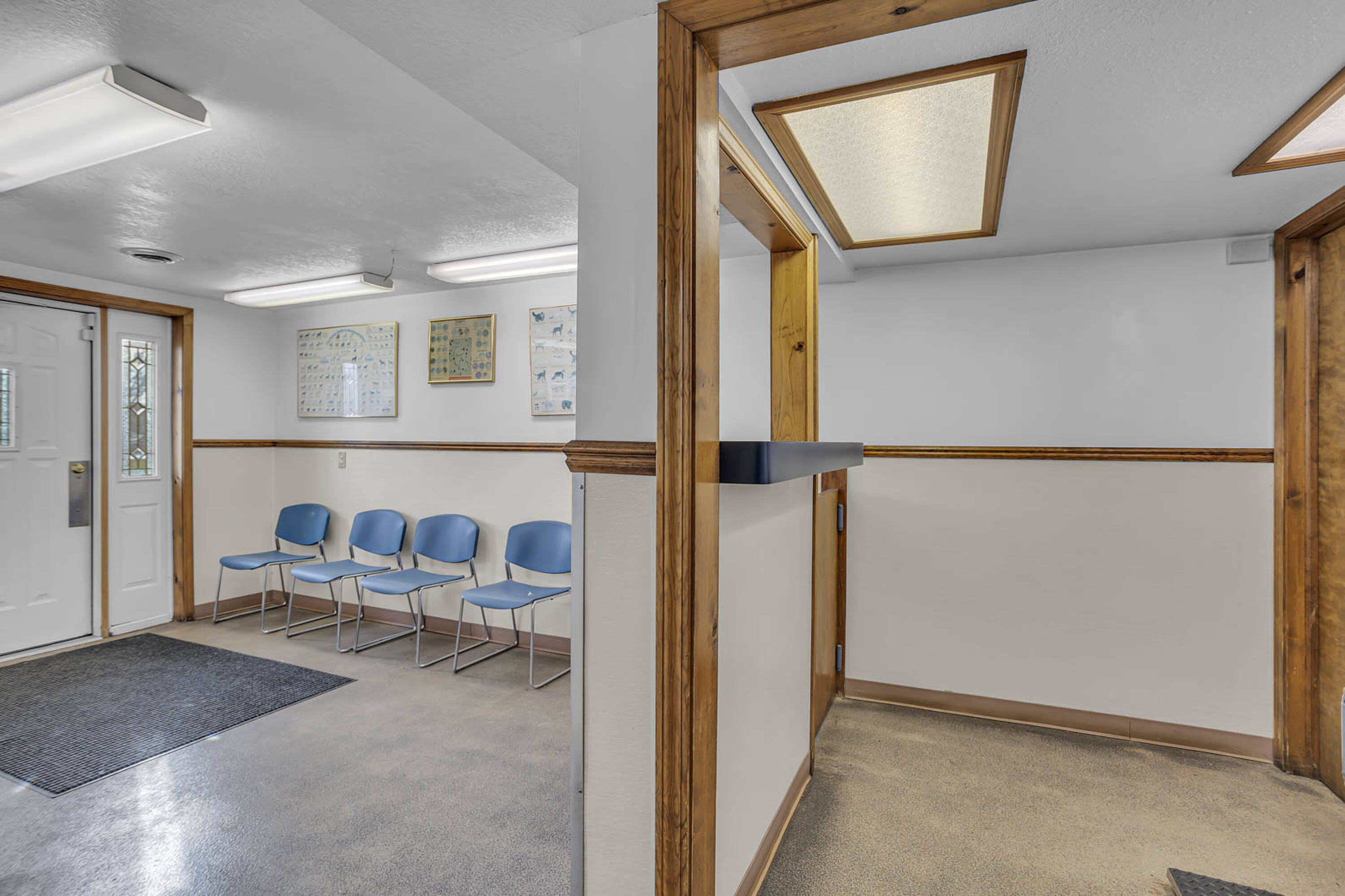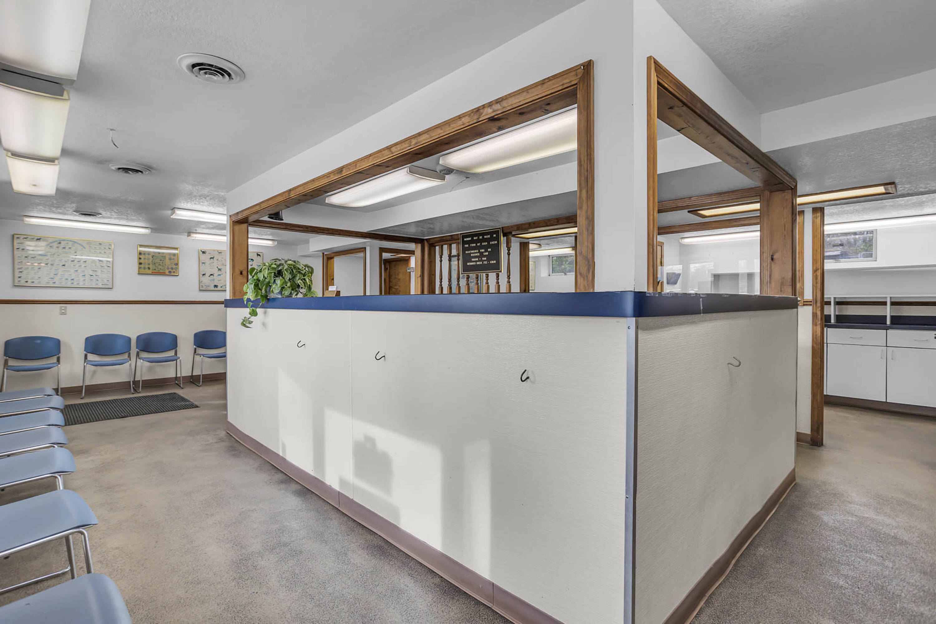 Long-standing veterinary hospital with living quarters and pole barn.