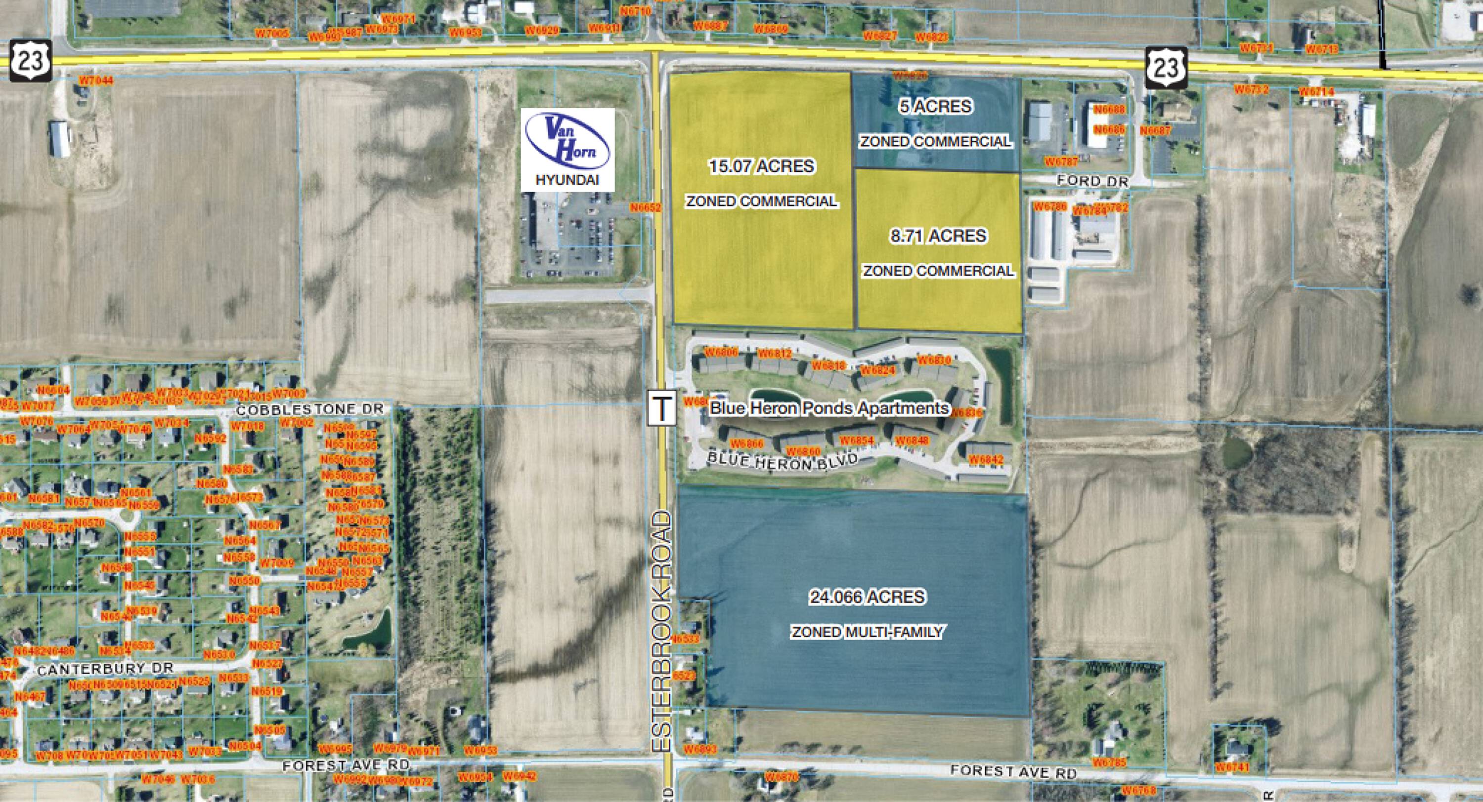 This property features: Prime location at the southeast intersection of Esterbrook Road and Highway 23 with excellent visibility.; Easy access to Interstate 41 (0.7 mile and approximately 1 mile to full interchange).; Versatile commercial land suitable for office, retail, industrial, residential, multi‑family, and storage units.