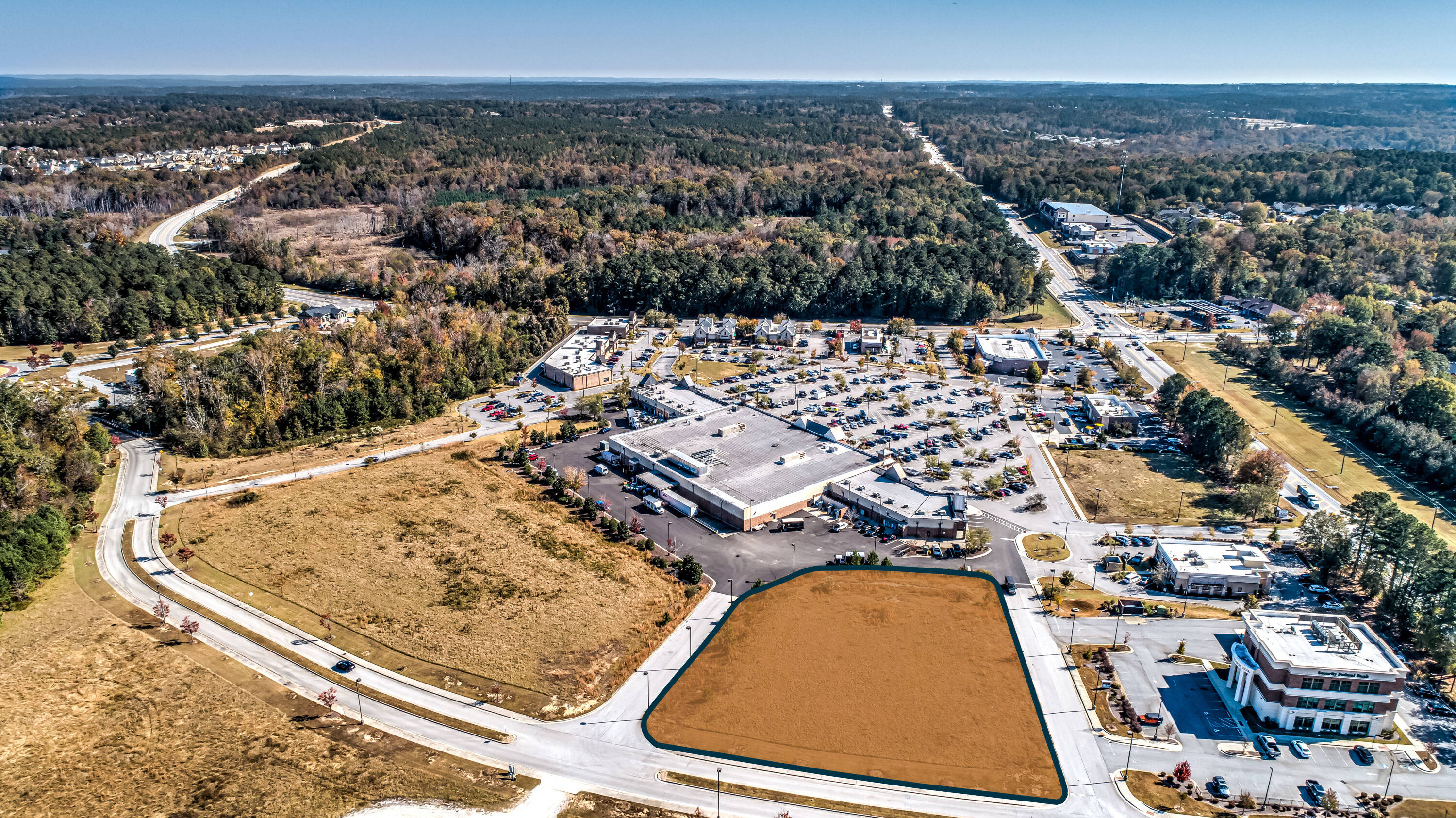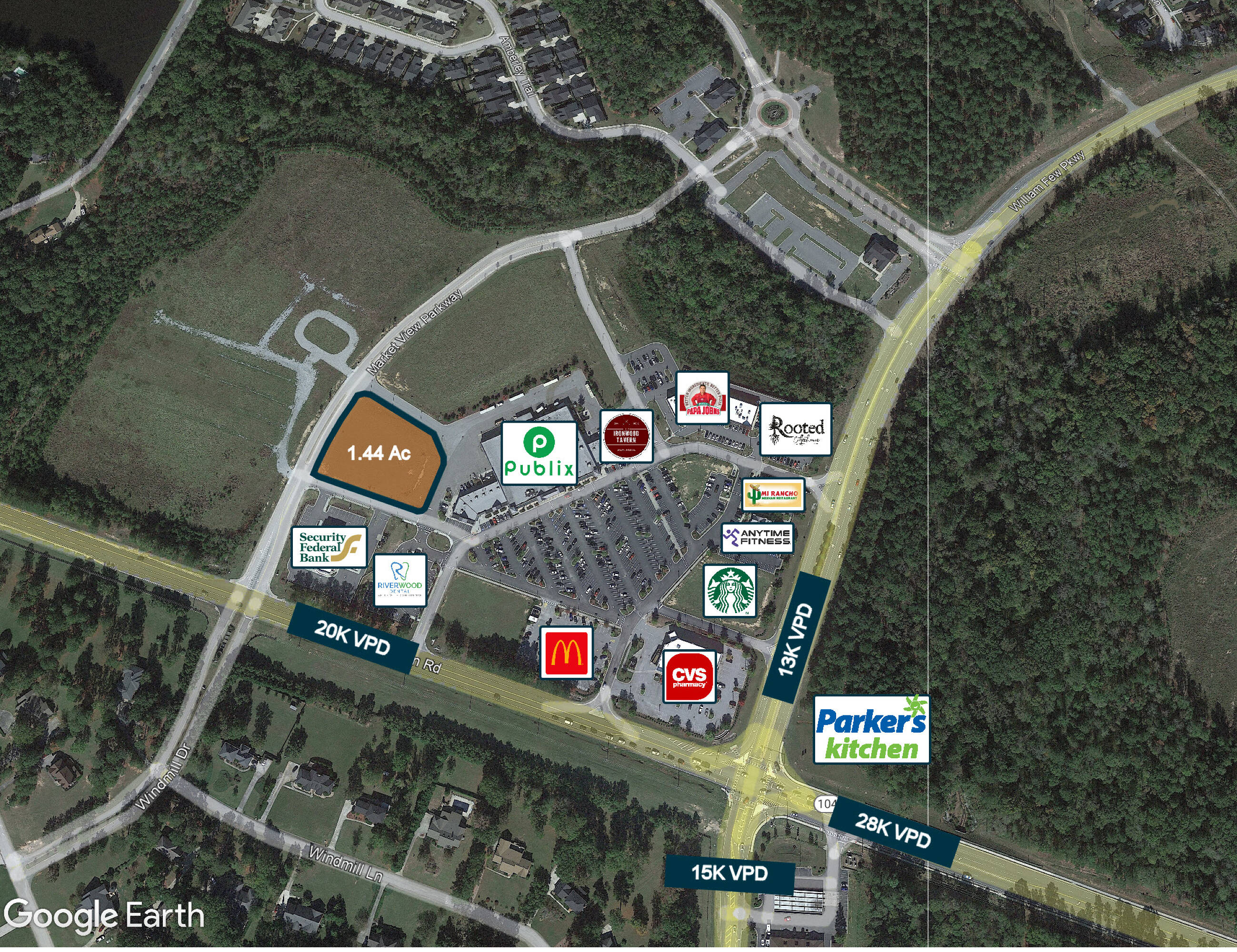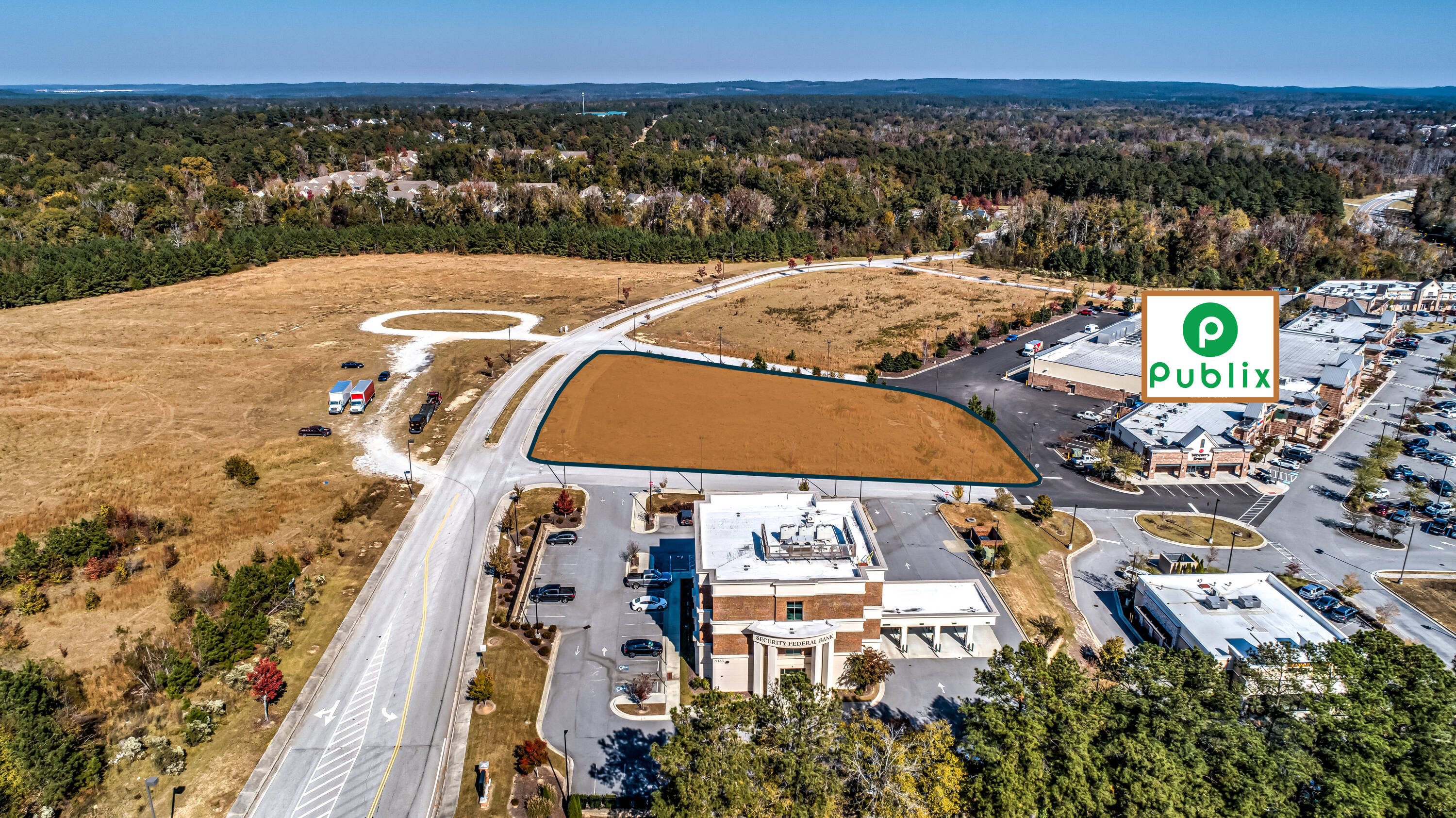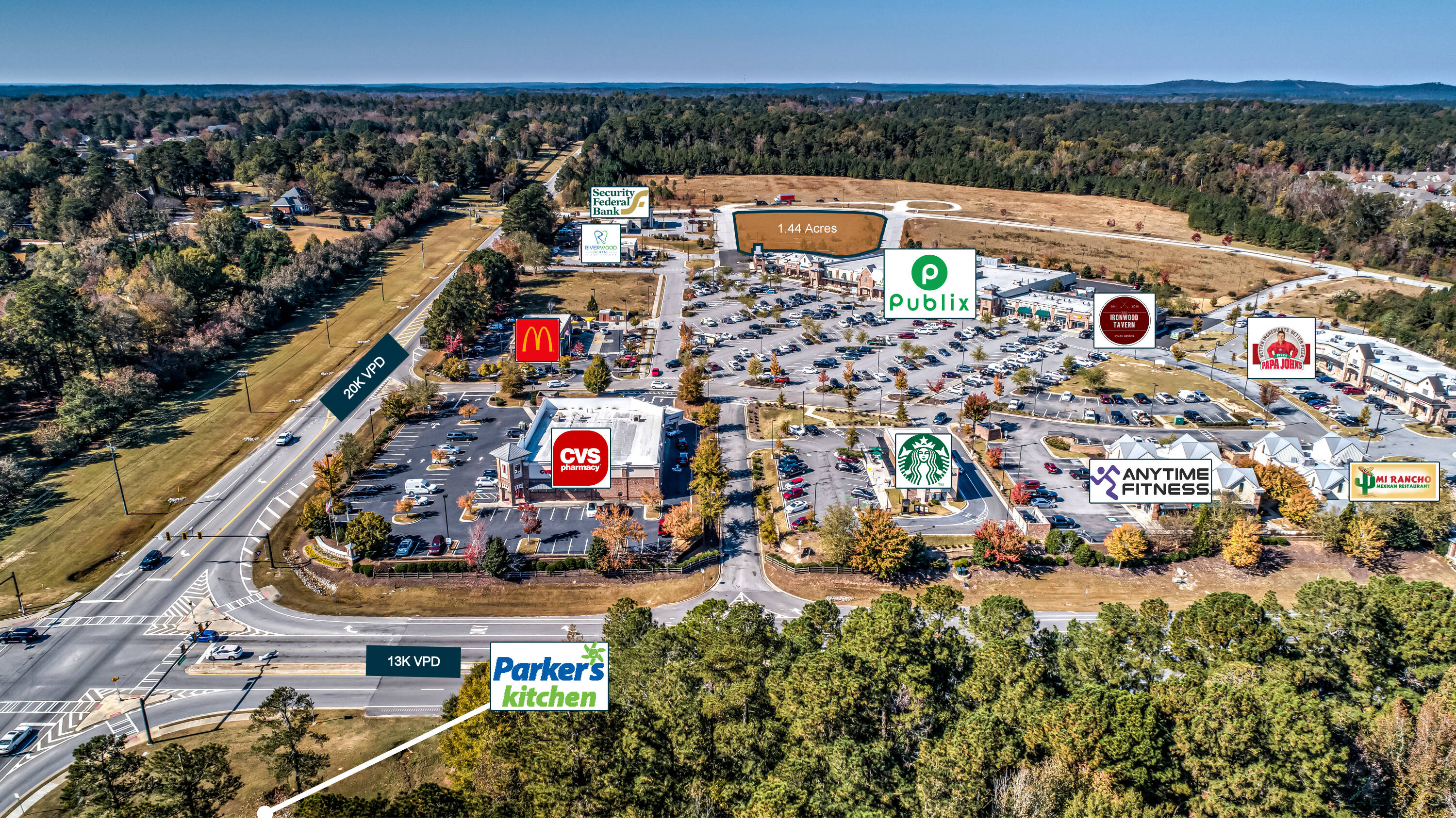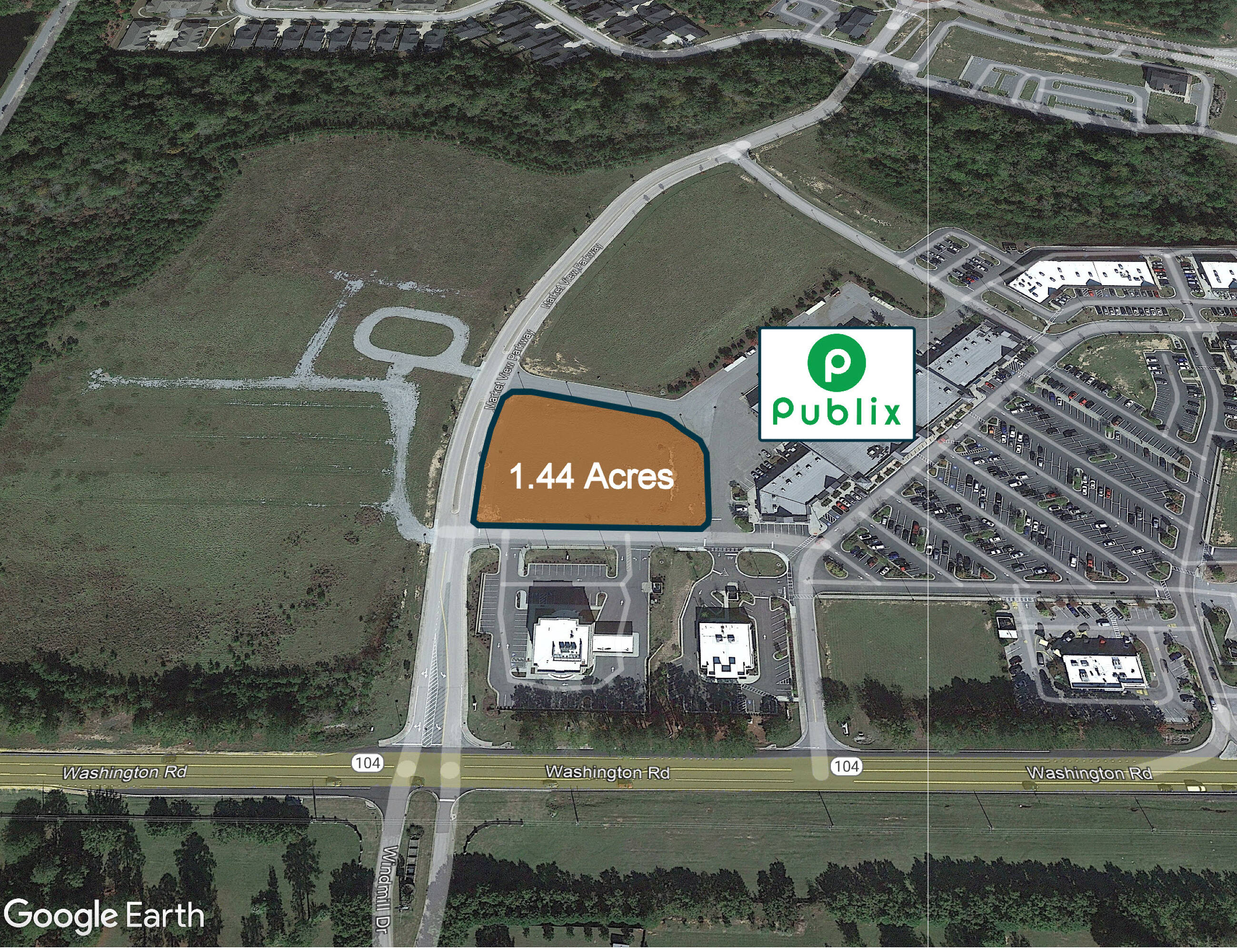 This 1.44-acre commercial land parcel is located in Evans, Georgia. Situated as a second-row retail pad within Riverwood Town Center and anchored by Publix, the location benefits from high visibility. The center attracts approximately 1.9 million annual visitors, placing it in the 89th percentile for neighborhood centers in the United States. The surrounding area has a median household income of $119,000 and a population of 23,000 within a 3-mile radius. Zoned PUD (Planned Urban Development), the property has utilities on site. It is suitable for a single-tenant retail development or a multi-tenant strip center. Riverwood Town Center includes tenants such as Publix, McDonald's, Starbucks, CVS, Parker’s Kitchen, and Papa Johns. Traffic counts are over 29,000 vehicles per day on Washington Rd and 15,000 vehicles per day on William Few Parkway. The property is located off Washington Rd and is adjacent to a high-performing Publix in an affluent area within the Central Savannah River Area (CSRA). The median household age and income within a 5-minute drive time are 37 years old and $120,390, respectively. The property is near Greenbrier High School, Middle School, and Elementary School, which have a combined 3,200 students. Washington Rd. serves as the main thoroughfare in Richmond and Columbia County. The property is 4 miles from the nearest shopping center and retail node.