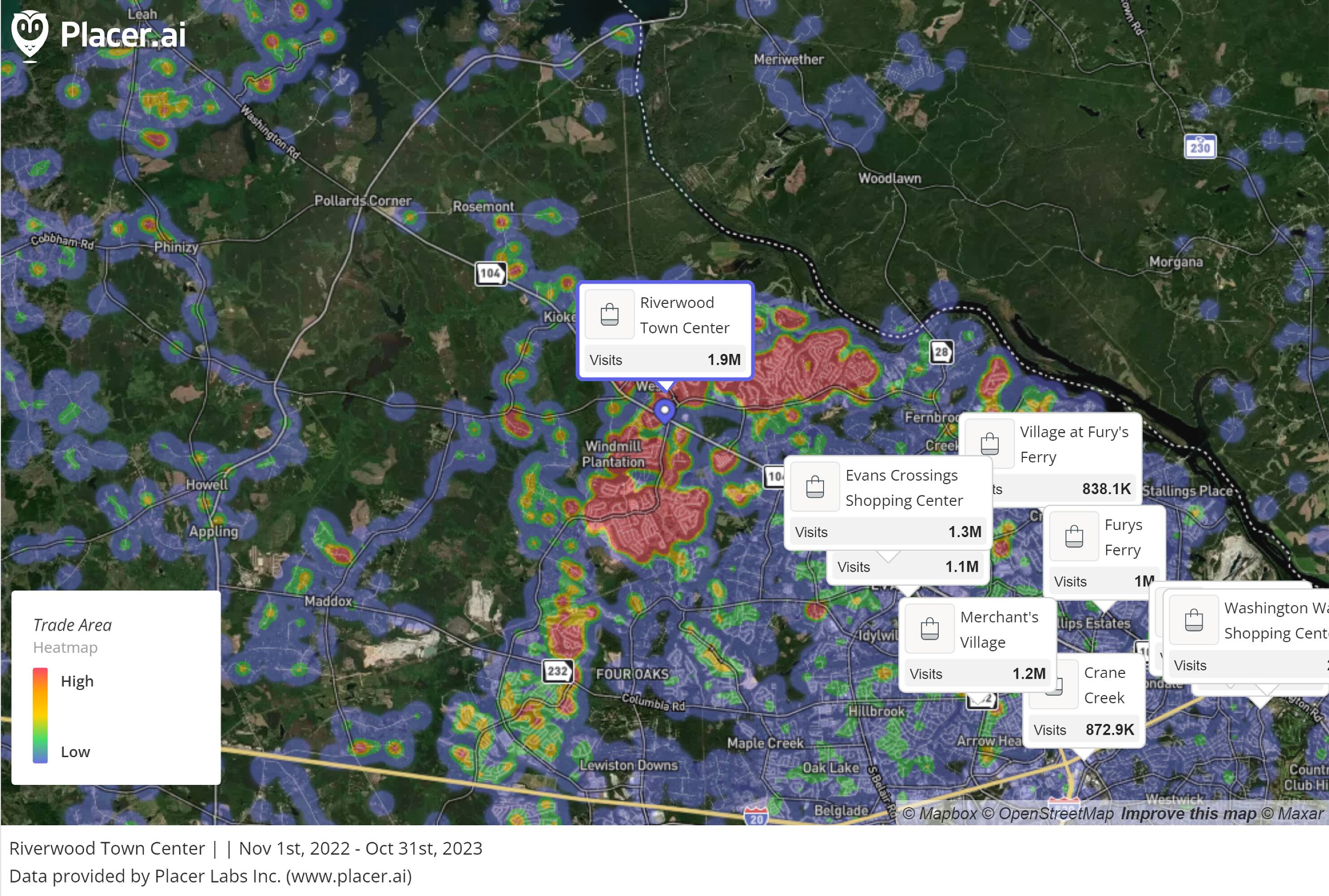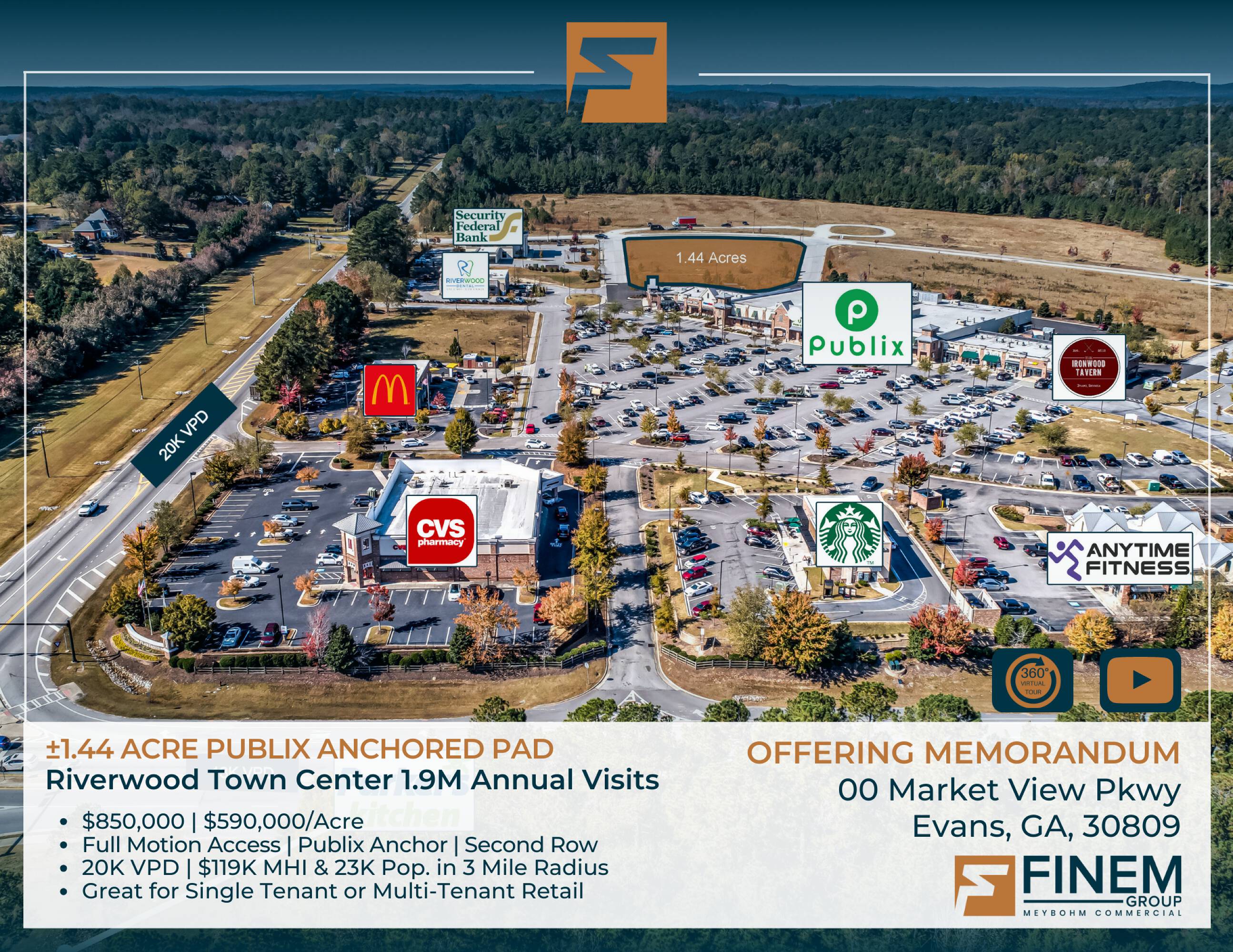 This property features: Anchored by Publix in Riverwood Town Center, attracting 1.9 Million annual visitors.; Exceptional demographics with $119K Median HHI within a 3‑mile radius.; Prime location in Evans, GA, in one of the most affluent areas.
