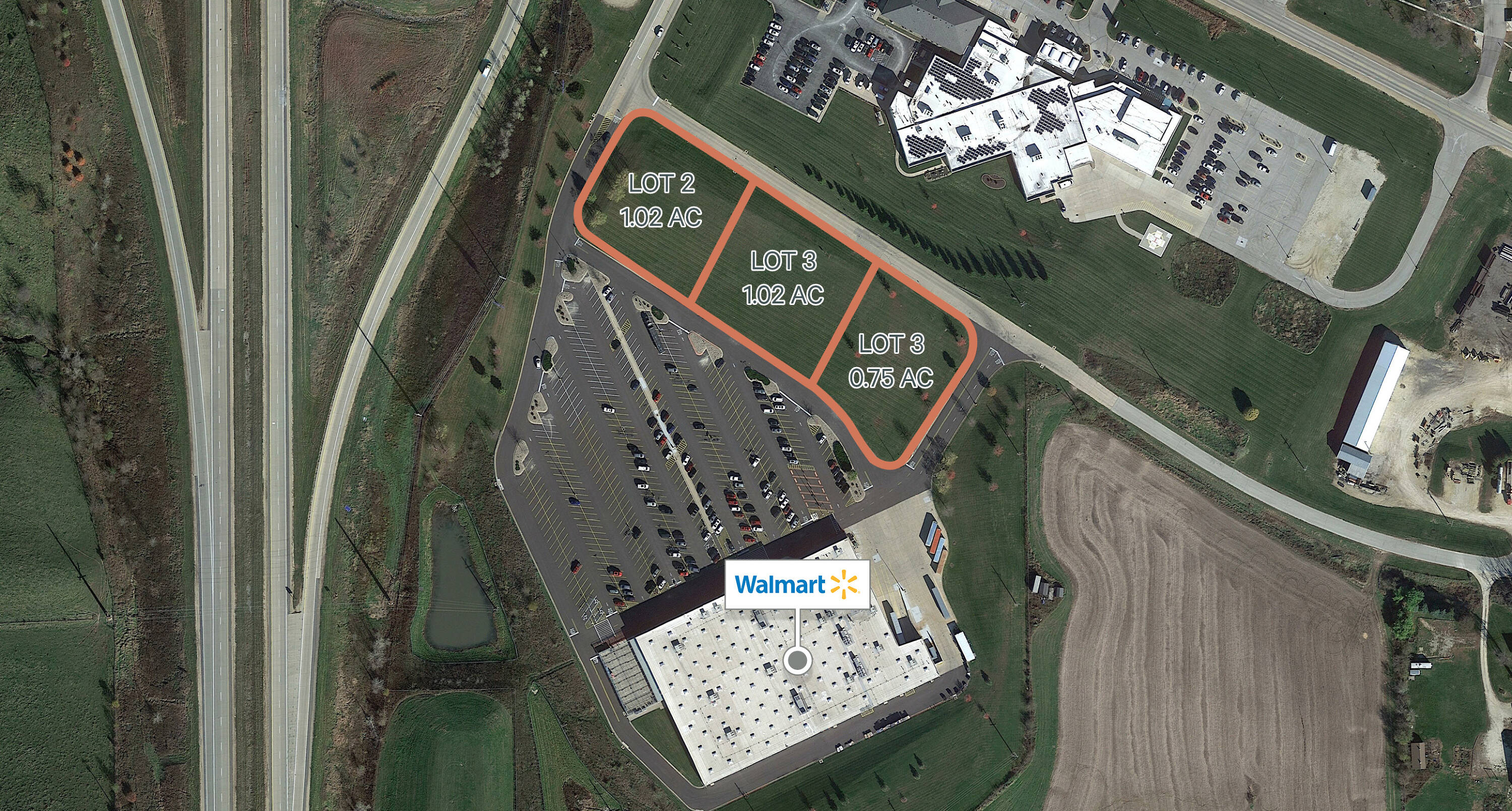 Three parcels of land are available, sized at 1.02 acres, 1.02 acres, and 0.75 acres. These outlots are located near a Walmart.