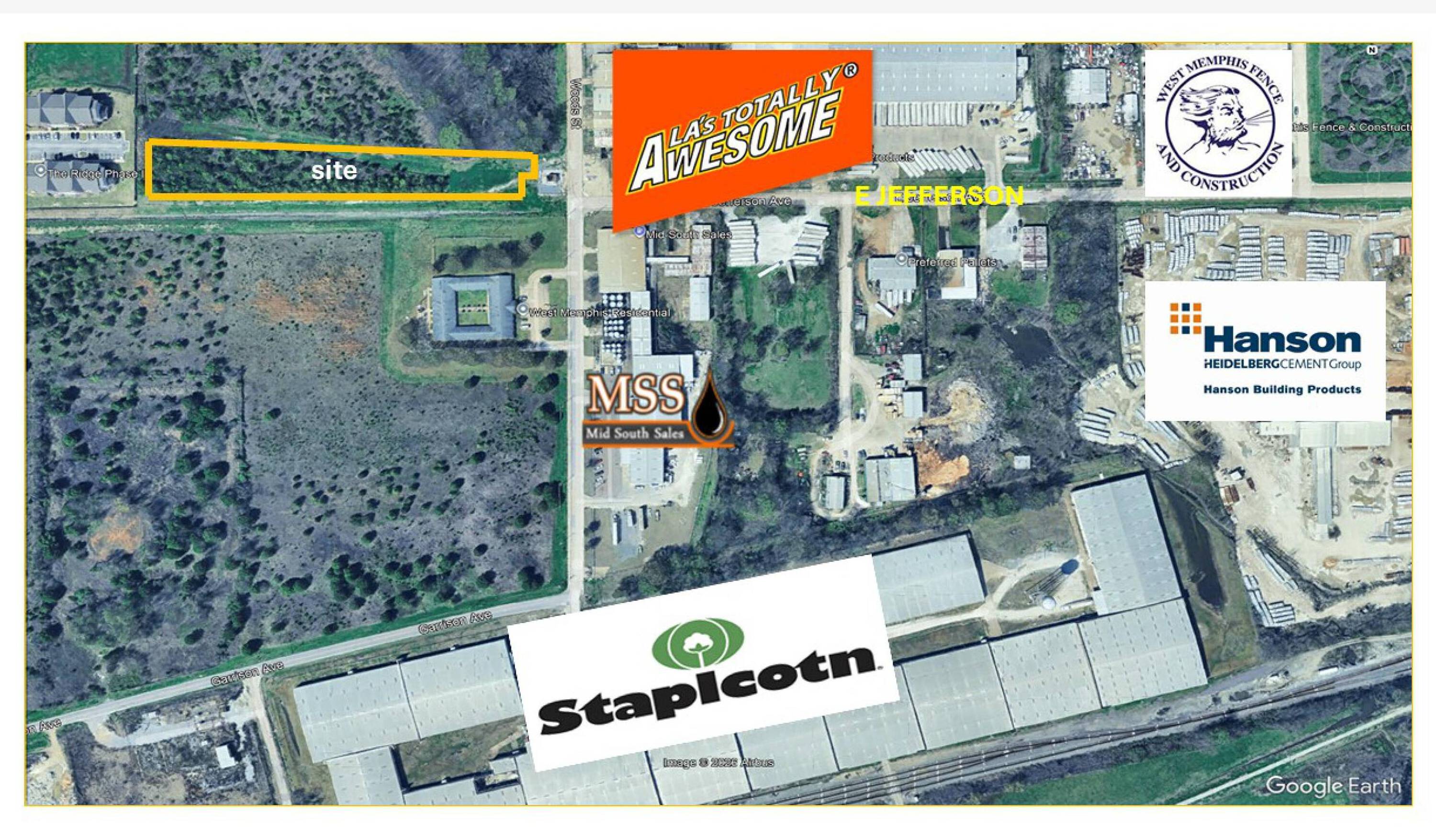 Available for sale is an approximately 8.69-acre vacant commercial land parcel situated at the corner of South Woods Street and East Jefferson Street in West Memphis, Arkansas, just across the bridge from Memphis, Tennessee. The property is suitable for commercial and industrial uses. Neighboring businesses include Staplcotn, Awesome Products, Hanson, and Union Compress.