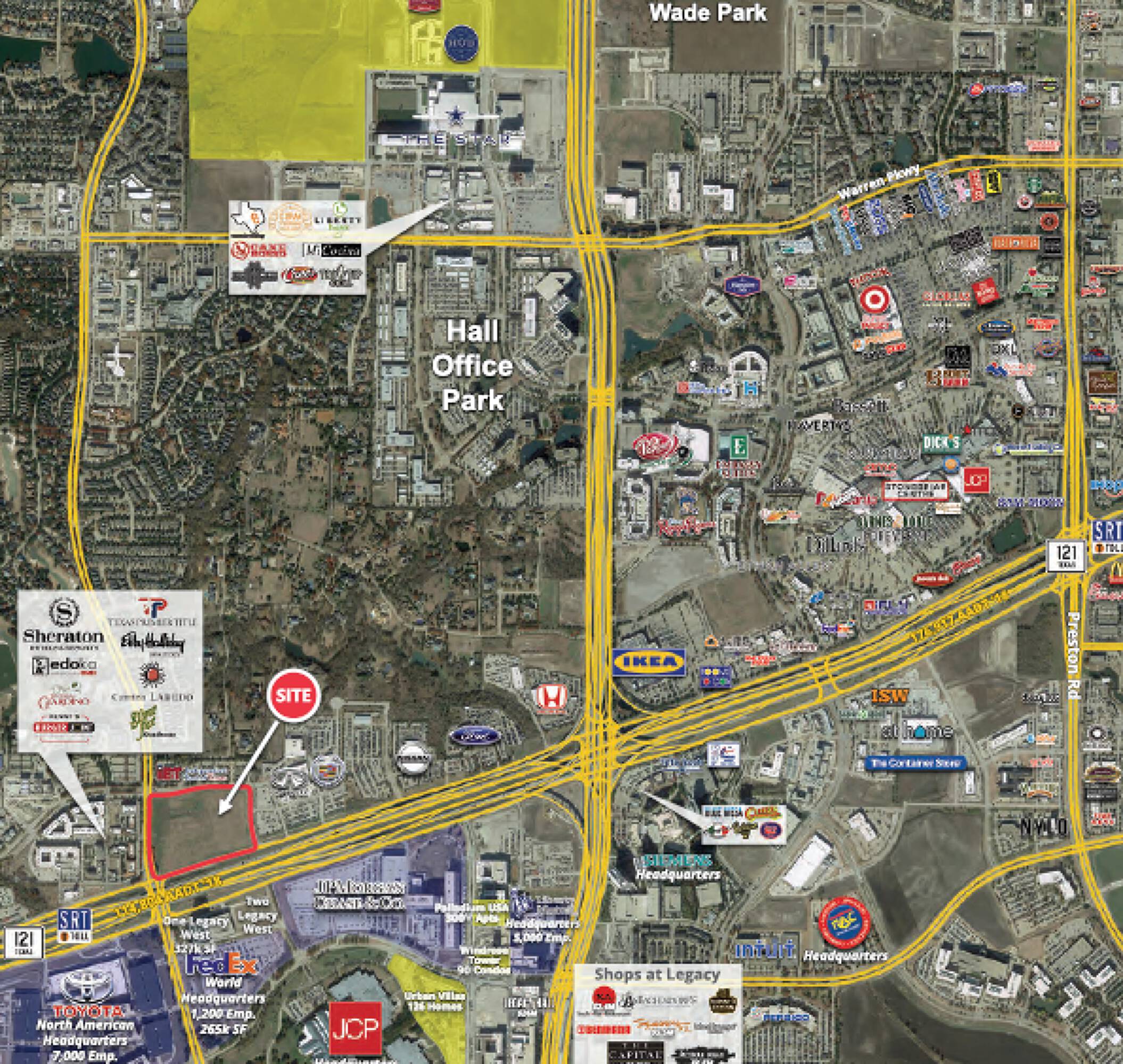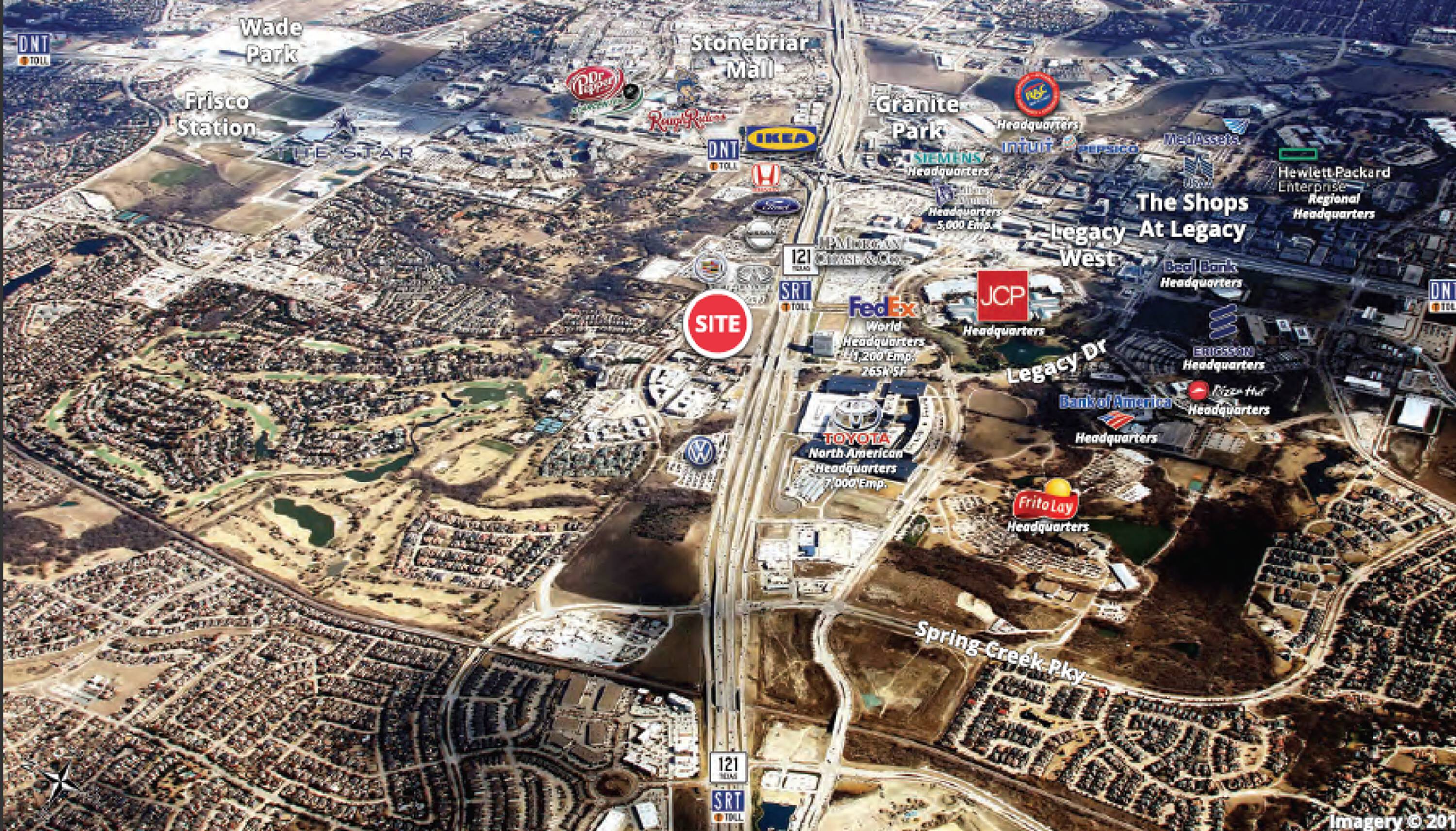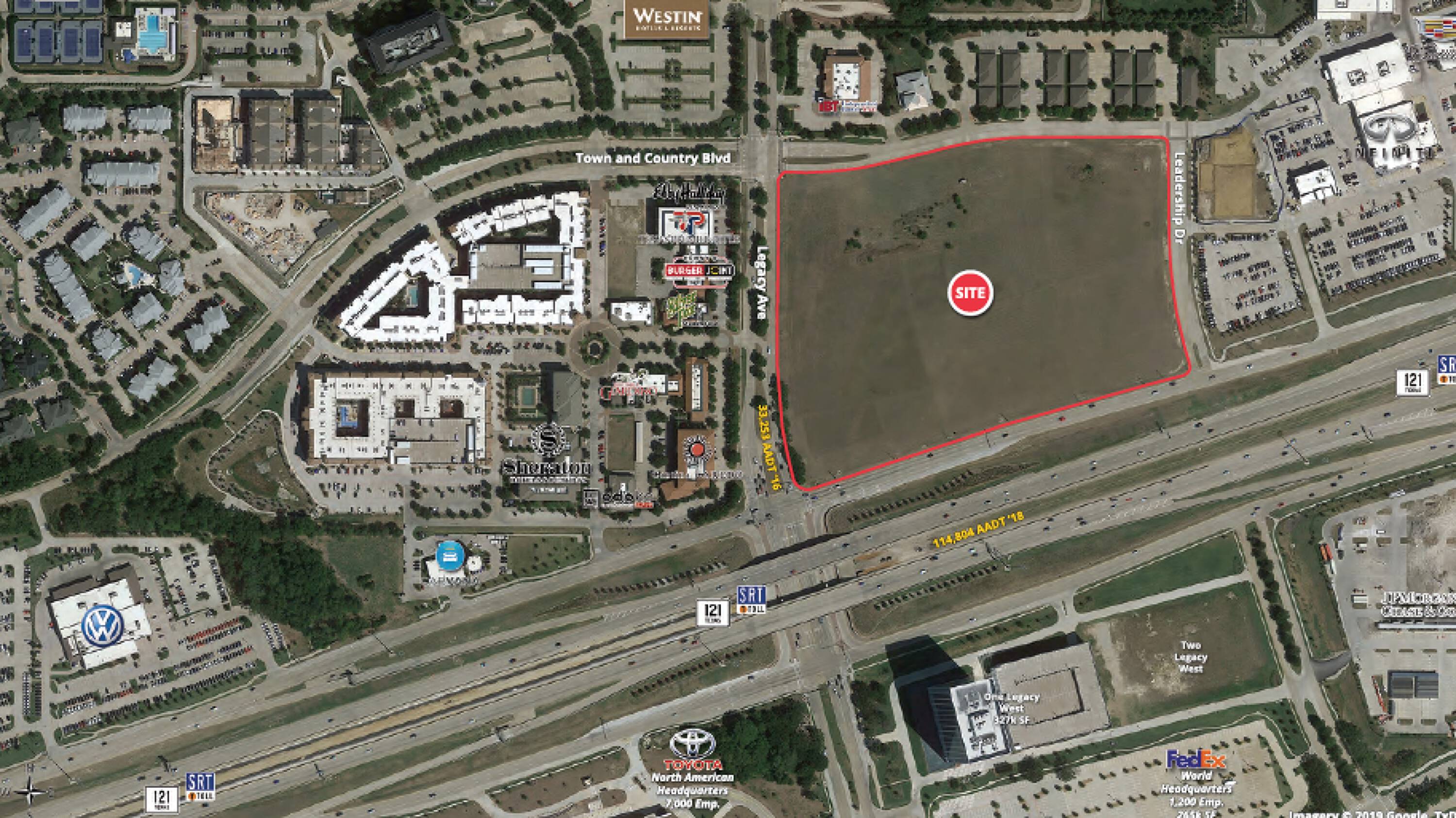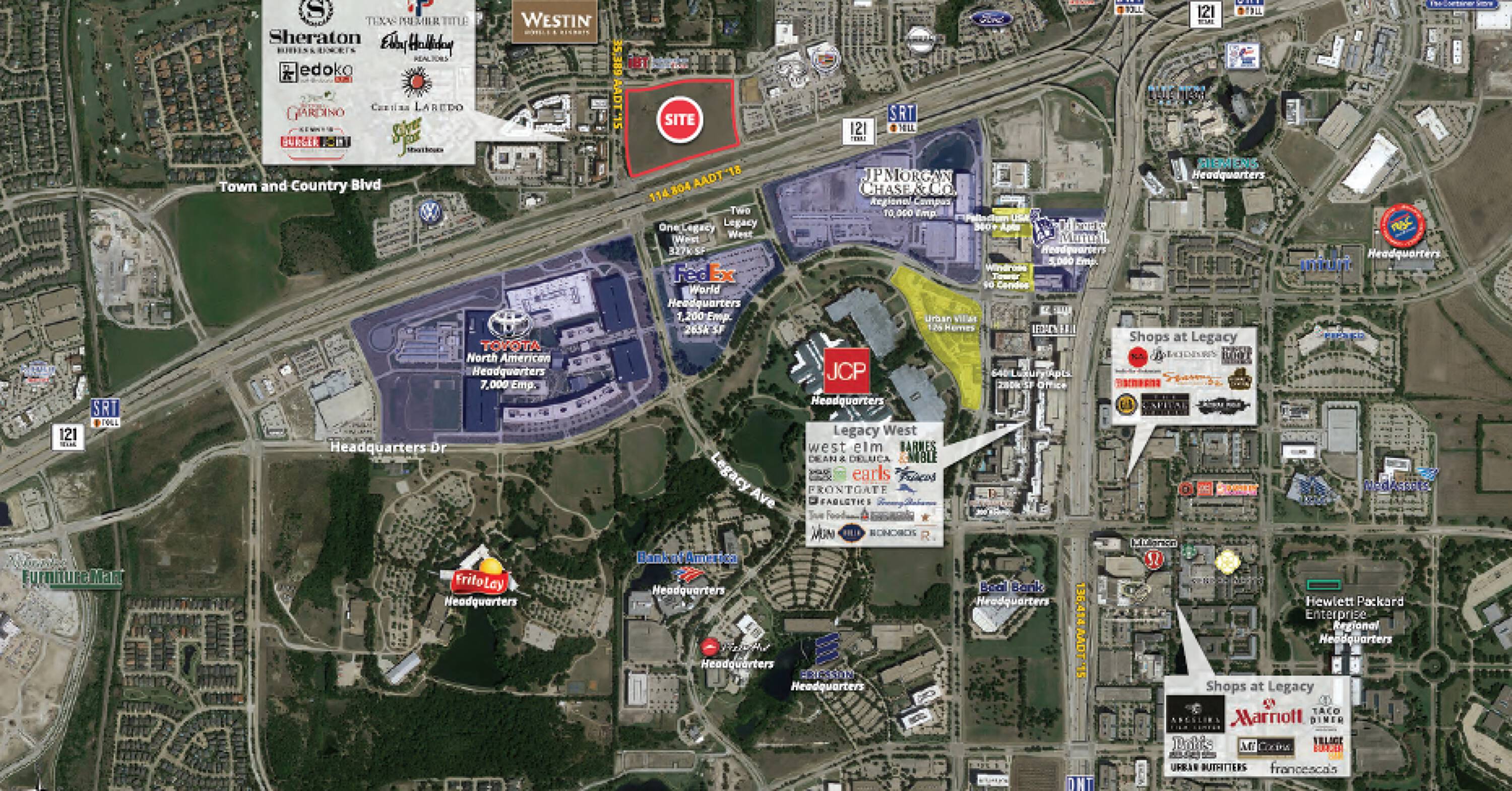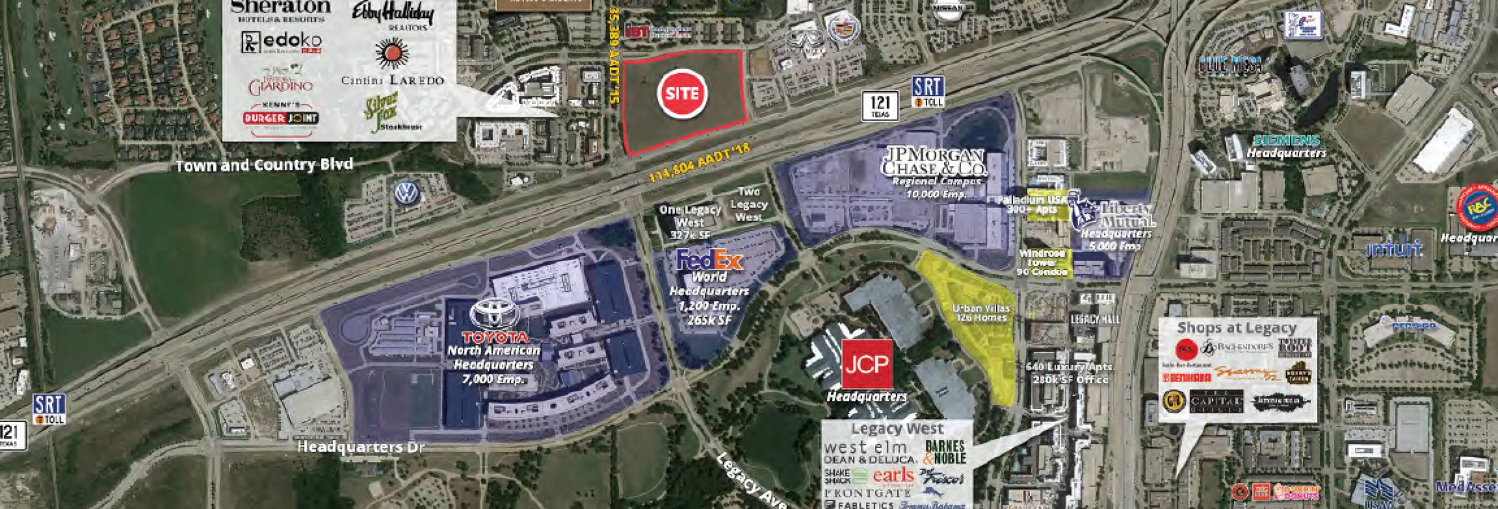 This commercial land opportunity is situated near the Toyota North American Headquarters, JPMorgan Chase & Co, FedEX World Headquarters, Liberty Mutual Headquarters, JCPenney, Frito-Lay, Pizza Hut, and Ericsson. The location also offers proximity to retailers at Legacy West, including Del Frisco's Double Eagle Steak House, Mesero, Shake Shack, West Elm, Frontgate, Earls, Bonobos, True Food Kitchen, Fogo de Chao, SuitSupply, and Tommy Bahama.