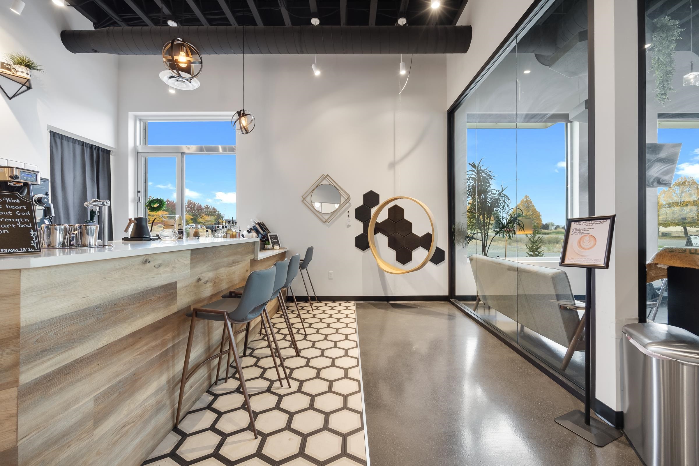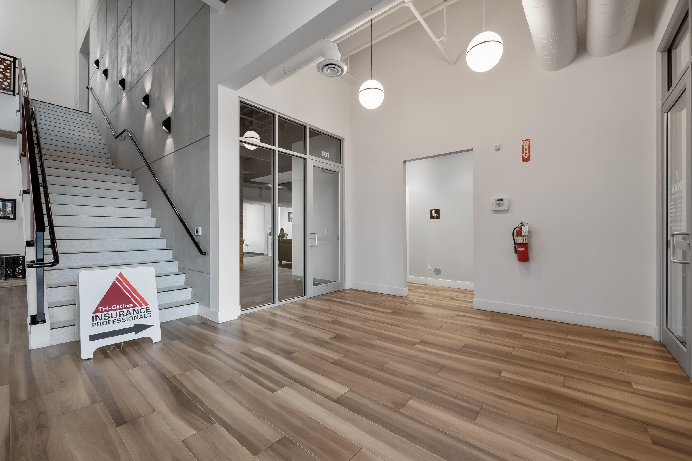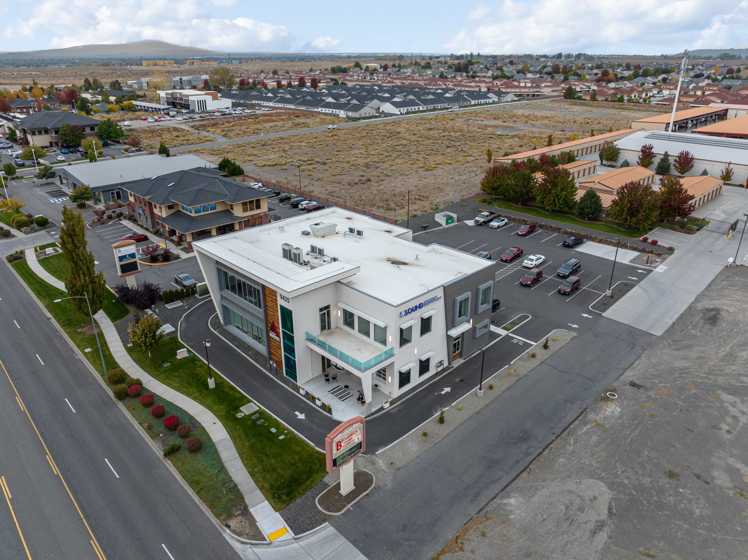 This Class A property, constructed in 2021, is located in the business hub of West Pasco, near Sandifur Parkway and Broadmoor Road. The available upstairs floorplan offers 4,441 rentable square feet of space. The layout includes five offices, two restrooms, and an open area, with provisions for a kitchenette. An elevator provides direct access to the space. Expansive windows provide natural light. The ground floor is occupied by established businesses, including insurance, audiology, and a café.