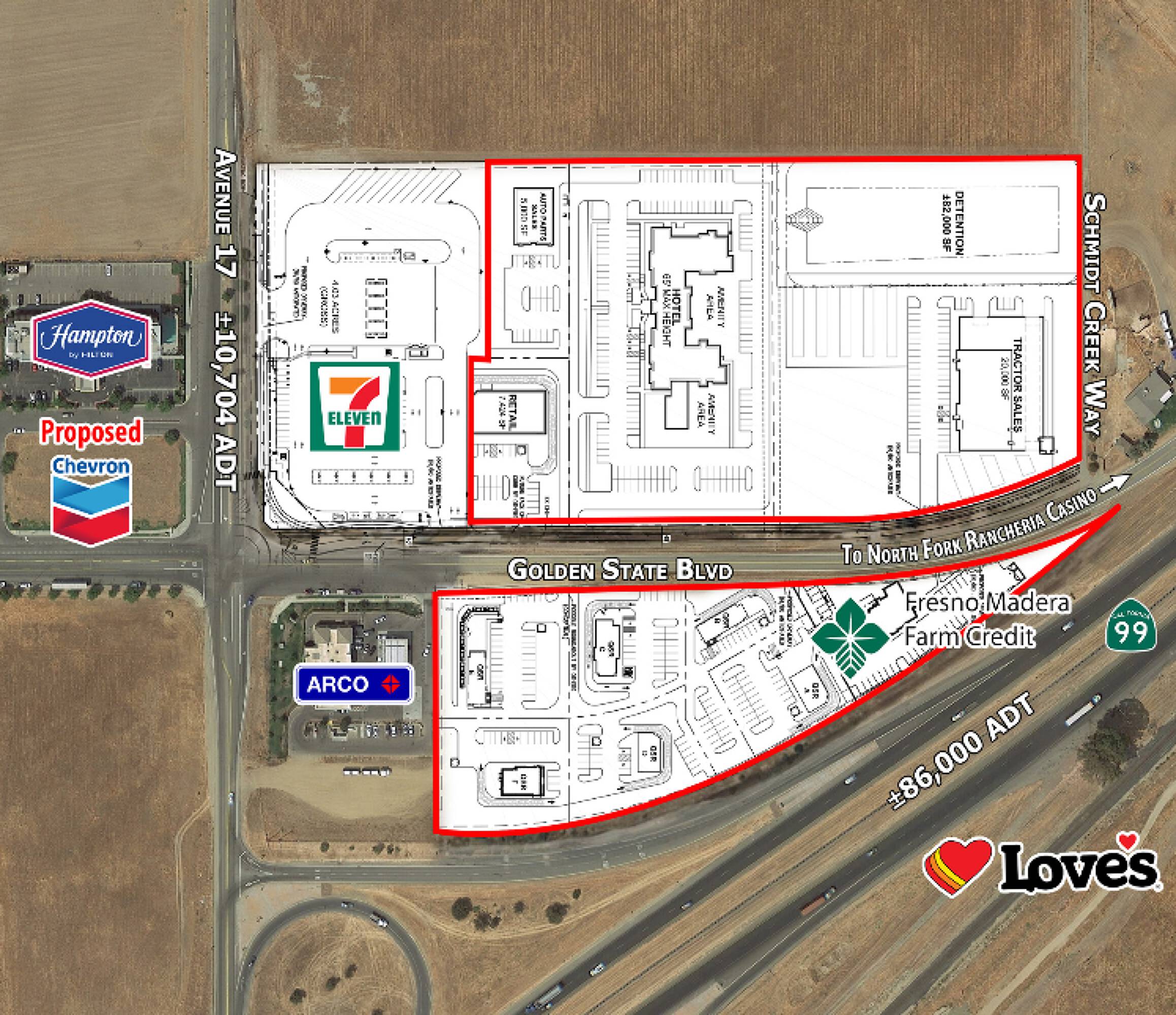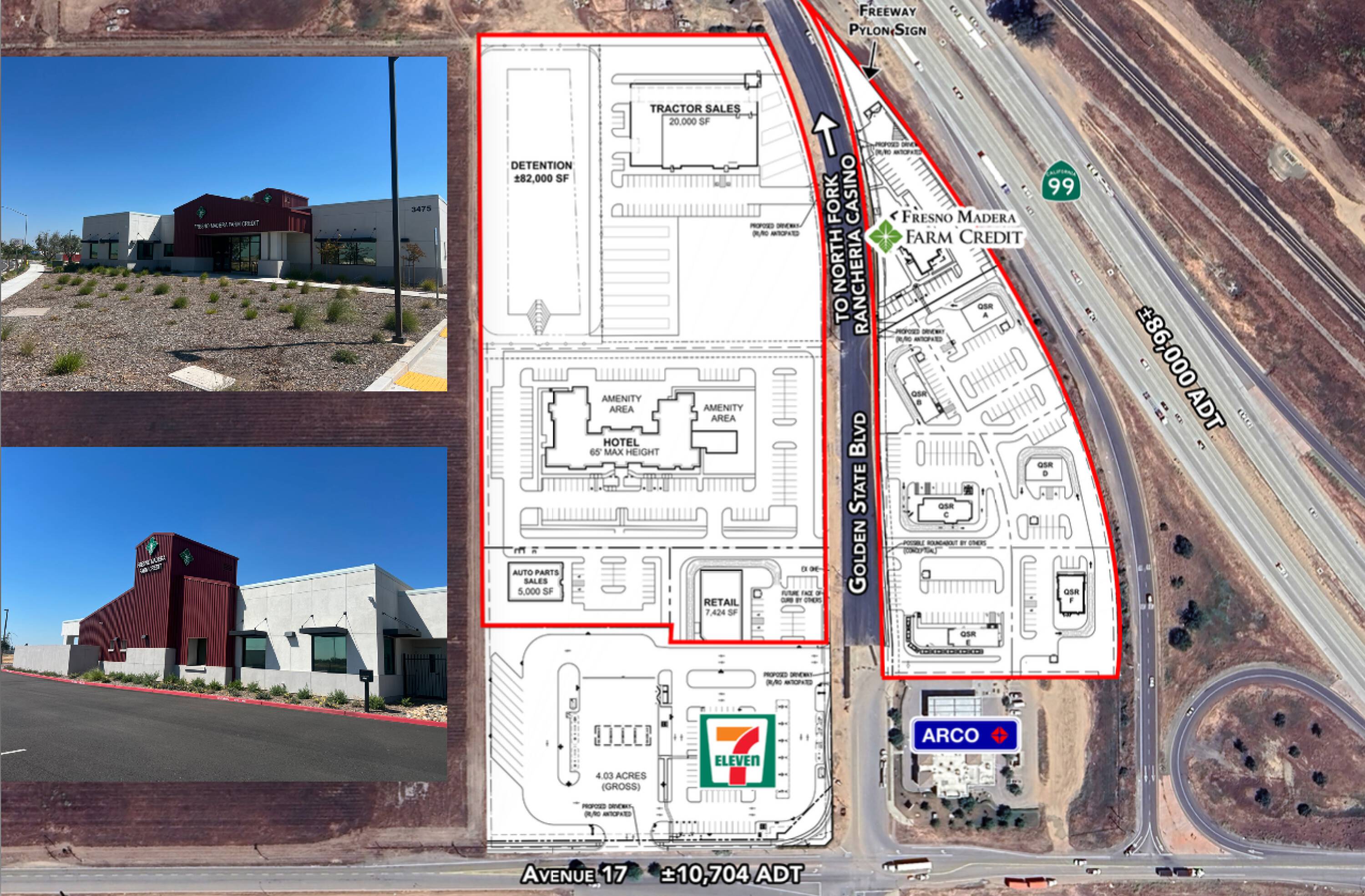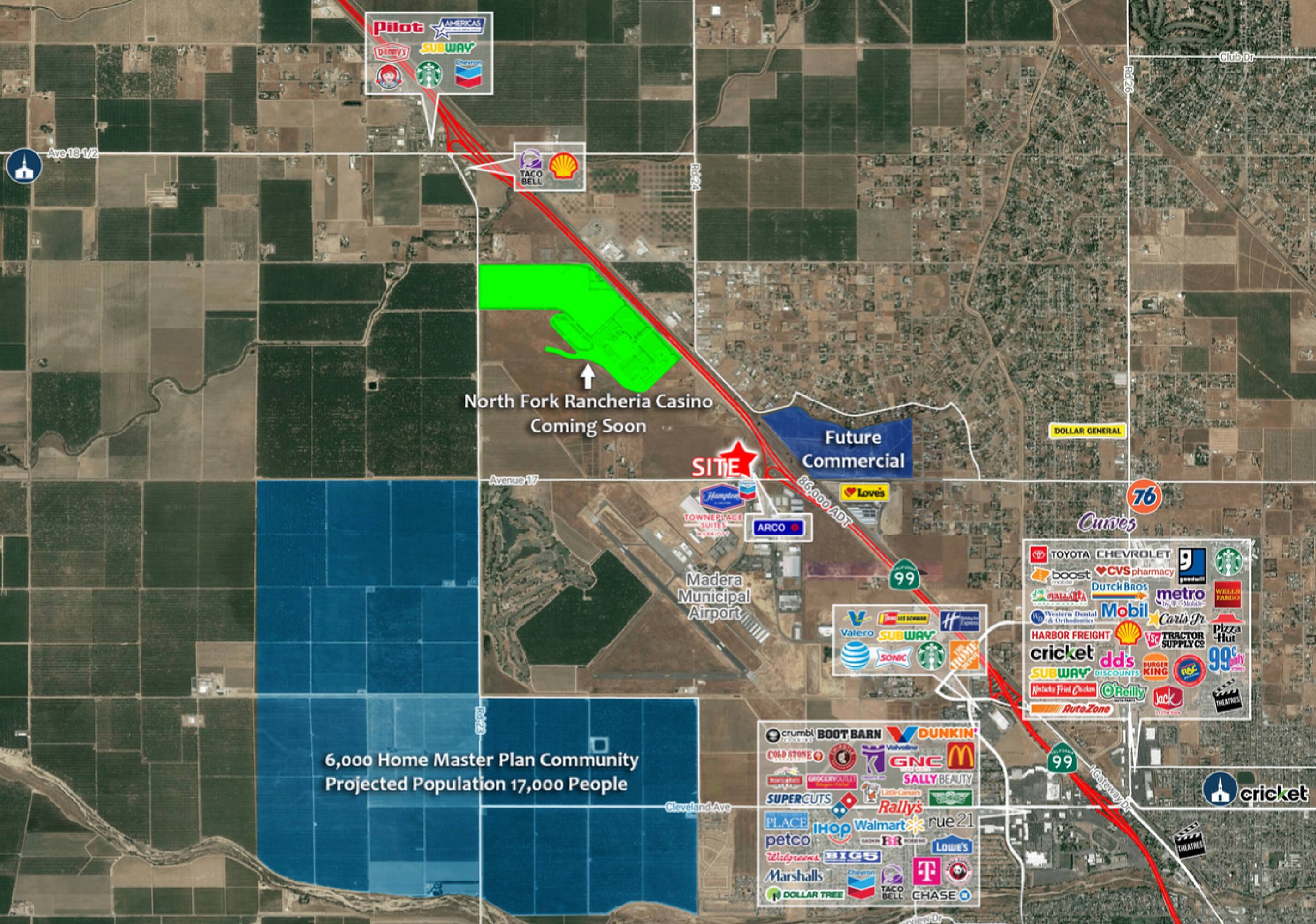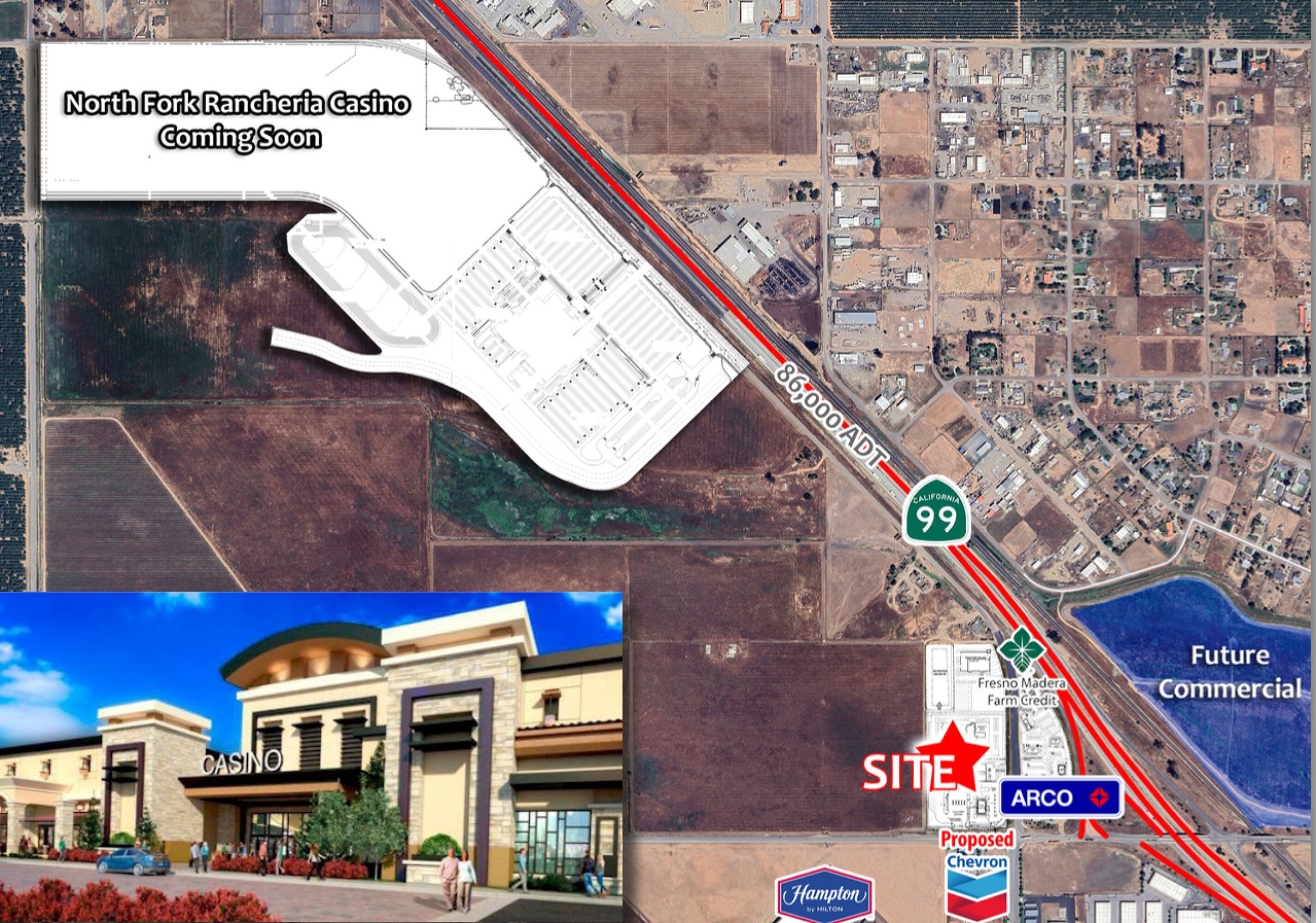 This commercial land is located in a highly traveled freeway location and features a large freeway pylon sign. It is situated at the main off-ramp to the proposed North Fork Rancheria Casino, which is planned to open in the Summer of 2026 with approximately 185,000 square feet. Hotel pads and Quick Service Restaurant (QSR) pads are available. Traffic counts indicate approximately 86,000 Average Daily Traffic (ADT) on Highway 99 and approximately 11,000 ADT on Avenue 17.