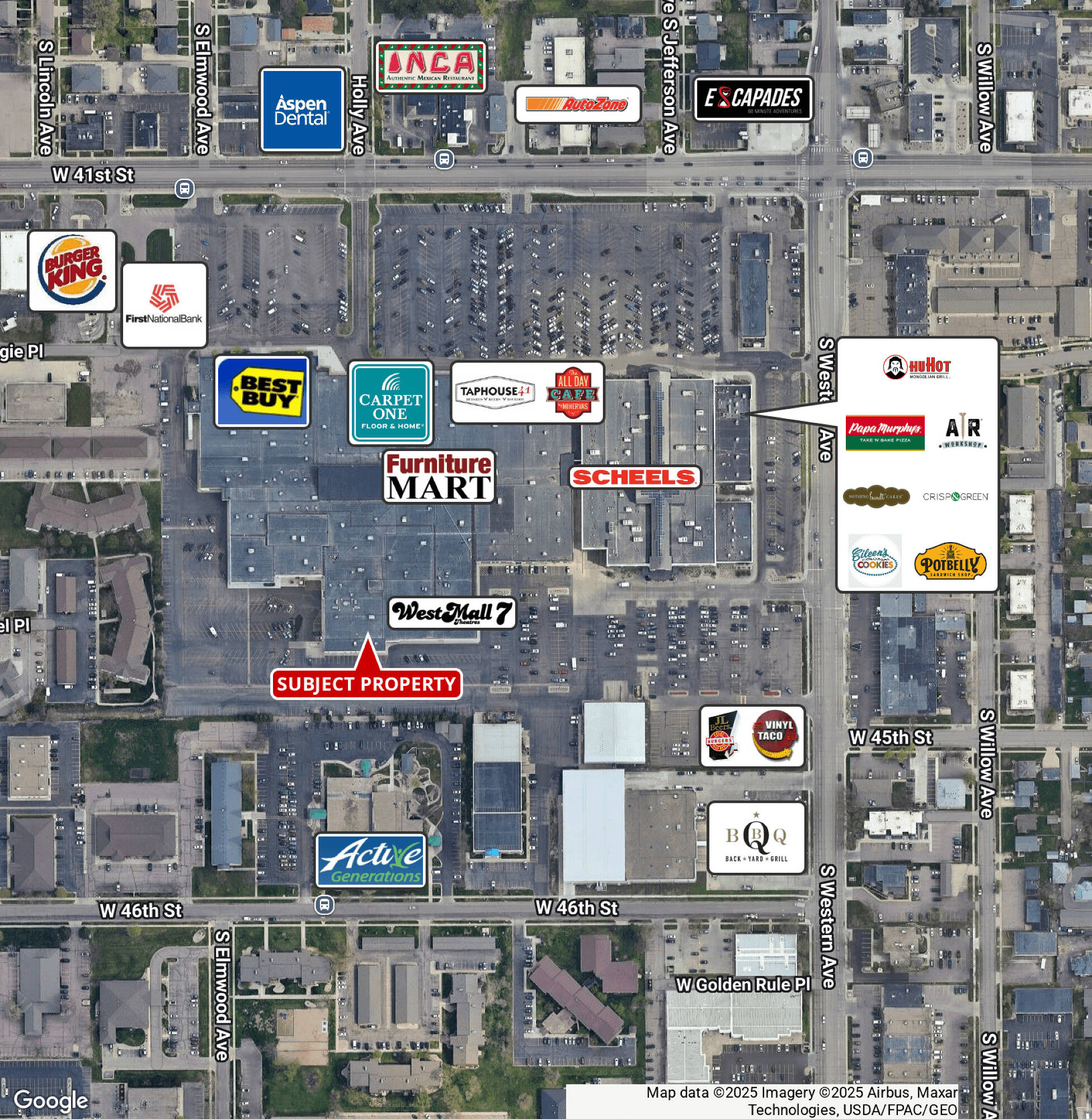 This retail and office space is available for immediate, long-term sublease. The prime lease expires on March 31, 2034, and the property is leased as-is. The open work area features a ceiling height of 18.78 feet, while the offices and data center have a ceiling height of 10 feet. The suite includes an exterior entrance and in-suite restrooms, along with an 8’ x 8’ garage door for loading and unloading. The entire suite is equipped with a sprinkler system. NNN expenses are $4.72. The property is located on the west side of the Western Mall, with co-tenants including Best Buy, All Day Cafe, Taphouse 41, Scheels, West Mall 7 Theaters, The Furniture Mart, Carpet One of Sioux Falls, Potbelly, HuHot Mongolian Grill, 605 Ninja, and Lucky Kruser's Casino. The location benefits from high traffic counts, with 22,000 vehicles per day on Western Avenue and 19,200 vehicles per day on 41st Street.