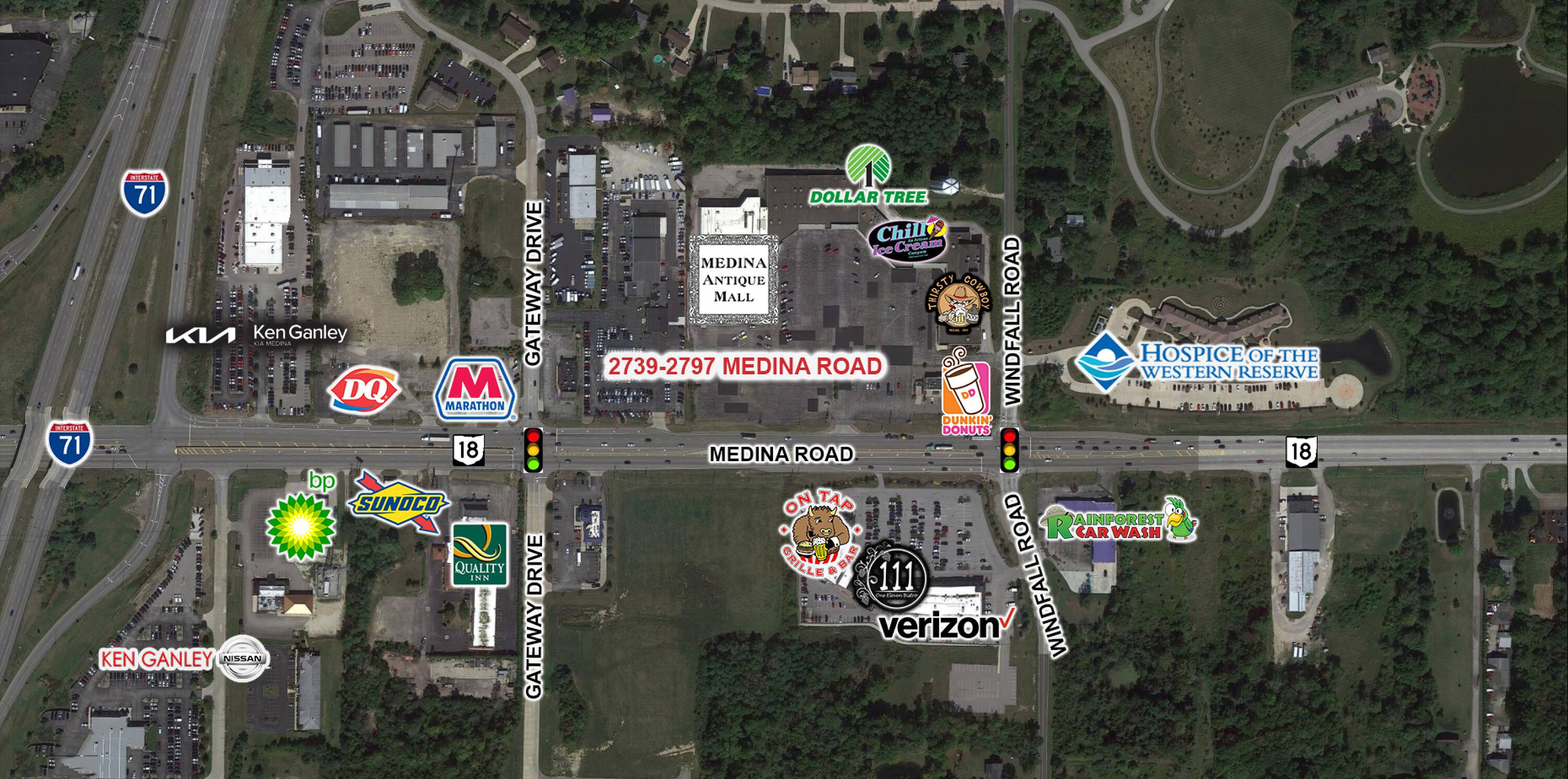 Plaza-71 is a multi-tenant neighborhood center featuring a mix of retail and office spaces. The property is situated just east of I-71, benefiting from a total daily traffic count of 33,024. It features 800 feet of frontage at the corner of SR-18 and Windfall Road. Available suites include several small retail spaces ranging from 1,600 to 2,266 square feet, an adjacent 2,000-square-foot warehouse, and 4,628 square feet of second-floor office space that includes 9 private offices. The property is located in Medina Township at the corner of Medina Road (SR-18) and Windfall Road, approximately 0.04 miles east of I-71. There are two entrances into the plaza, one on Windfall Road and one on Medina Road. The location is 5 miles from Downtown Medina, 18 miles from Downtown Akron, 33 miles from Downtown Cleveland, and 21 miles from Cleveland Hopkins Airport.