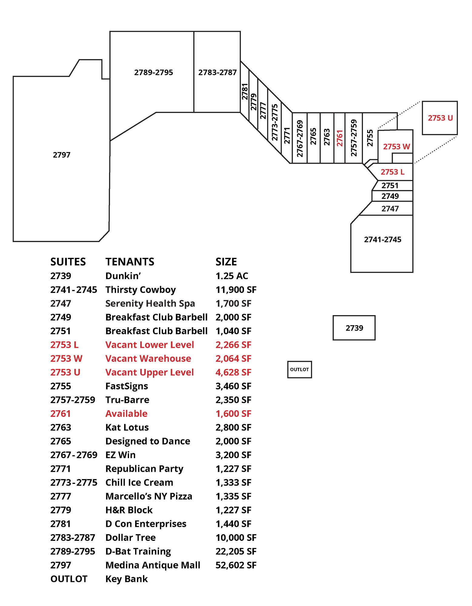 Multi-tenant center with retail, warehouse, and office spaces for lease.