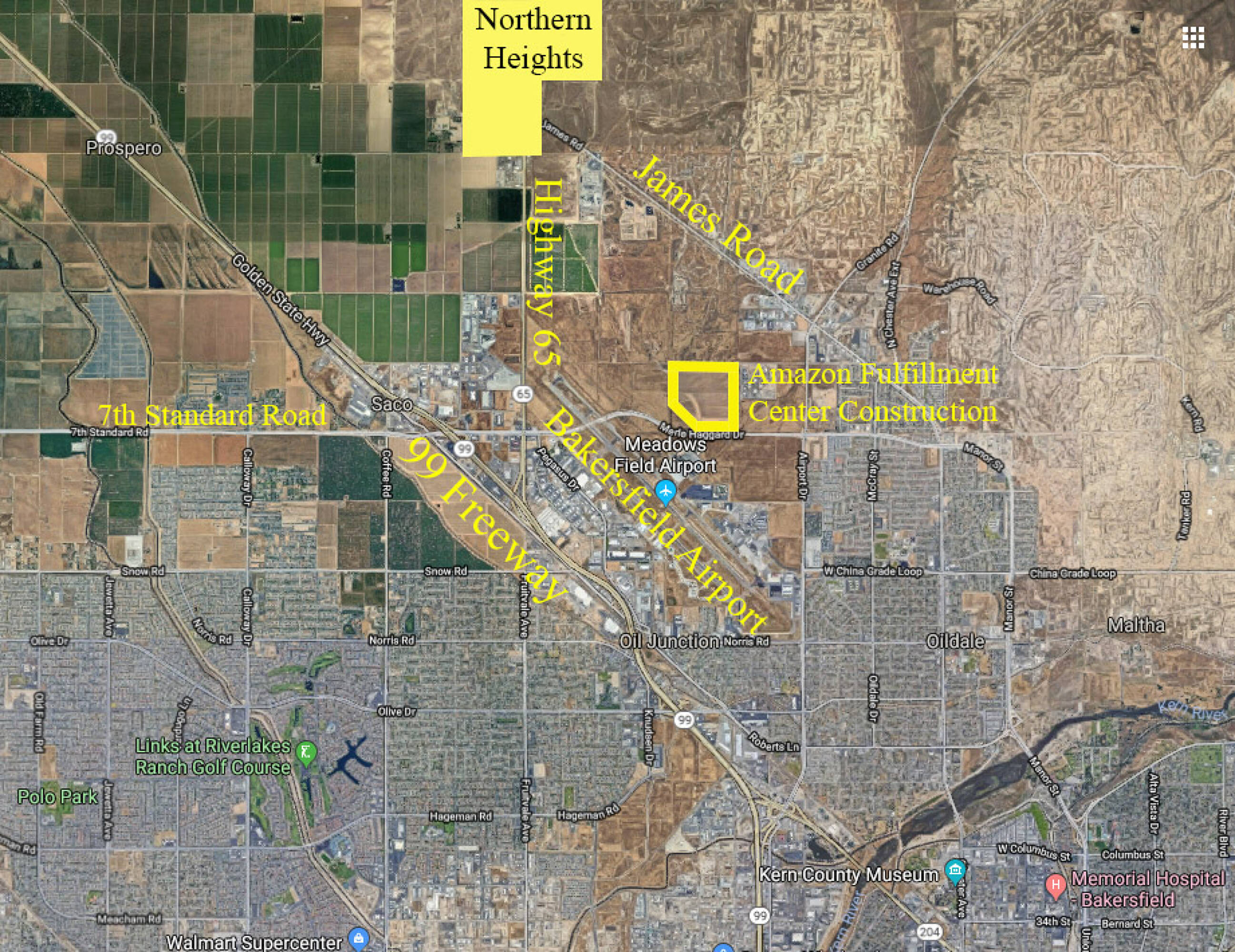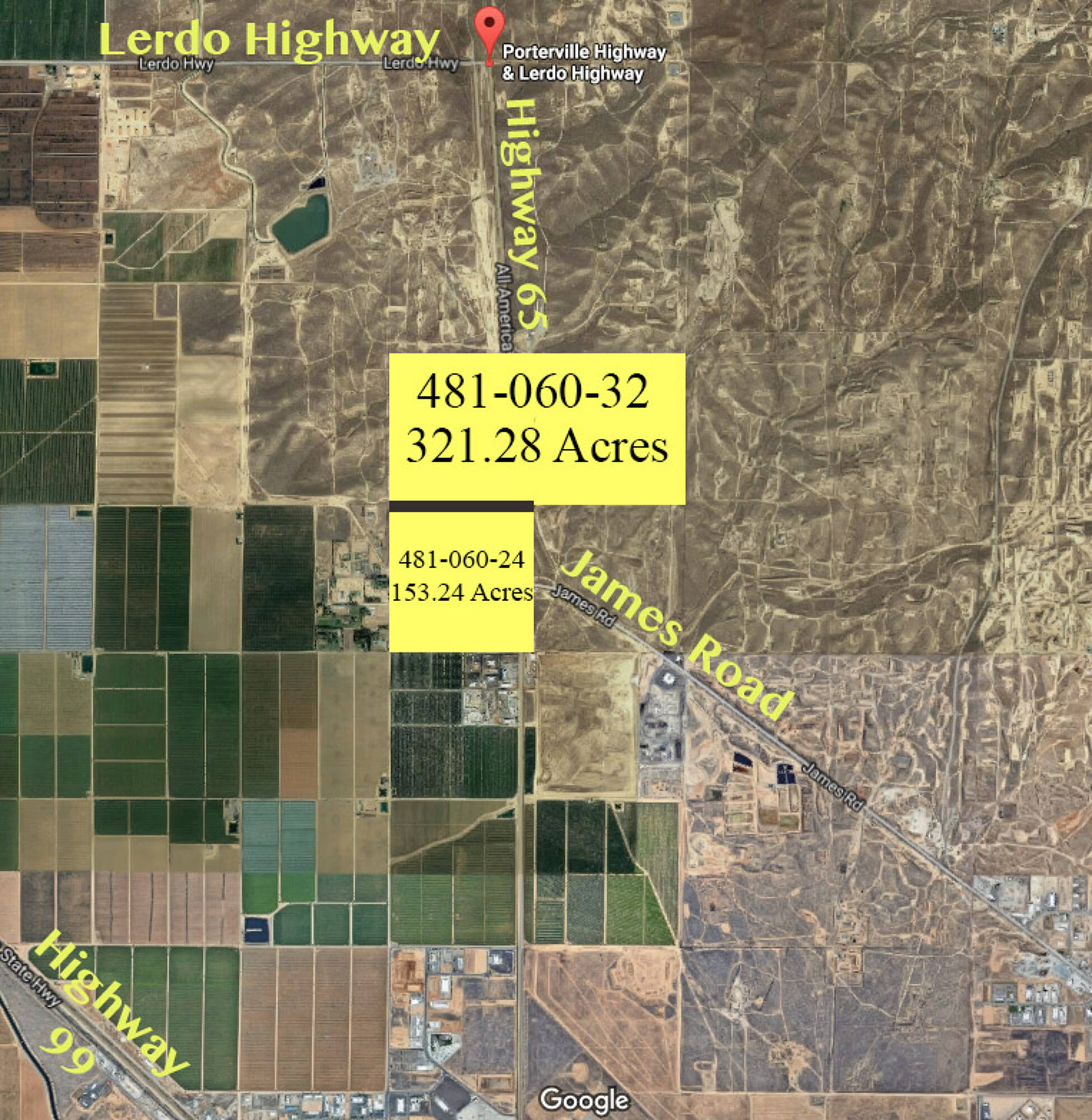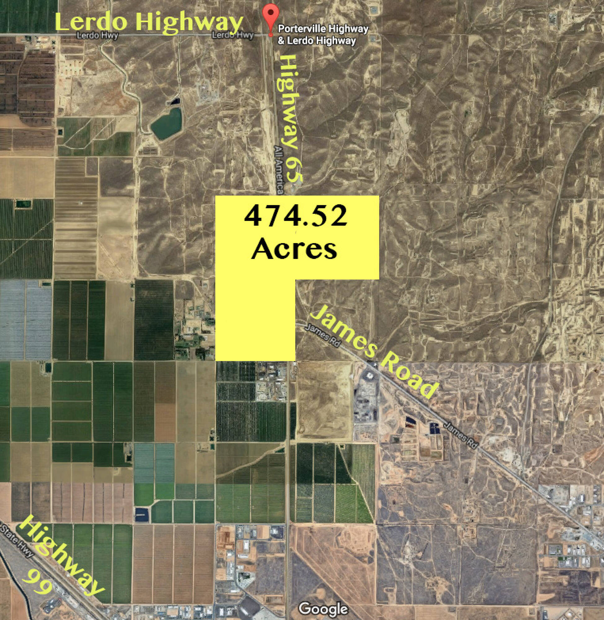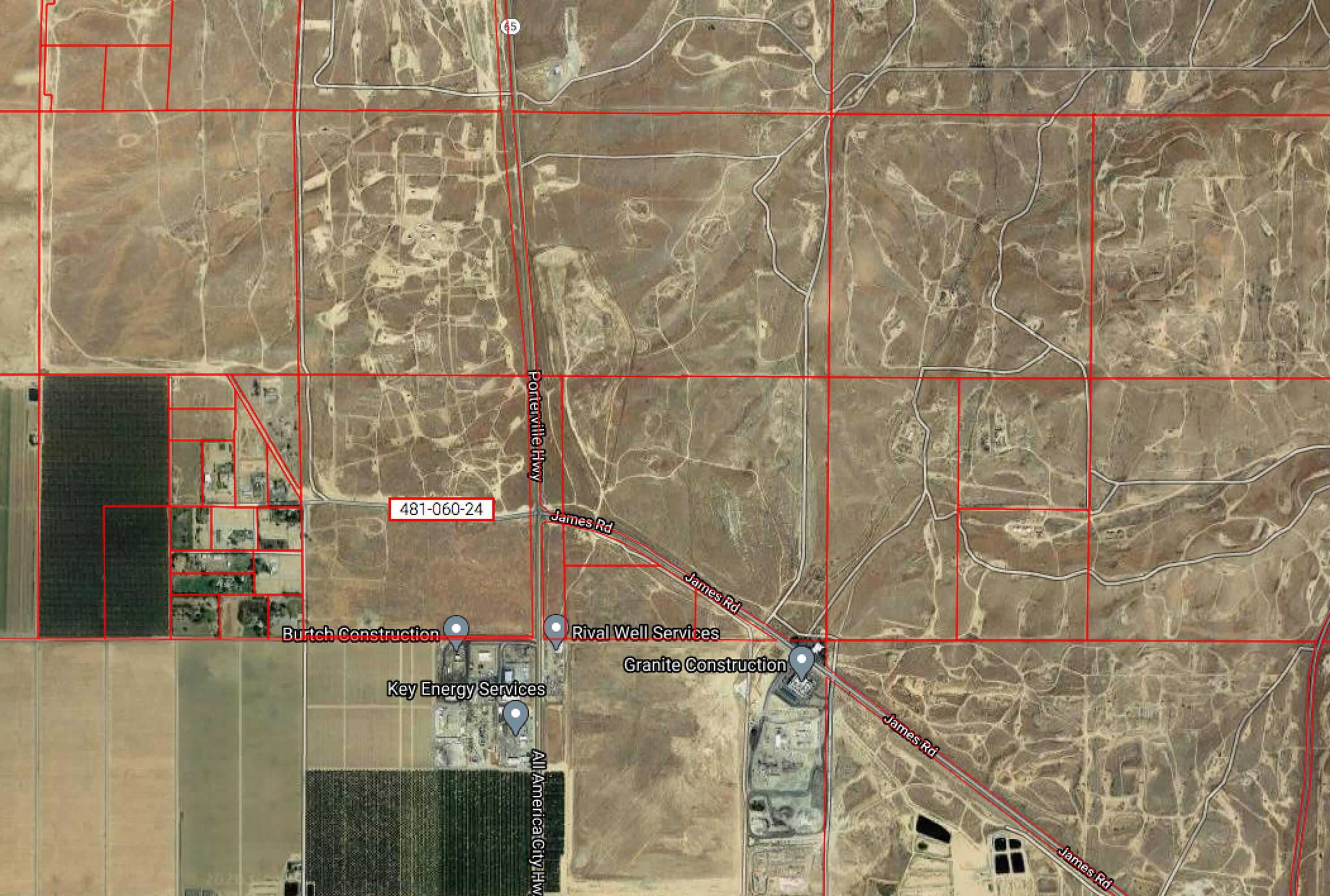 This land consists of two larger parcels totaling 474.52 acres. A parcel division process has been conditionally approved, splitting the two parcels into 9 separate parcels. The two existing parcels are 321.28 Acres (APN 481-060-32) and 153.24 Acres (APN 481-060-24). The property is located on the north side of Bakersfield in an area experiencing significant growth. It is directly adjacent to the WattEV electric truck stop and its solar array, as well as industrial and residential developments. The southern parcel includes all four corners of the intersection at James Road and CA-65 (Porterville Highway), presenting a development opportunity. The land also features 1 mile of frontage on both sides of CA-65. The parcels are located in close proximity to Meadows Field Airport, the new Amazon fulfillment center, and other industrial and commercial developments on the north side of Bakersfield.
