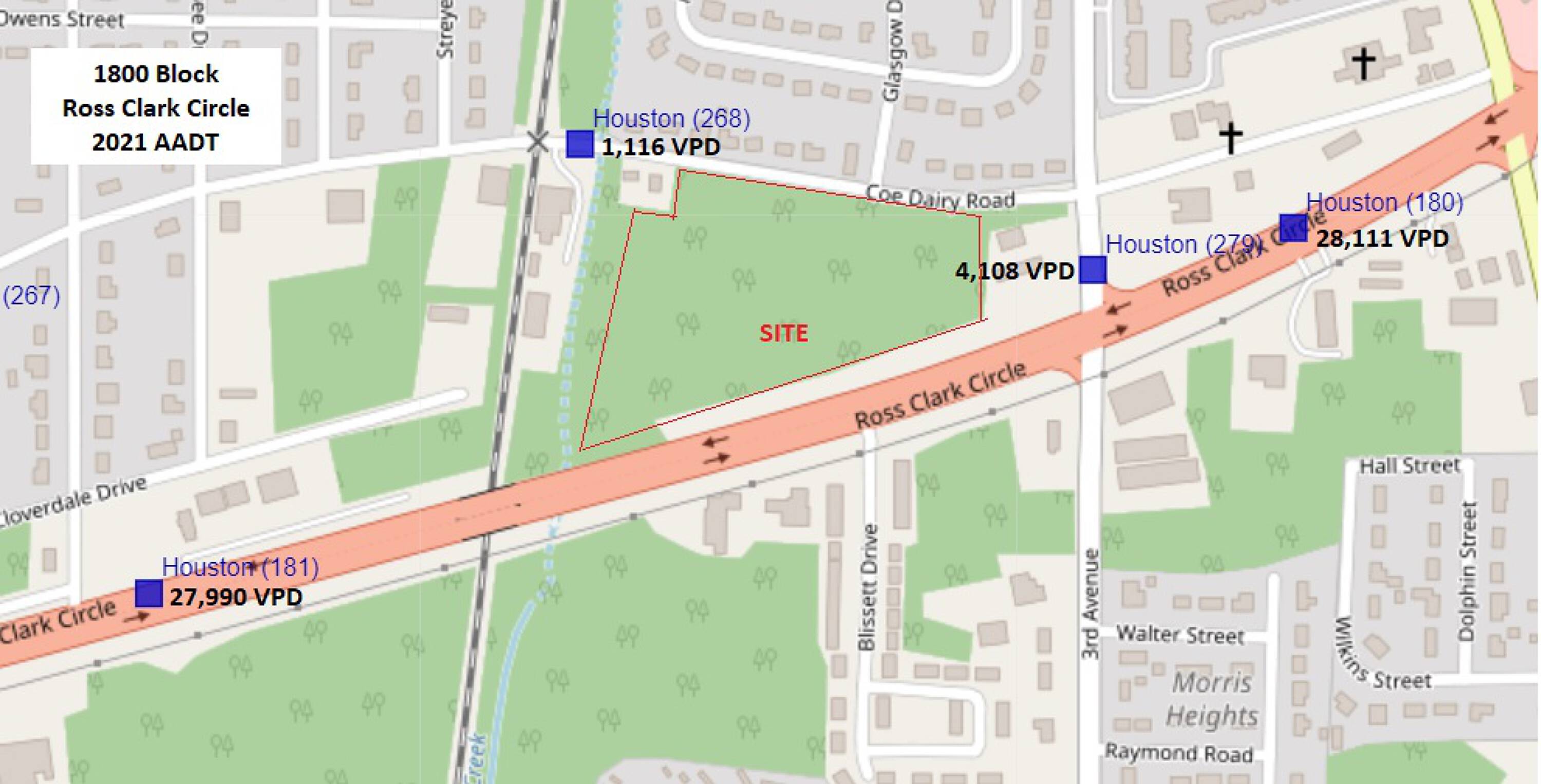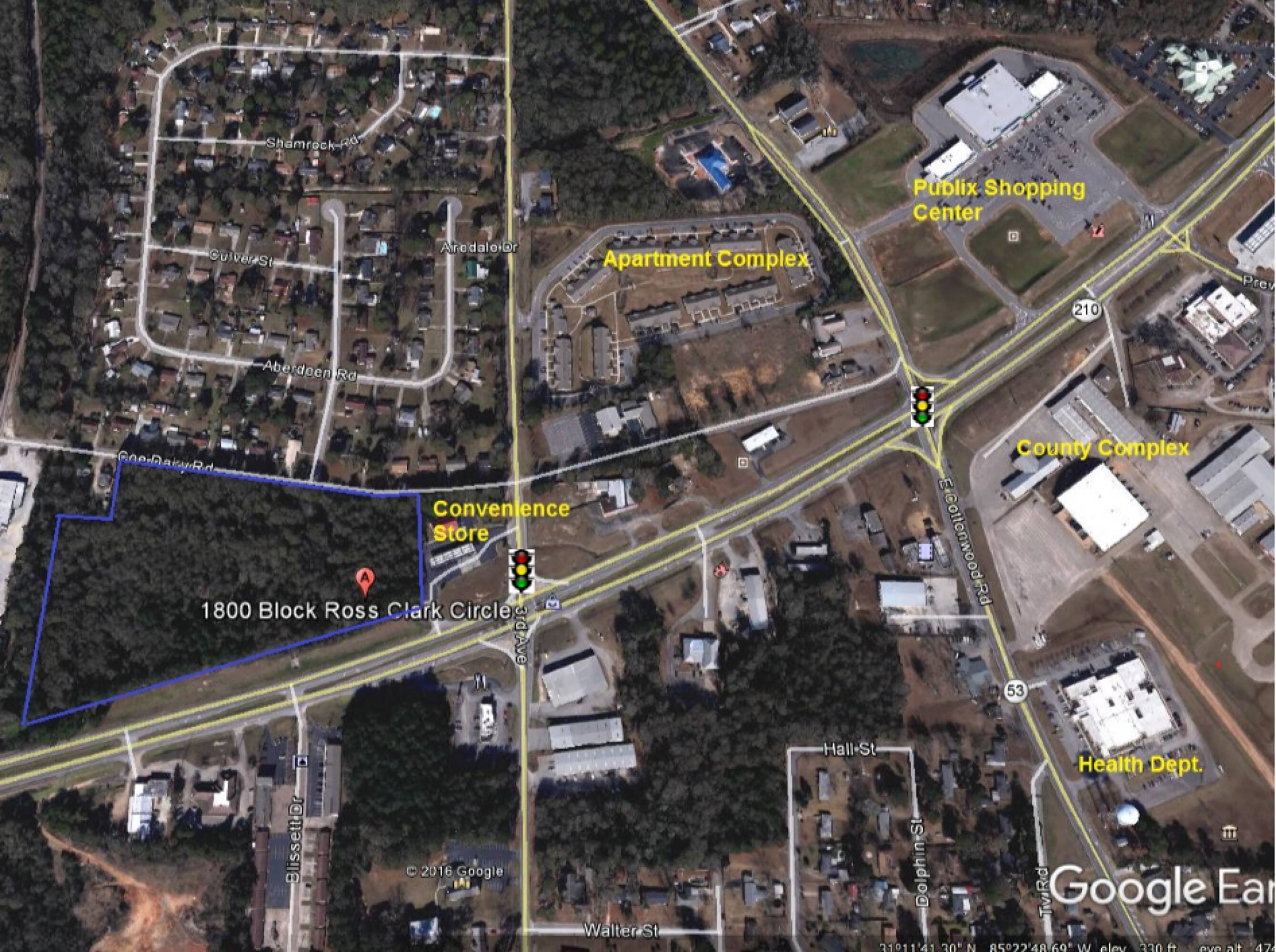 This commercial land offers 1,150 feet of frontage on Ross Clark Circle and 900 feet of frontage on Coe Dairy Road. The site is suitable for multiple uses such as a strip center, apartment complex, or mini-storage.