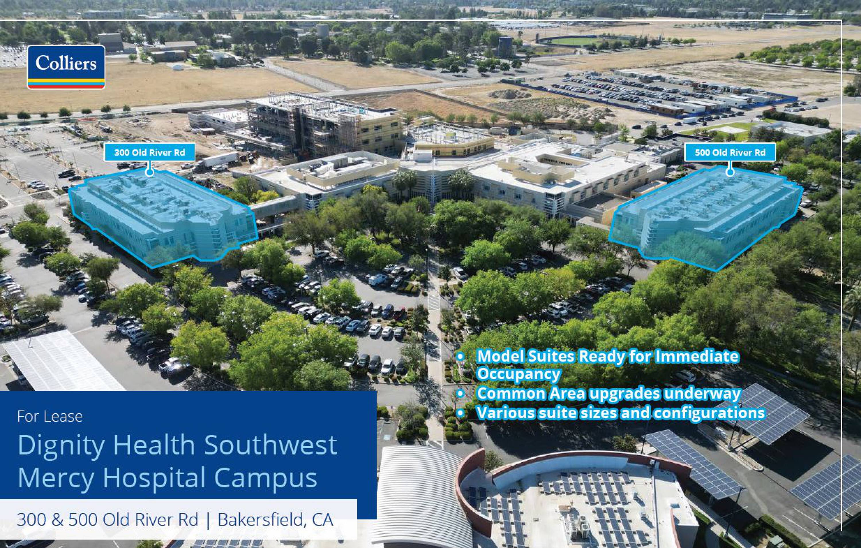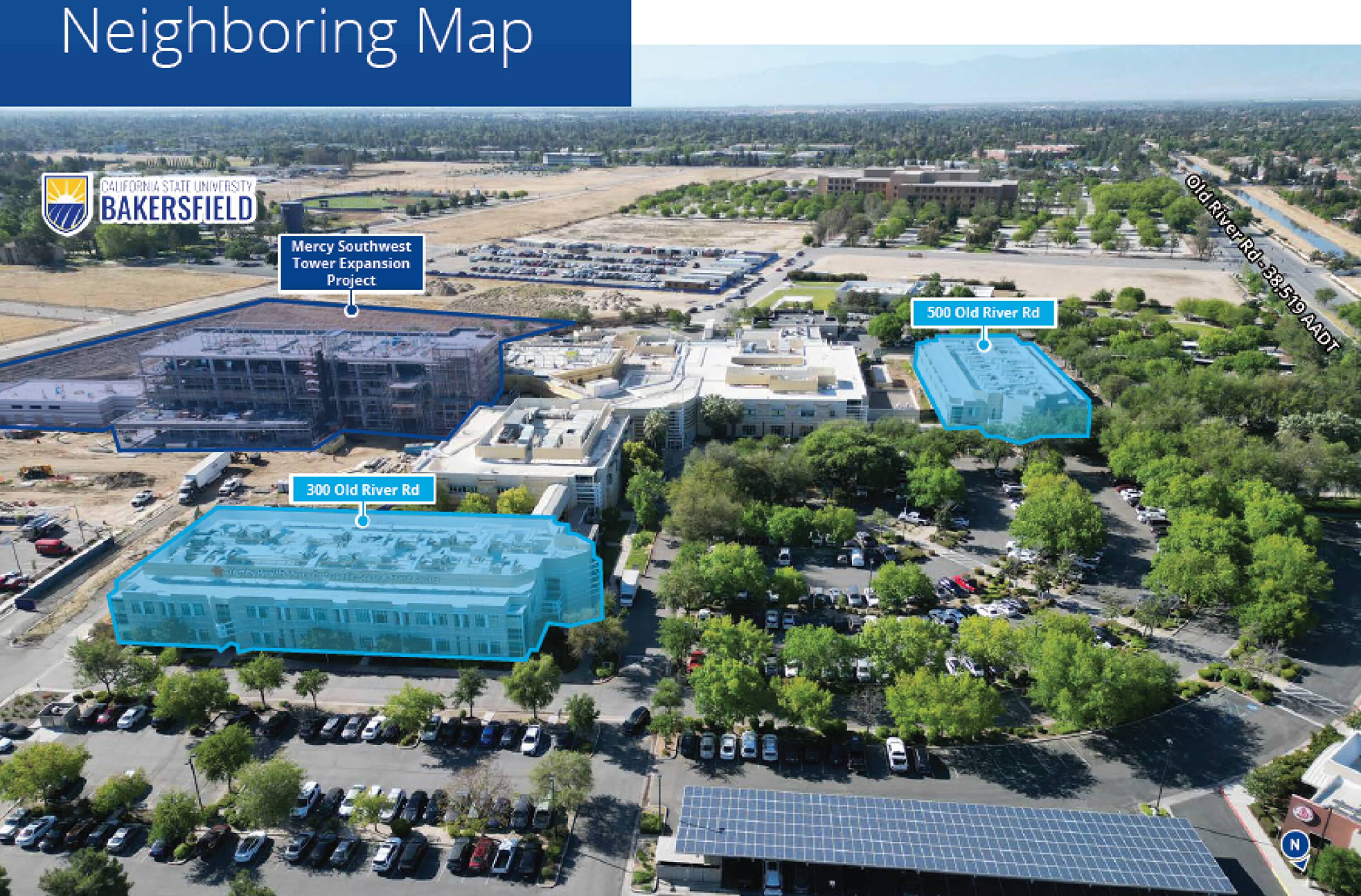 Located at 500 Old River Road, this two-story building offers a prime location in southwest Bakersfield, adjacent to Mercy Southwest Hospital, a member of Dignity Health. The property is situated in close proximity to California State University Bakersfield, Mercy Hospital, and the US Post Office. Medical space is available on the grounds, catering to healthcare professionals and patients. The building features long-term, well-established physicians as co-tenants, fostering a supportive professional environment. Ample parking is available, and the property benefits from strong walkability to nearby retail and restaurants. This location is suitable for businesses seeking prominence and accessibility in the Bakersfield metropolitan area.