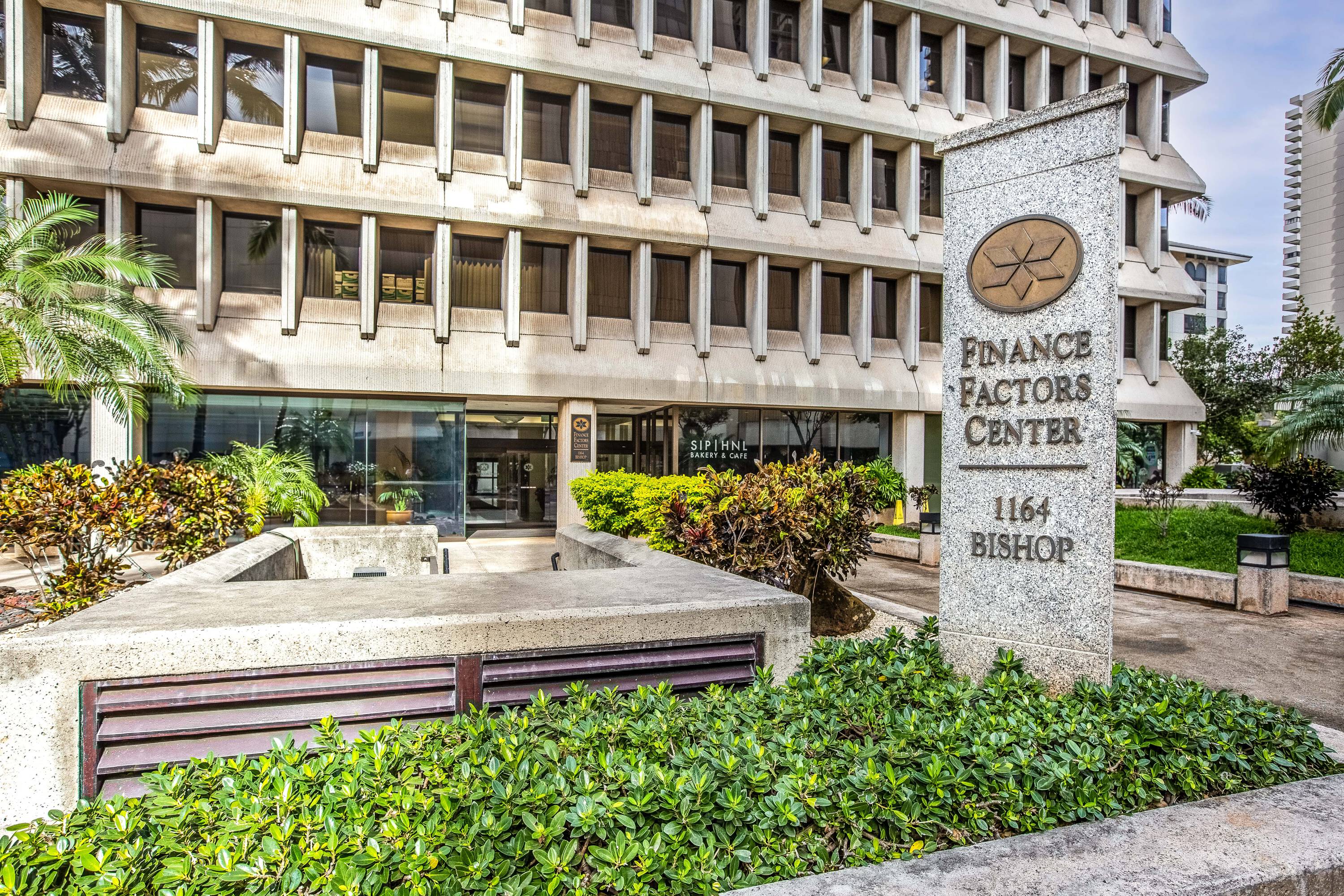 The Finance Factors Center, located at 1164 Bishop Street in Honolulu's Central Business District, is a 17-story office building encompassing 185,633 square feet. Its location on Bishop Street is suitable for various companies and enterprises. The offices have been upgraded to a modern aesthetic, featuring contemporary common areas with updated elevator lobbies and restrooms. Expansive windows provide natural light and views with minimal obstruction. On-site management, 24/7 security, and secure garage access with license recognition contribute to a safe work environment. The ground floor includes a retail café and a Graze Craze storefront. The building is situated on Bishop Street, close to restaurants, retailers, entertainment venues, and banks, all within a five-minute walk. Access to the Interstate H1 and Highway 61 interchange is a two-minute drive away. The tenant base includes Finance Factors, law firms, and architects.