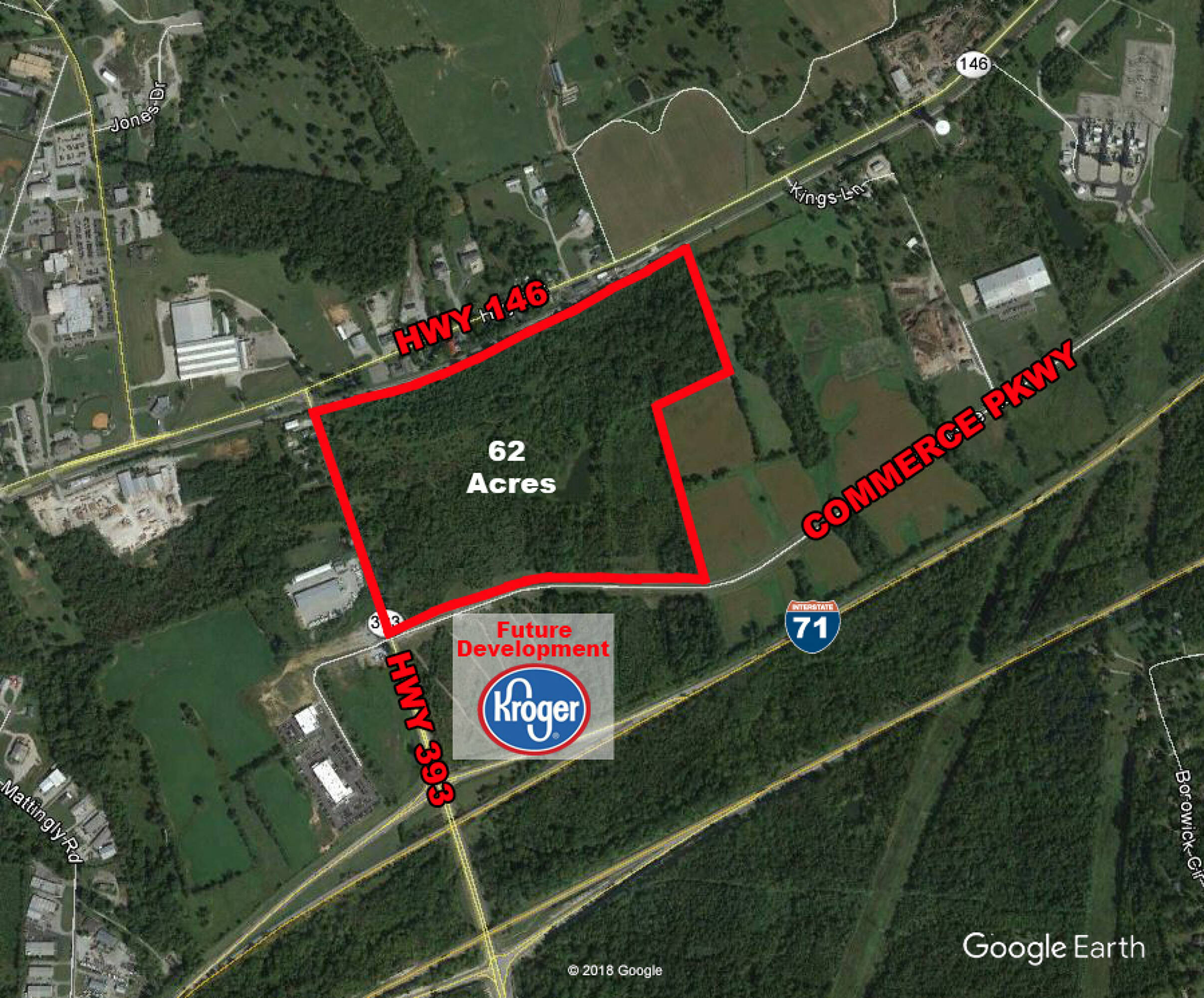 This property offers up to 62 acres of land suitable for retail or hospitality purposes. Located in Buckner Crossings, the property can be subdivided to suit specific needs. It features significant visibility with frontage on Highway 393 and convenient access to I-71 via Highway 393. The location is next to a new Kroger store on Highway 393. Additional adjacent land is available.