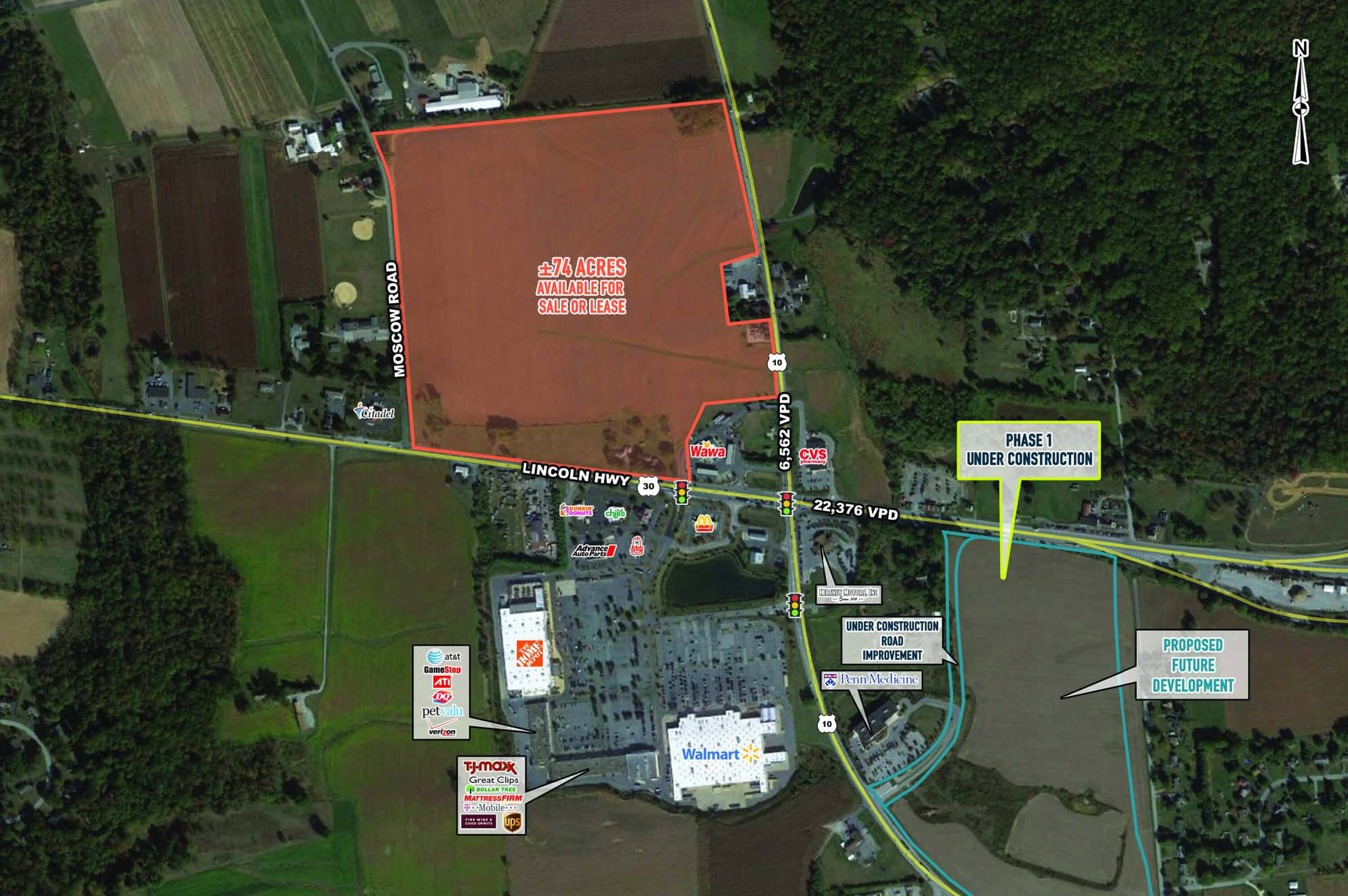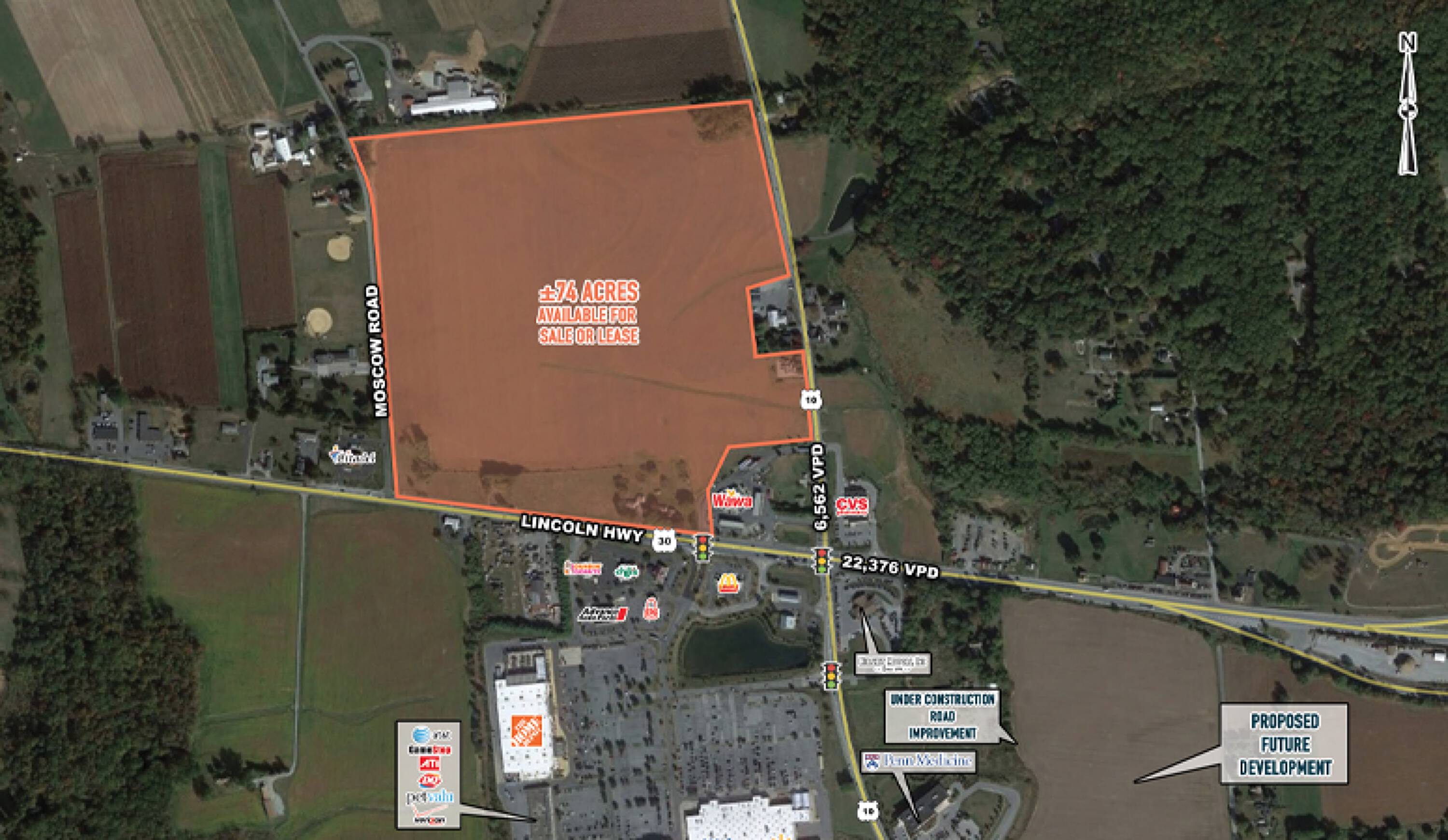 This property features: ±74 acres of land available; Land is available for sale or lease; Property is suitable for development