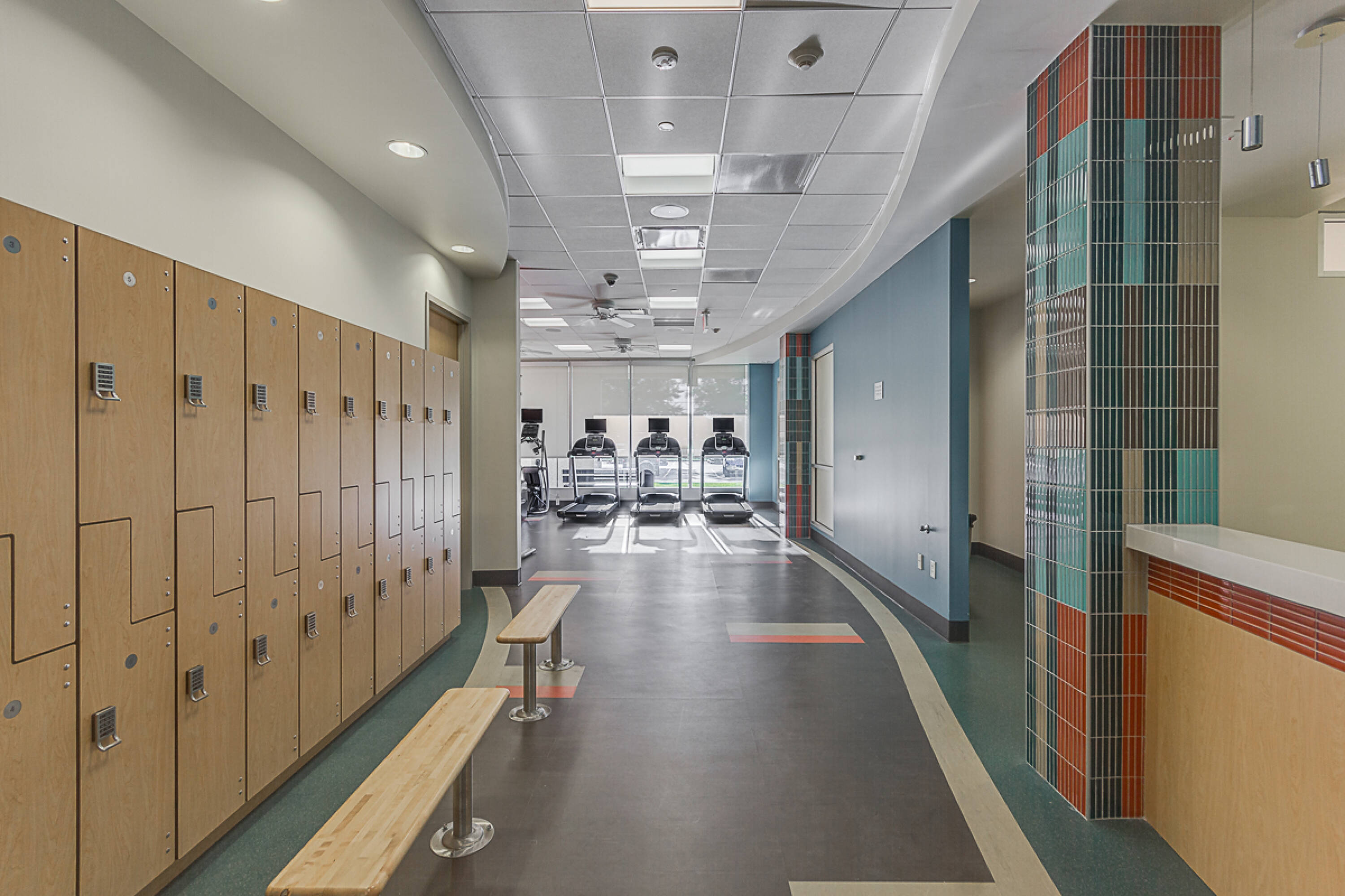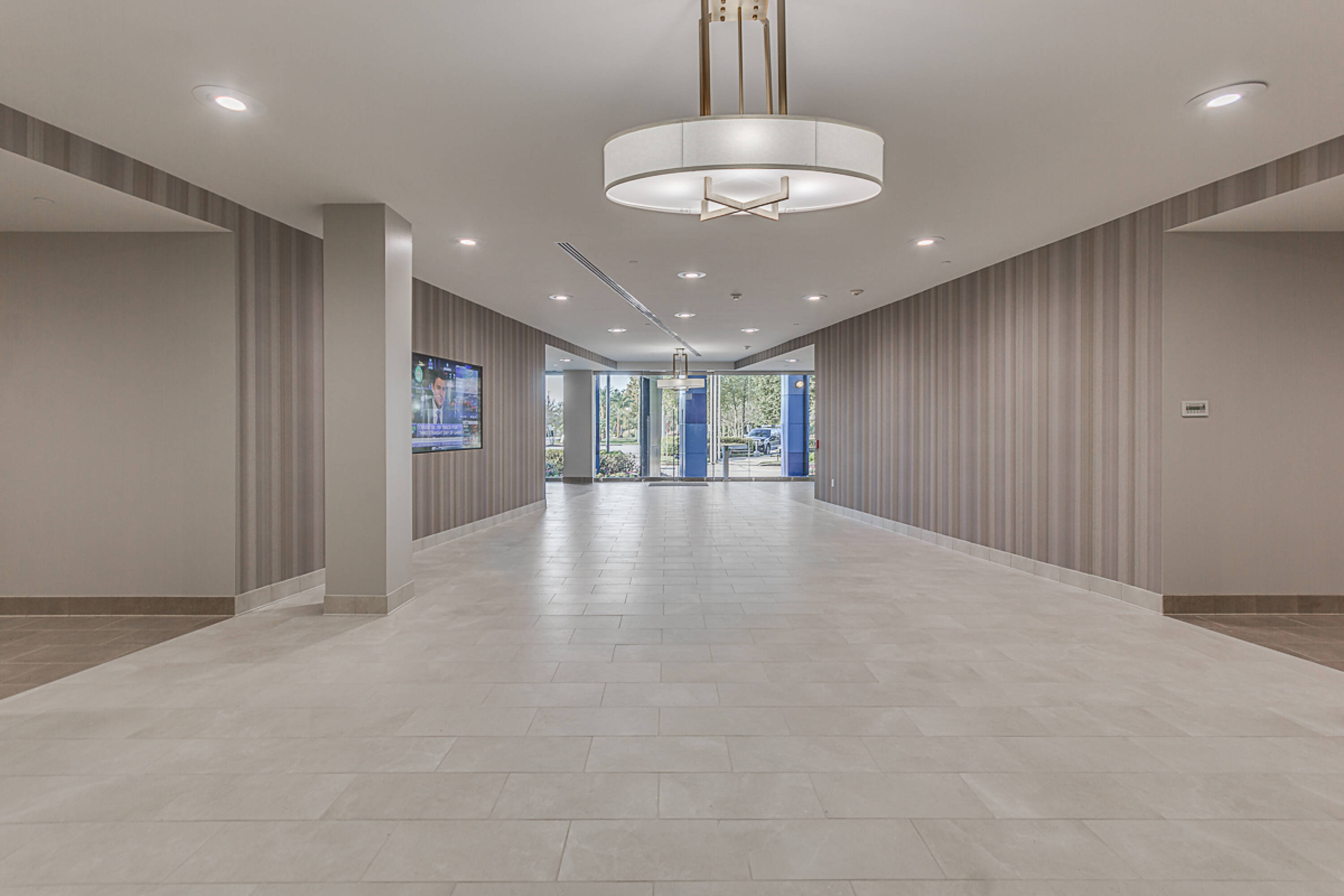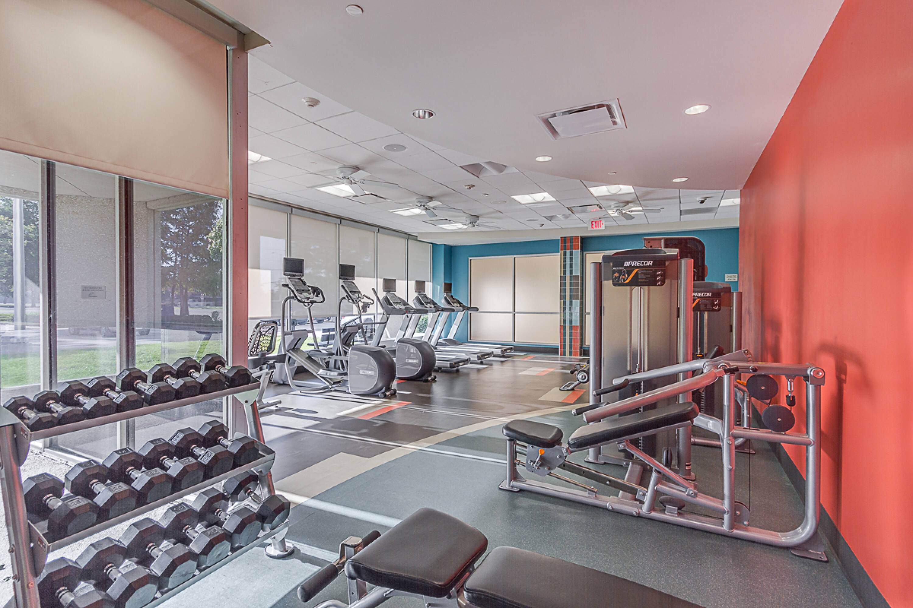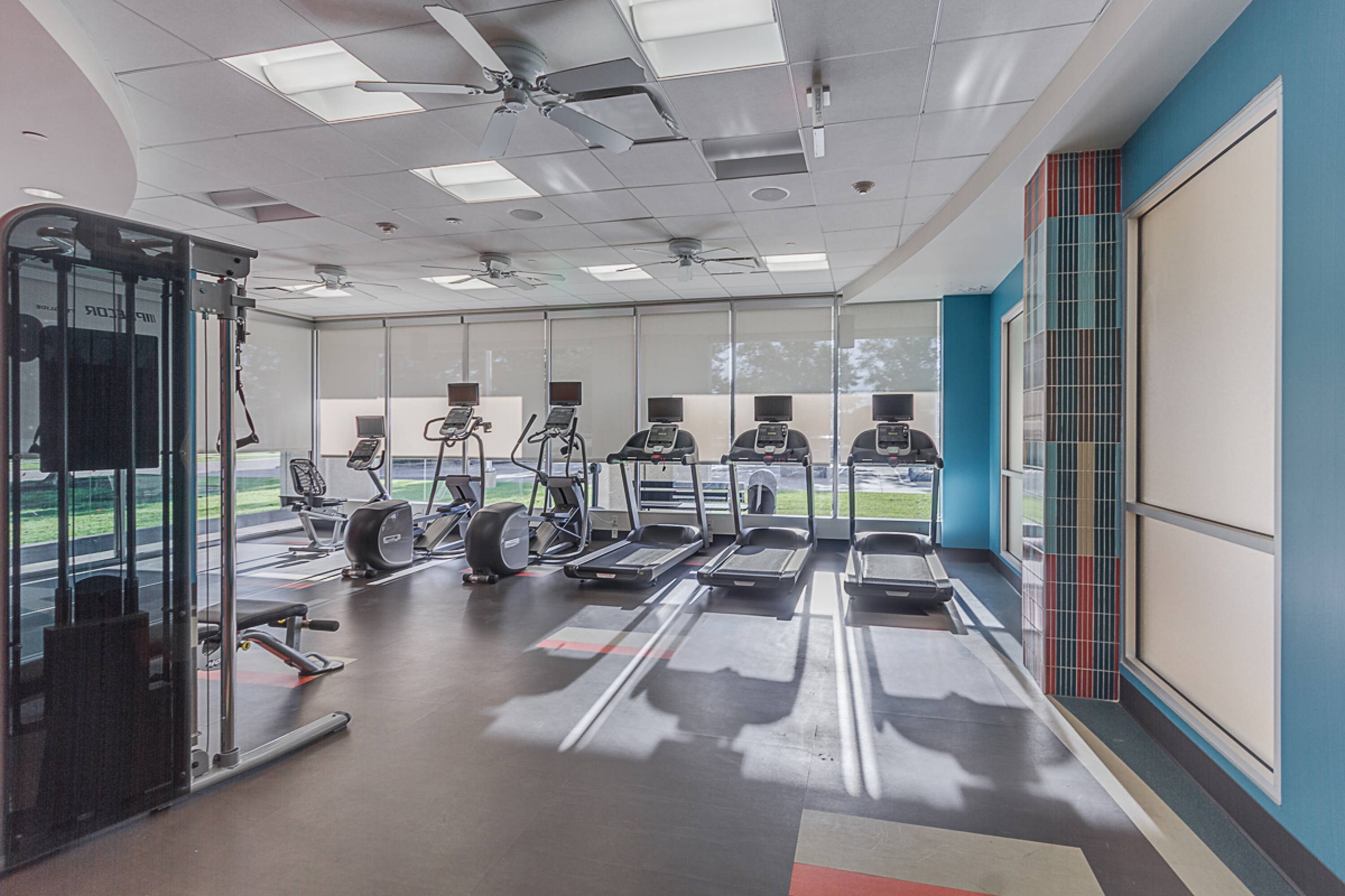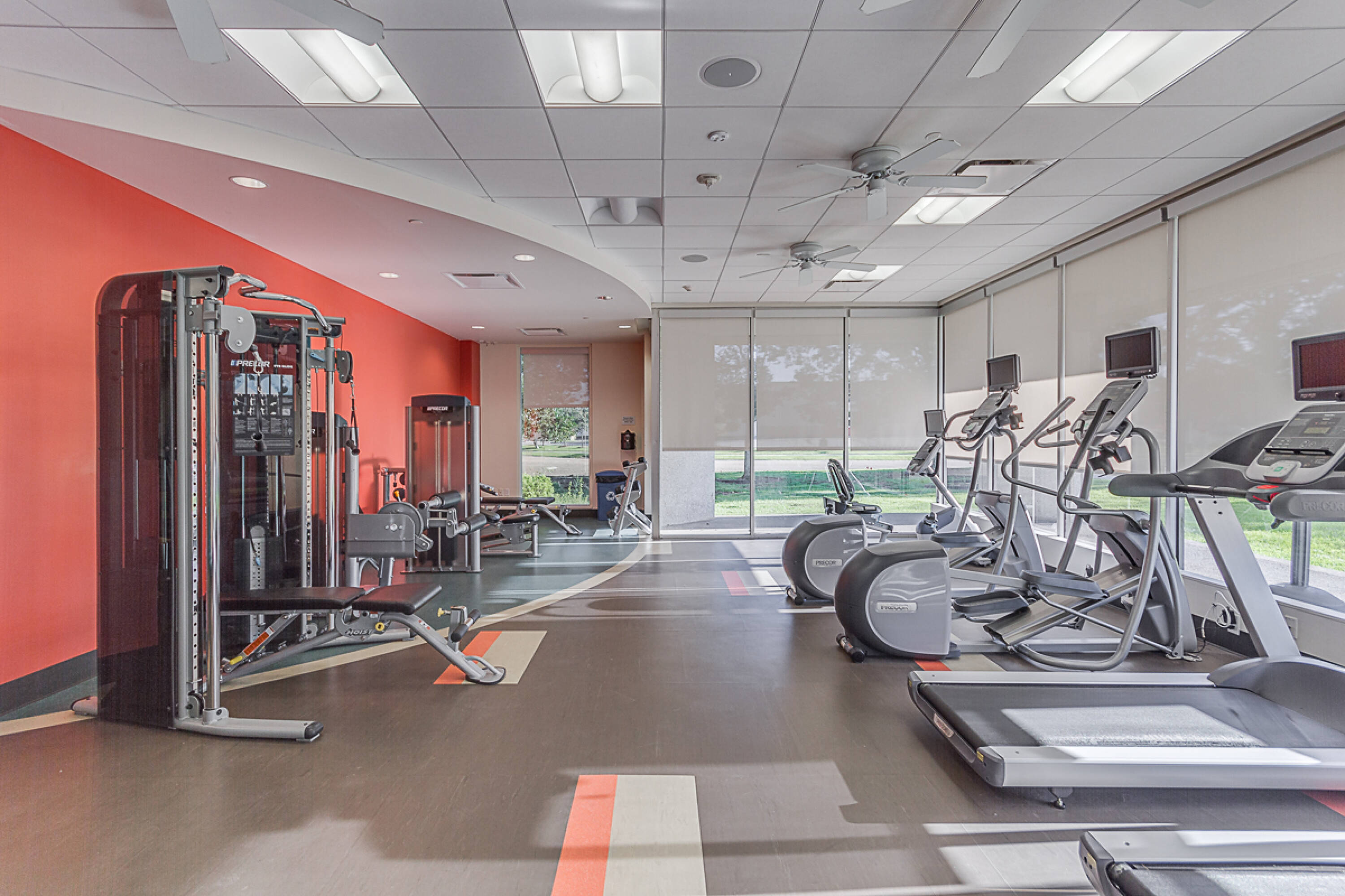 Modern office space with on-site cafe and fitness center.