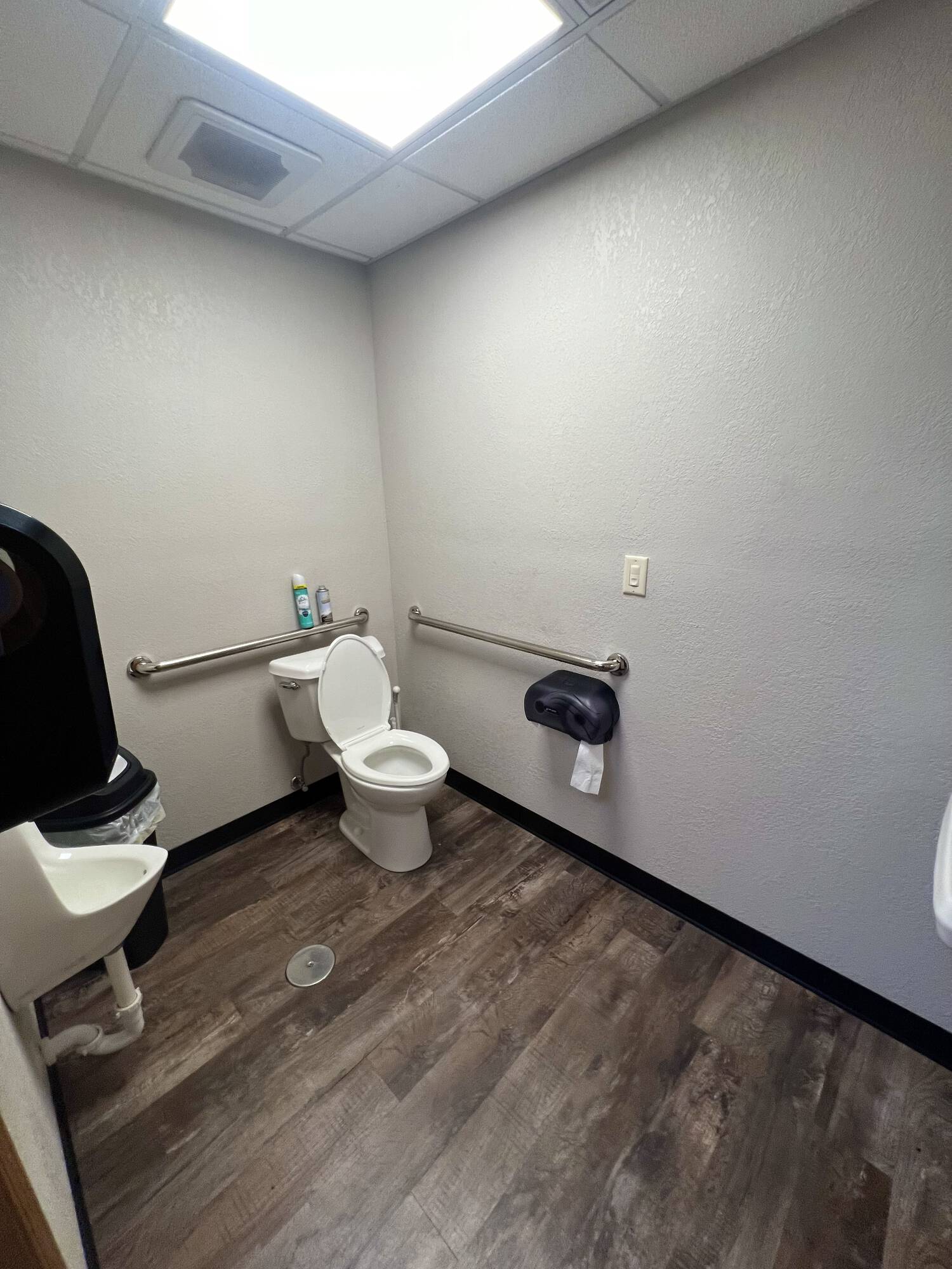 Remodeled building with blacktopped lots in high-traffic location.
