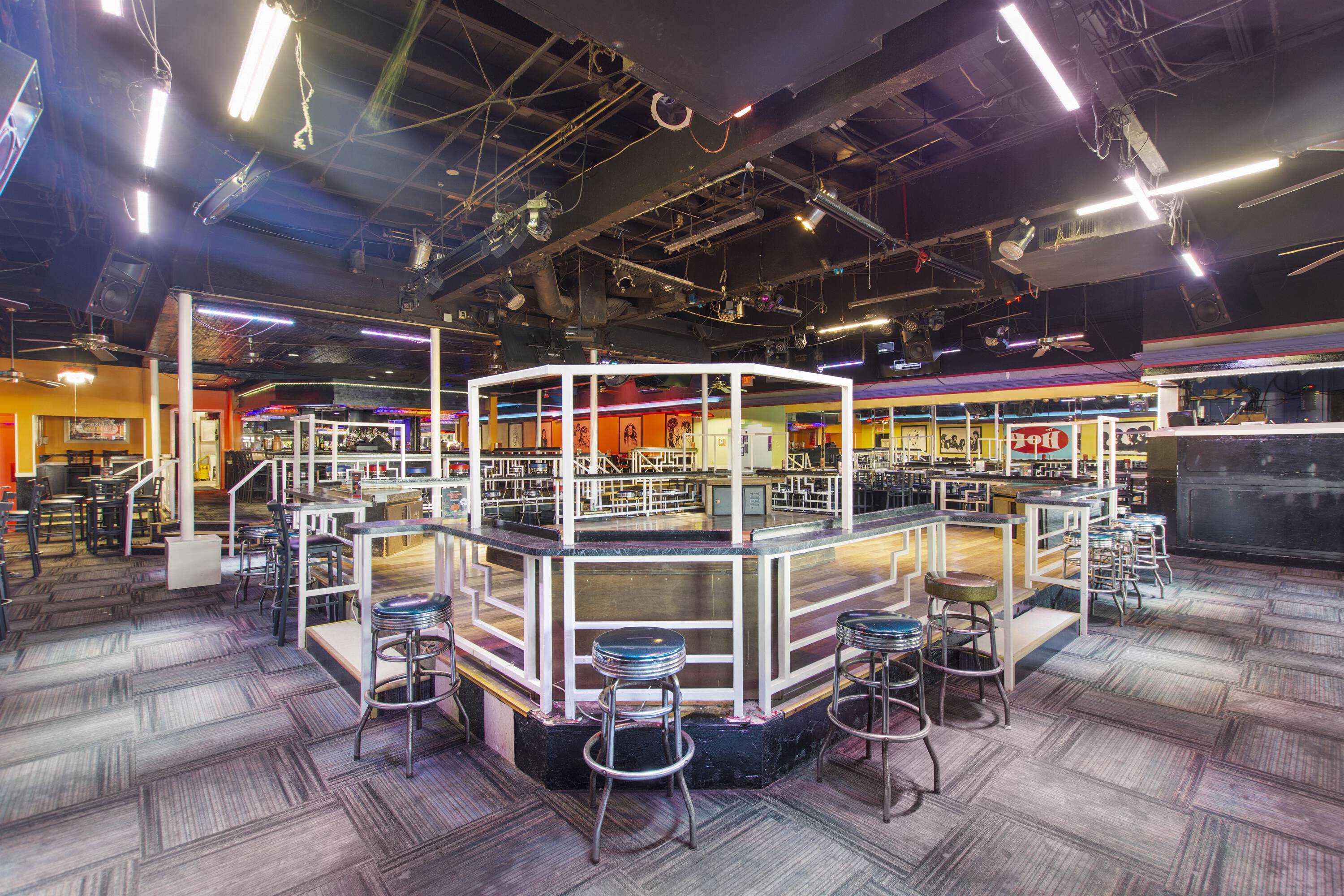 Fully operational nightclub with kitchen, bars, dancefloor, and outdoor seating.