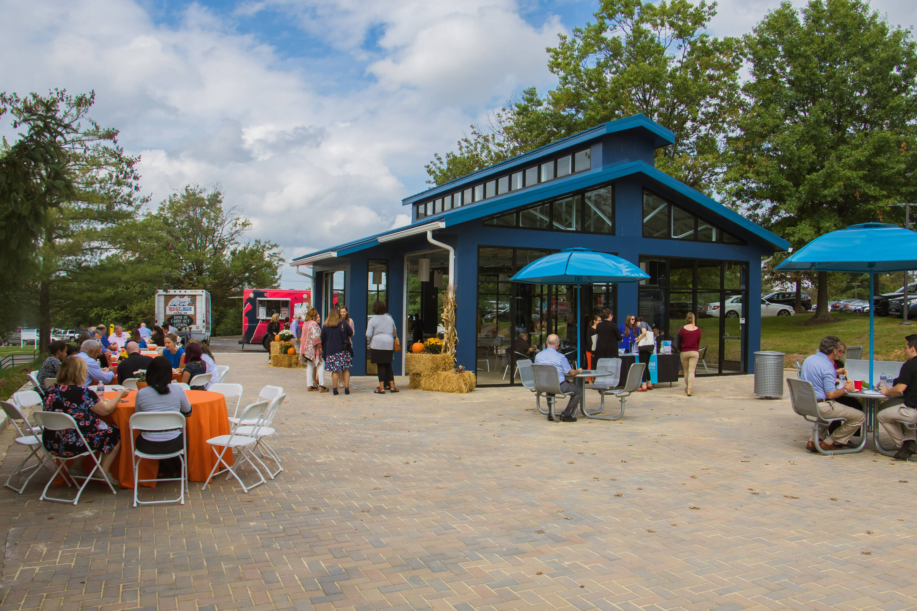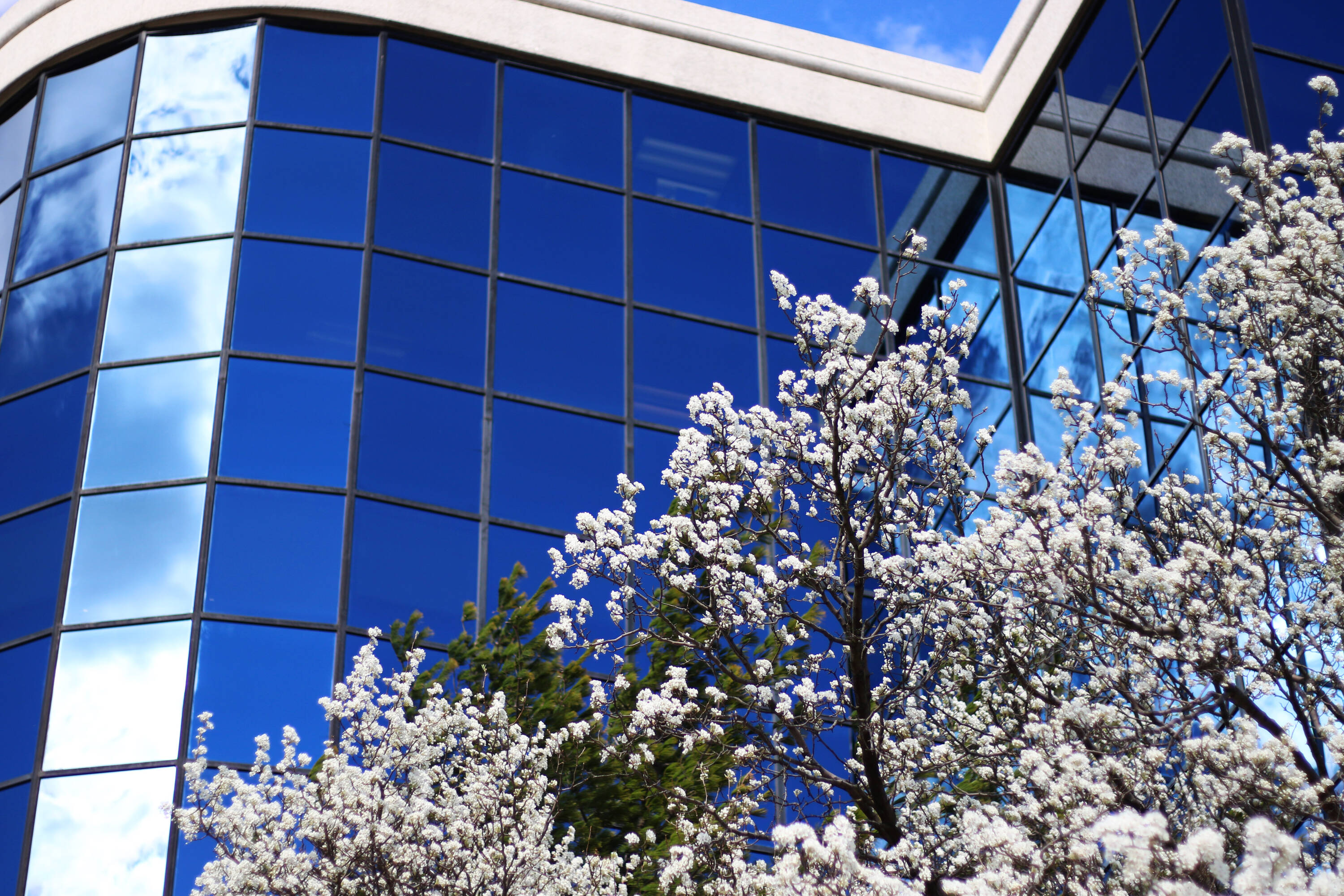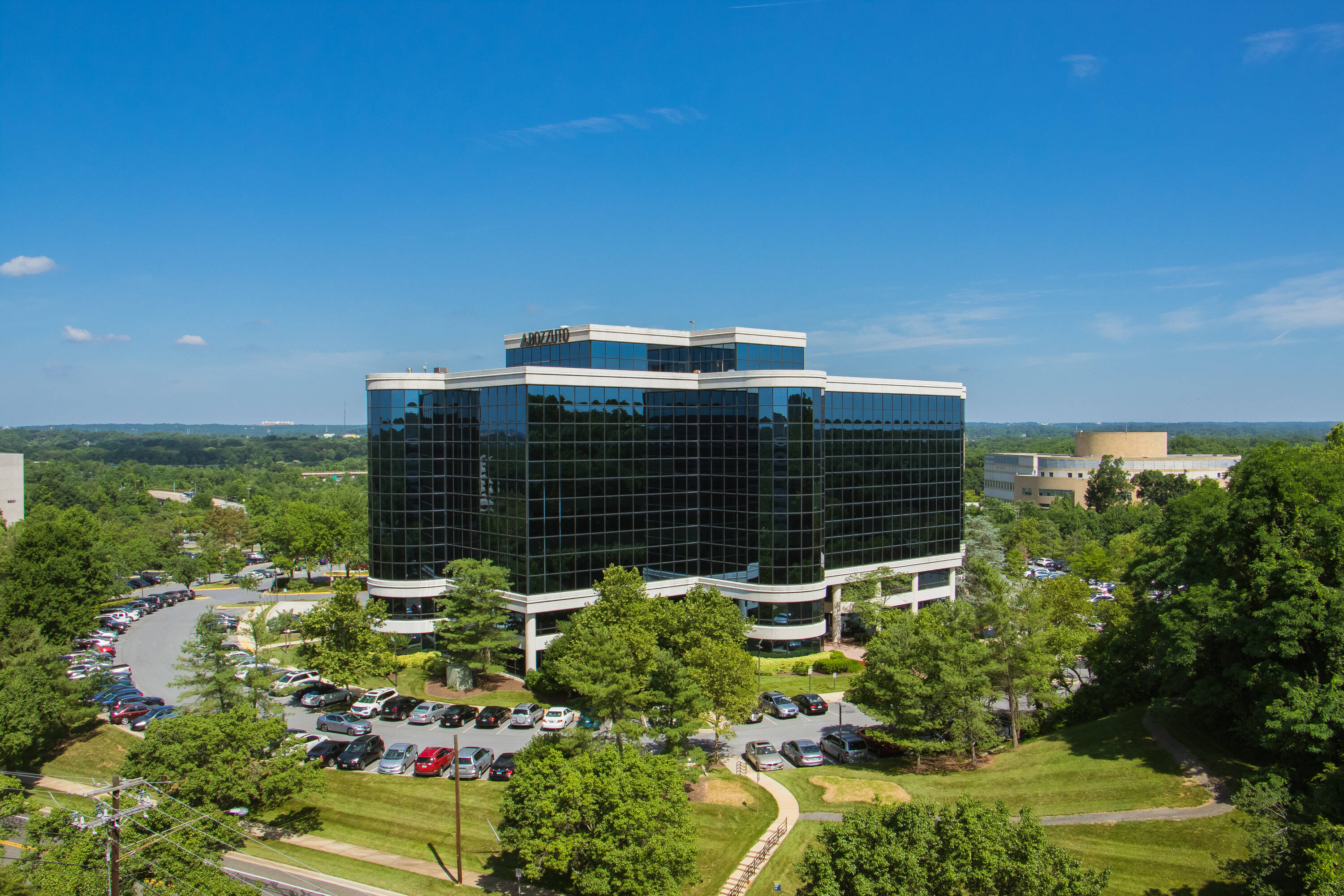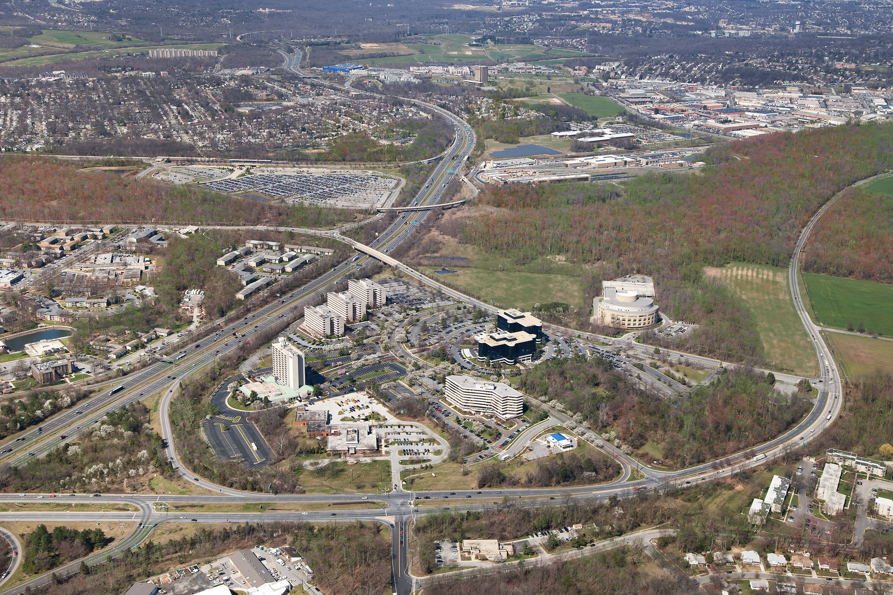 Twin office buildings near Capital Beltway with extensive amenities.