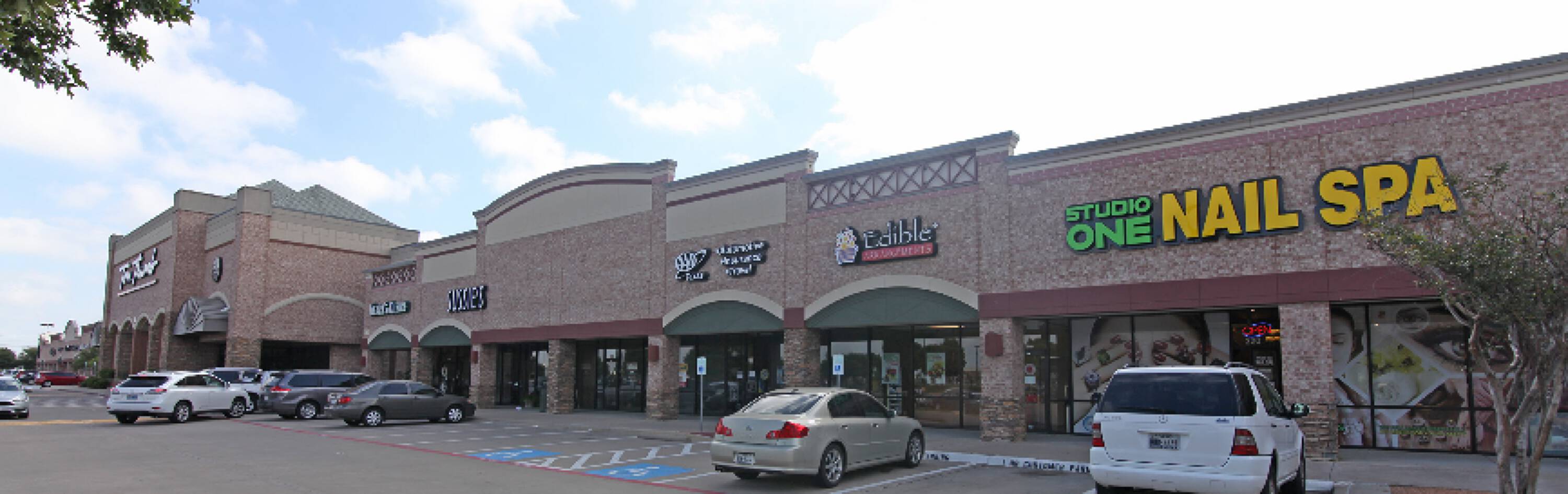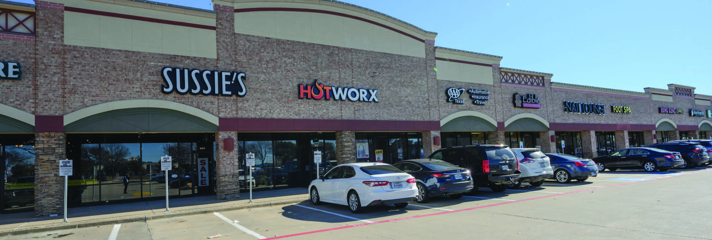 Retail spaces for lease in Frisco Village shopping center.