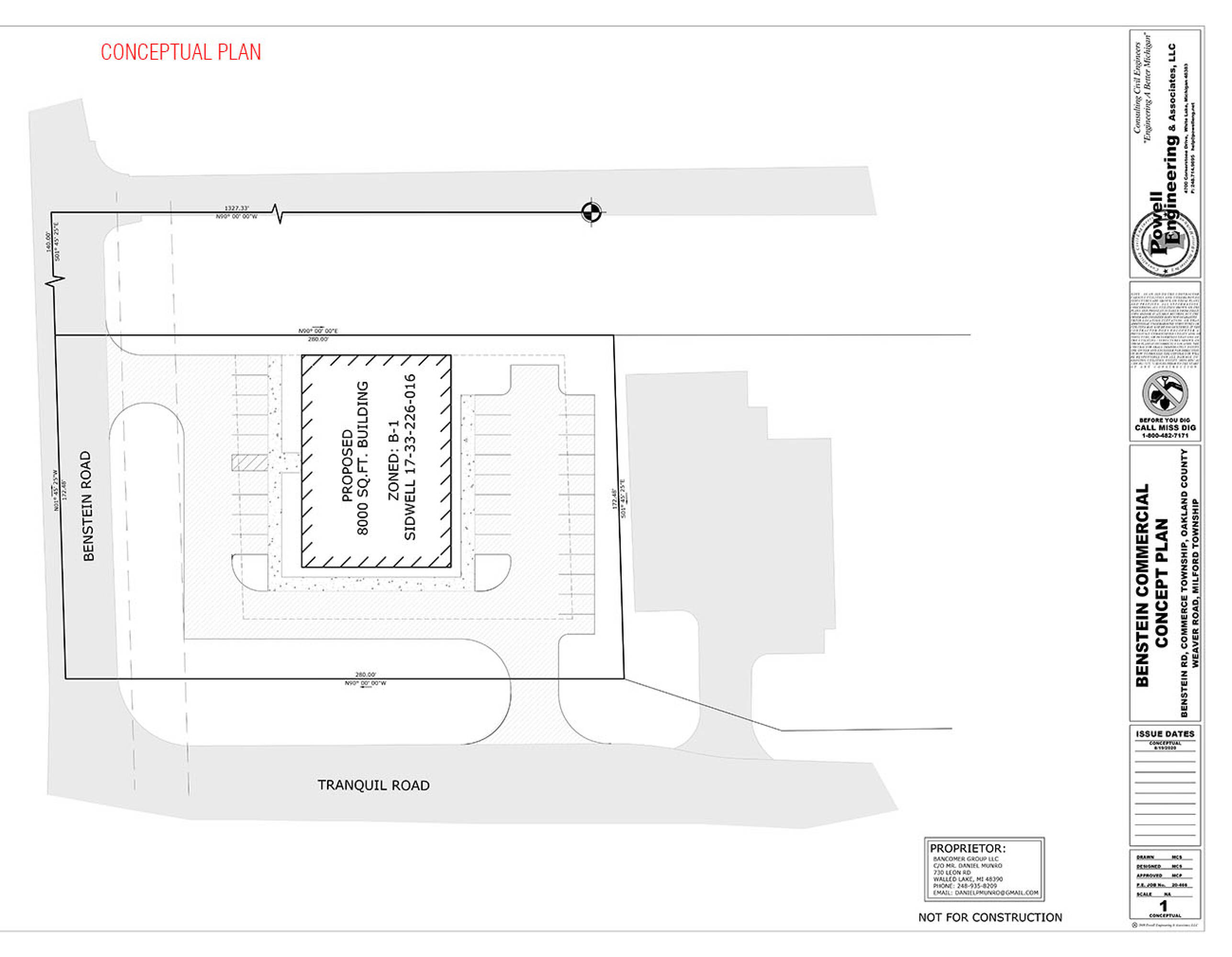 This 0.98-acre site is zoned for industrial use. Concept plans indicate the site can accommodate an 8,000-square-foot building. The property offers visibility with frontage on a main road. The site has dimensions of 172 feet by 247 feet. The property is located on the east side of Benstein Road, north of Maple Road.