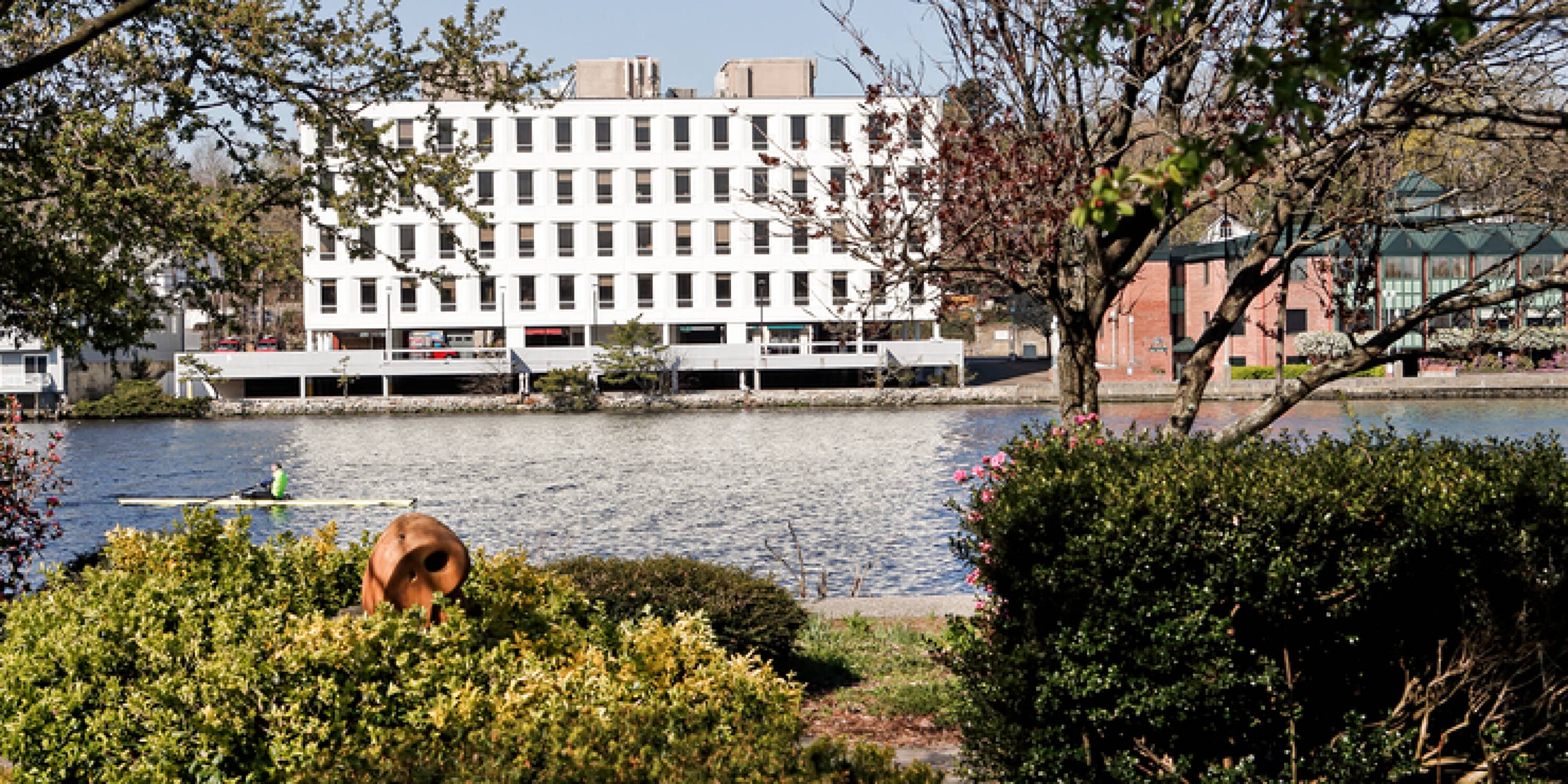 Office building with river views and renovated common areas.