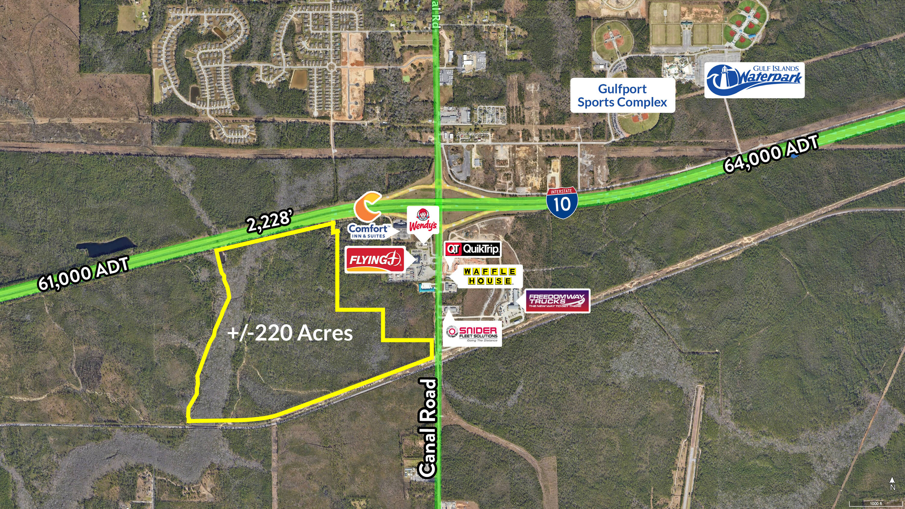 This property features: 220 acre commercially zoned parcel with **2228' of I‑10 frontage.**; **Outstanding development opportunity** for warehouse distribution or businesses needing high visibility and easy I‑10 access.; Located on the southwest quadrant of Canal Road and I‑10 in Gulfport, Mississippi.