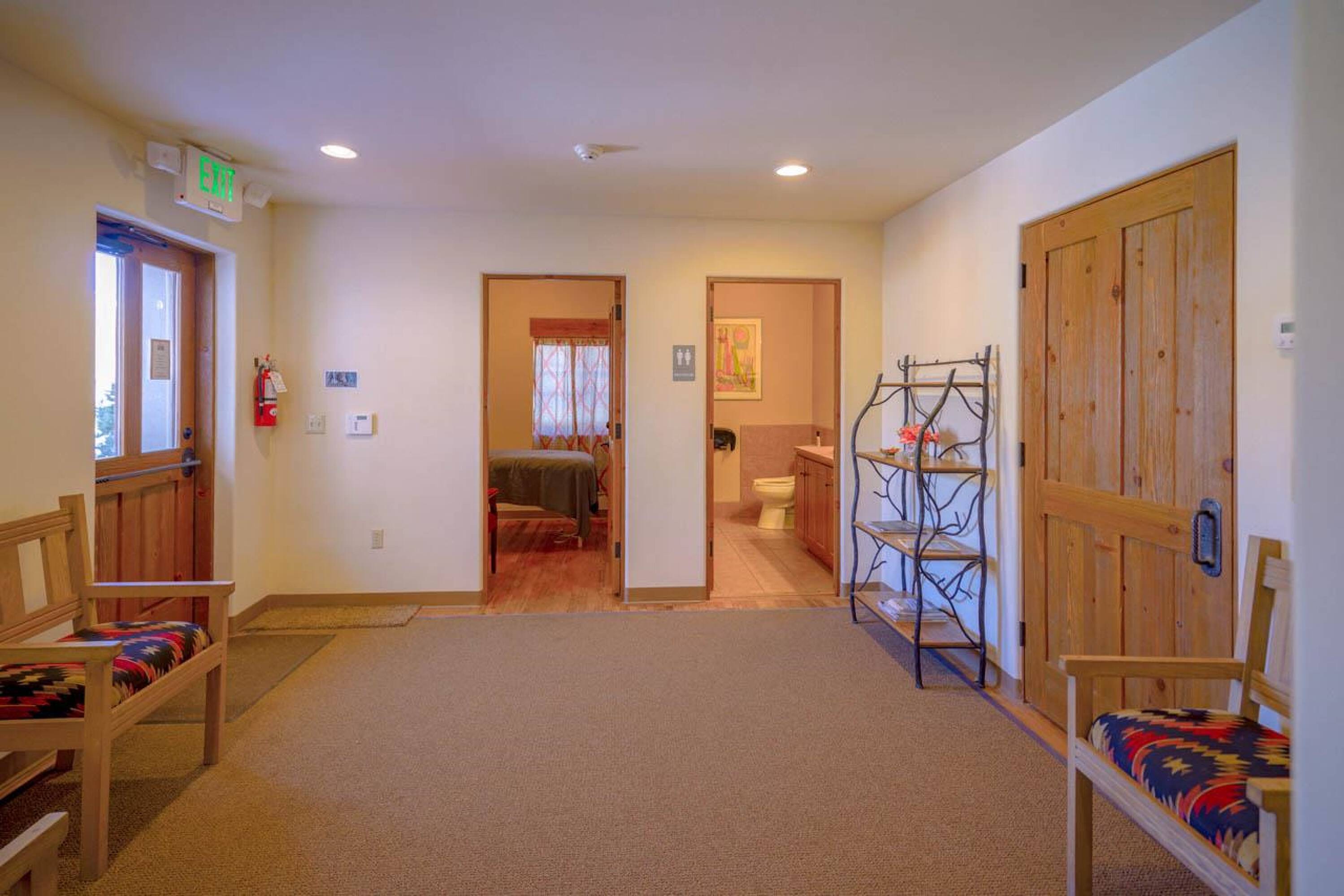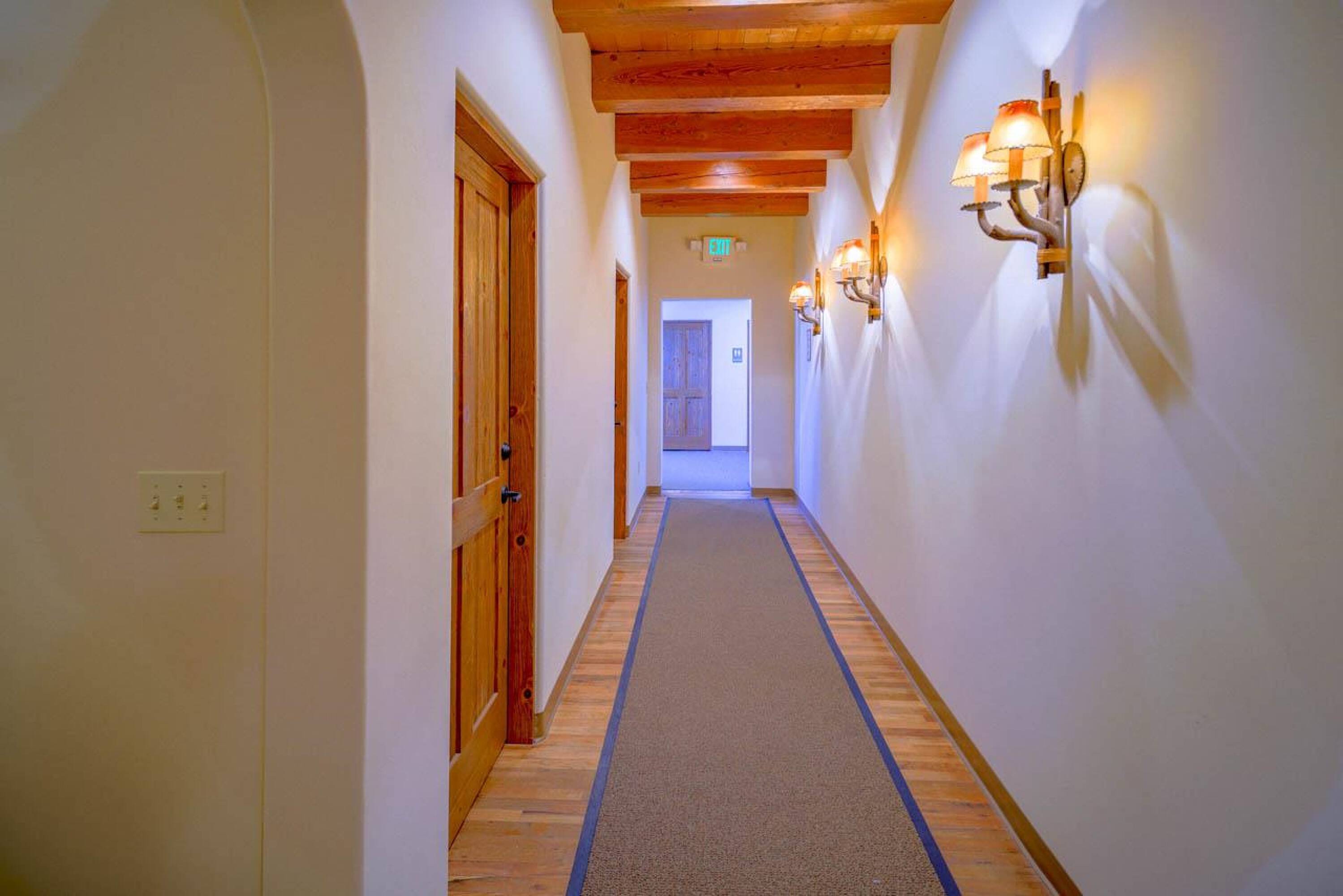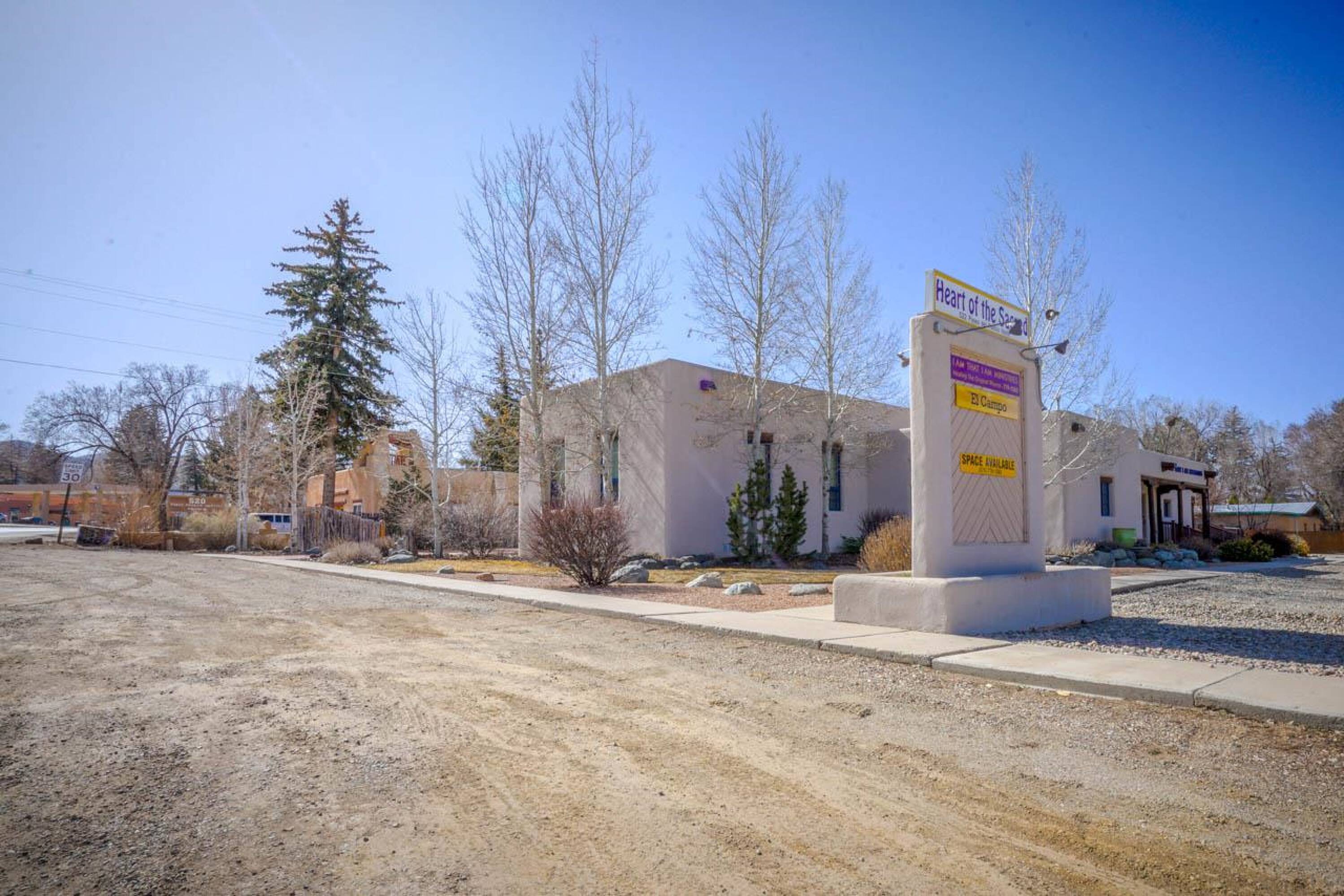Located approximately 0.9 miles from The Taos Plaza, this 5,795 square foot multi-use commercial/residential building features Pueblo-style architecture and is in exceptional condition. The building underwent a complete renovation, down to the cinder-block exterior walls, and was rebuilt from top to bottom. Currently, the building houses a clothing designer, two massage therapists, and two spa treatment specialists. Previously, it served as a ministry's gathering place with offices, a reception area, and a stage, as well as offices for a local government agency. The building is divided into three separate sections. The first section includes five office suites with a shared reception area, two bathrooms (one handicapped accessible), and a handicapped accessible entrance. The center section could function as a New York-style warehouse loft for live-work, a meeting/gathering place, a wedding and events venue with a stage, a dance hall, a yoga studio, a wellness center, or even a theater room. This section also features a full kitchen, two bathrooms (one ADA-compliant), a receptionist area, a waiting room, a separate office, a large portal, and a handicapped accessible entrance. The third section includes three office suites, a large storage area, a refrigerator and sink area, a full bathroom with shower, and a waiting/reception area. The property includes a garden area and ample parking. Renovations included a new Brai roof, complete stucco work, 2x6 interior constructed walls on the cinderblock with high-grade insulation, new plumbing and electrical work, new insulated exterior metal clad windows, wood beams above the windows, interior and exterior custom doors throughout, decorative sconces in all of the rooms, Myson radiant heat with décor radiators, a new boiler in the basement, a Rinnai LS Series Tankless water heater, an Uponor DMand hot water delivery system, two Greenheck energy recovery ventilator systems, refinished oak floors, new carpet and tile floors, a security system with added security lights on the exterior, a lighted free standing marque for advertising at the front of the building, new gravel for the parking areas, and landscaping irrigated by the building's private well. City water is used for the interior of the building, and each room has its own heat control.