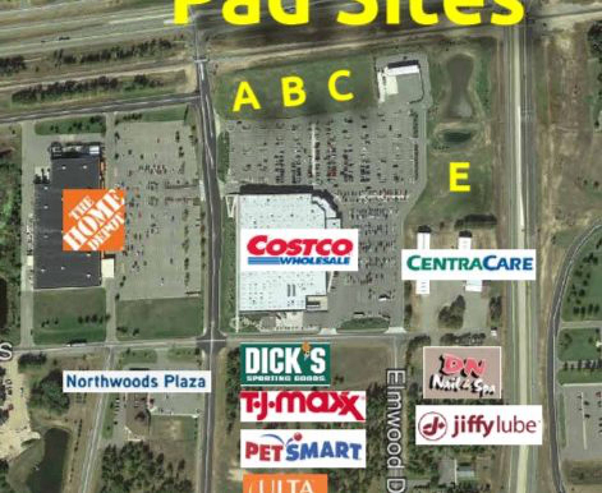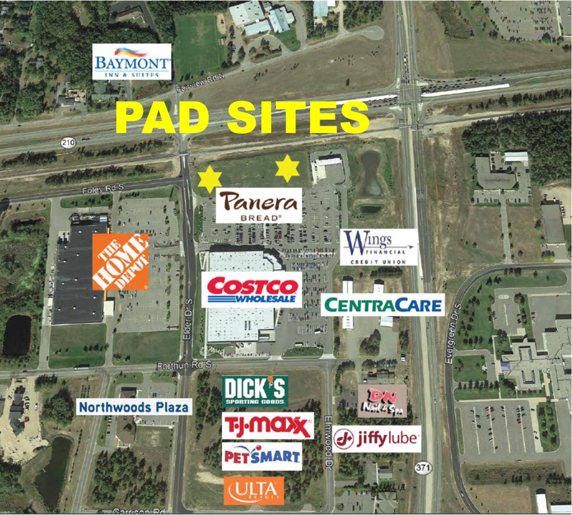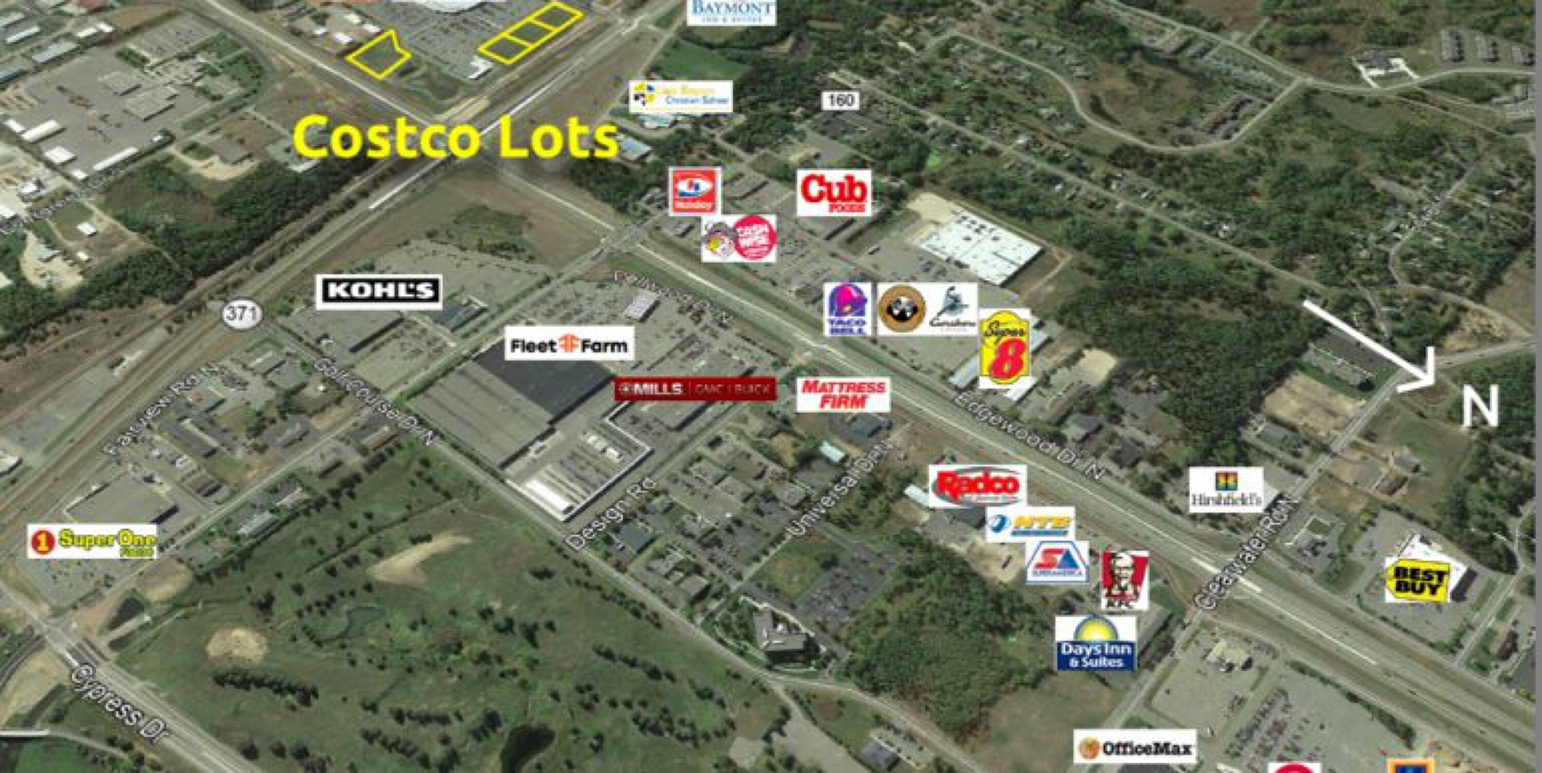 These desirable lots are located along a major commercial corridor in a neighborhood with numerous big-box retailers and medical services. The sites are located at the intersection of Hwy 371 and Hwy 210, providing high traffic counts, excellent visibility, and easy access. Existing improvements include off-site road improvements, pad and roadway upgrades, rough grading and soil import/export, and utilities stubbed to the property line. Storm ponds are installed and hooked up, with roughly 3-4 acres on the corner dedicated to storm water treatment. A perimeter driveway is in place, shared with Costco, and a perimeter right-of-way is dedicated. The lots are located in front of Costco. Other nearby businesses include Panera, CentraCare Health Systems, Wings Financial, DN Nails, Jiffy Lube, Home Depot, Dick’s Sporting Goods, TJ Maxx, PetSmart, Ulta Beauty, Home Goods Hobby Lobby, El Tequila, Walmart, Zips, Discount Tire, Northwoods Plaza, Riverstone Center, MidMN Fed CU, North Medical Supply, Crosby Regional Medical Center, Minneapolis Heart, Essentia Baxter Clinic, Surgery Center, Nystrom & Associates, Kohls, Fleet Farm, and Cub Foods.