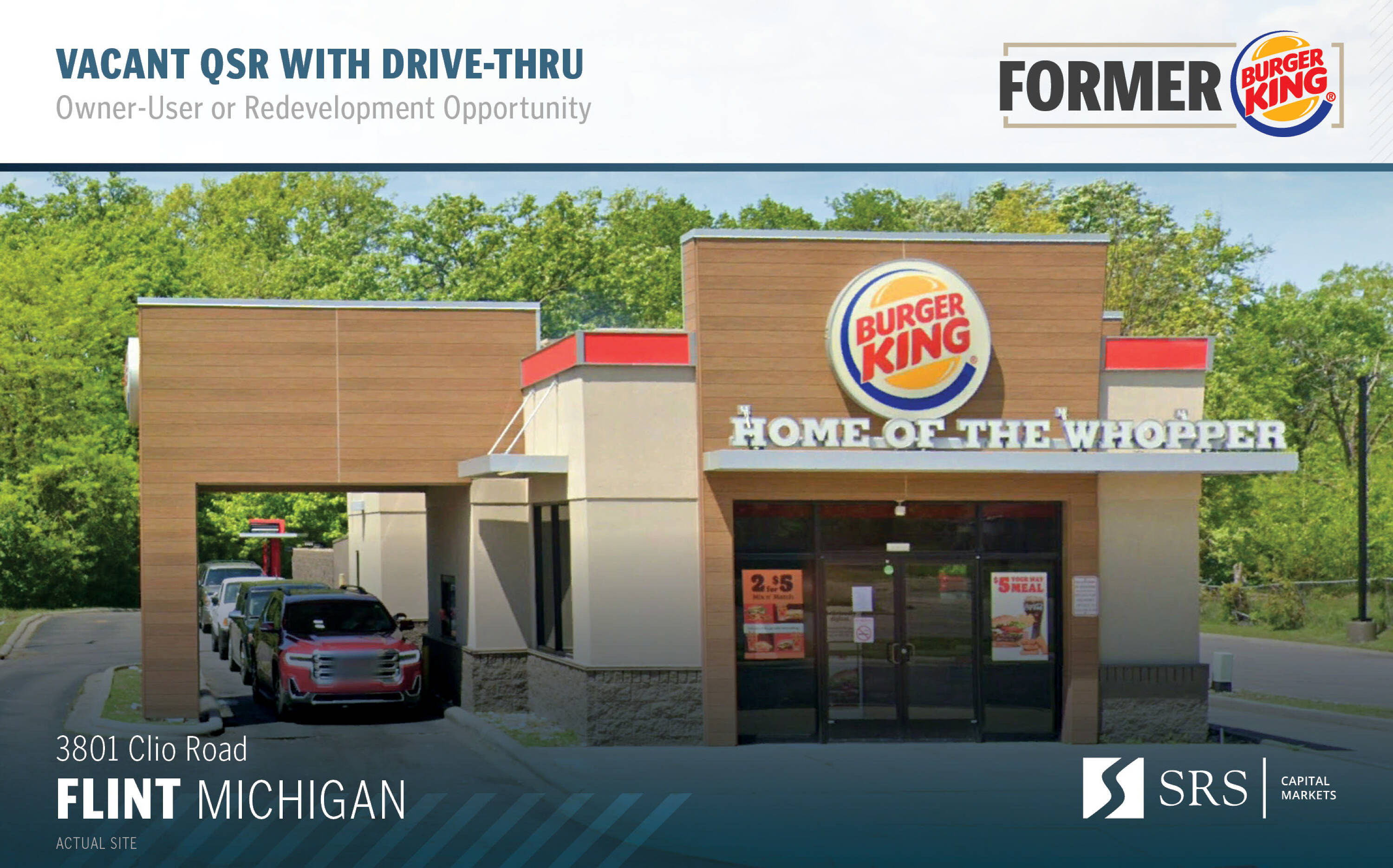 Retail space with drive-thru, high visibility, and redevelopment potential.