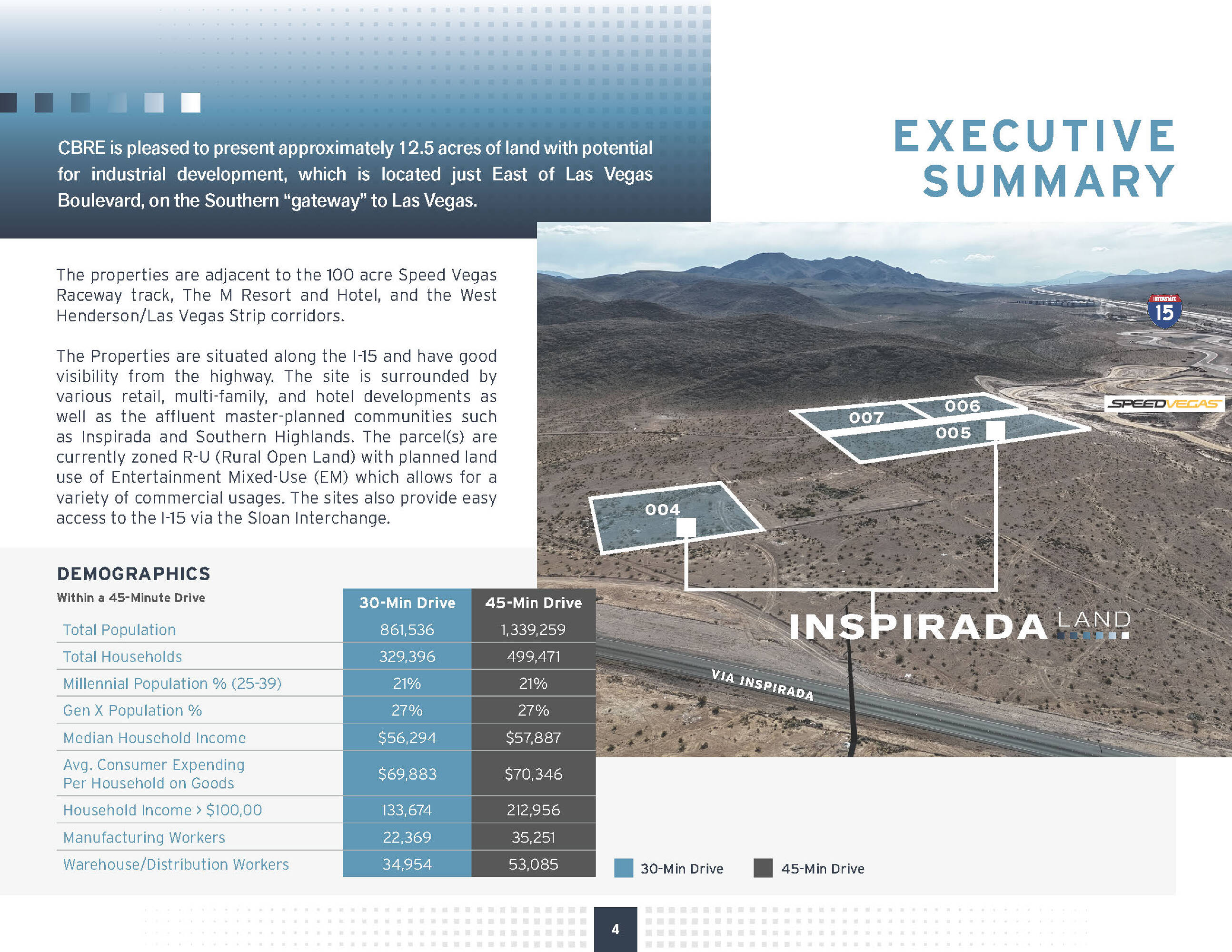 This offering consists of approximately 12.5 acres of land with potential for industrial development. The property is located just east of Las Vegas Boulevard, on the southern gateway to Las Vegas. It is adjacent to the 100-acre Speed Vegas Raceway track and The M Resort and Hotel. The site is near the West Henderson and Las Vegas Strip corridors. Situated along I-15, the property benefits from good visibility from the highway. The surrounding area includes various retail, multi-family, and hotel developments, as well as master-planned communities such as Inspirada and Southern Highlands. The parcel is currently zoned R-U (Rural Open Land) with a planned land use of Entertainment Mixed-Use (EM), which allows for a variety of commercial usages. The site provides easy access to I-15 via the Sloan Interchange.