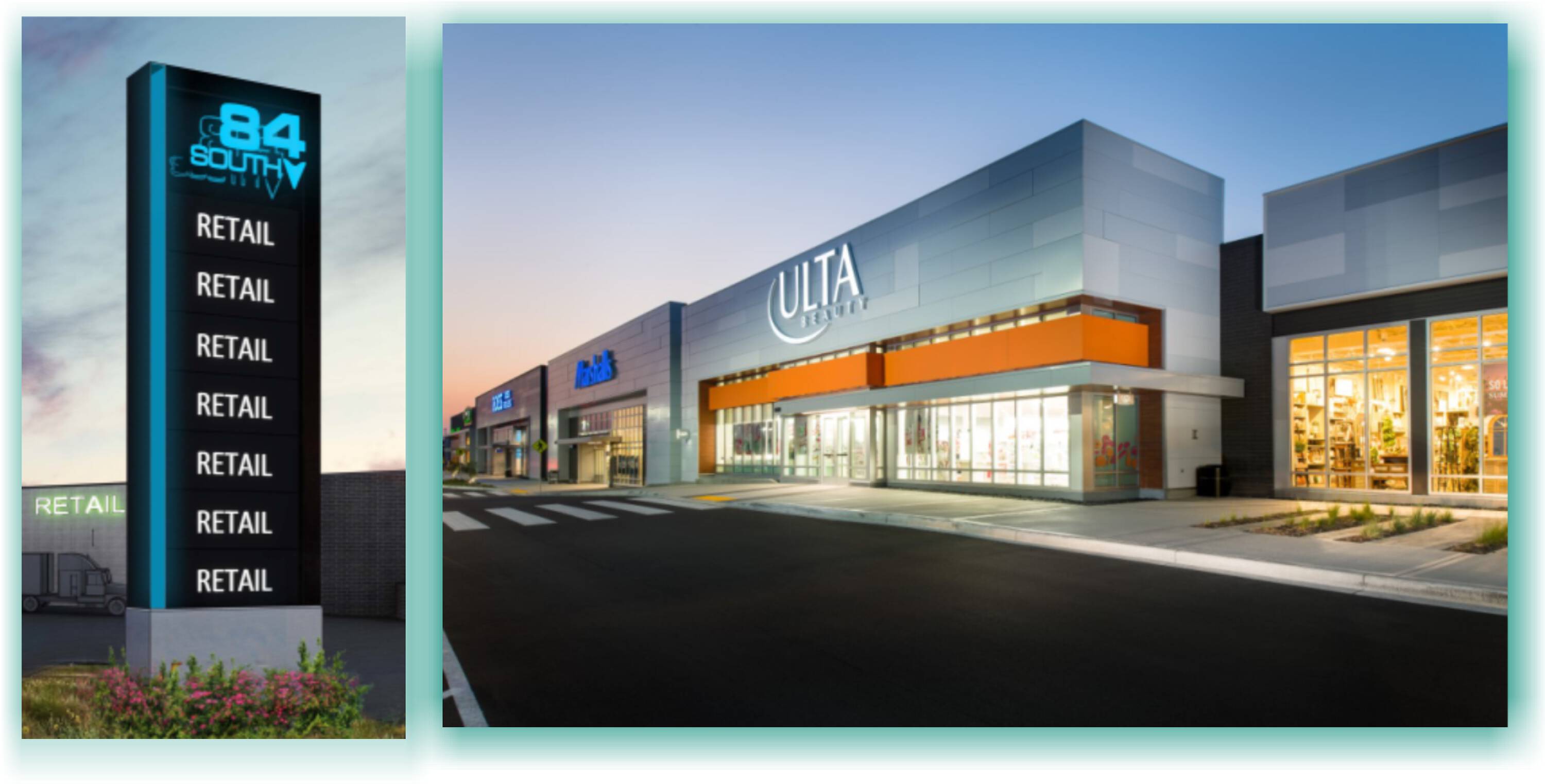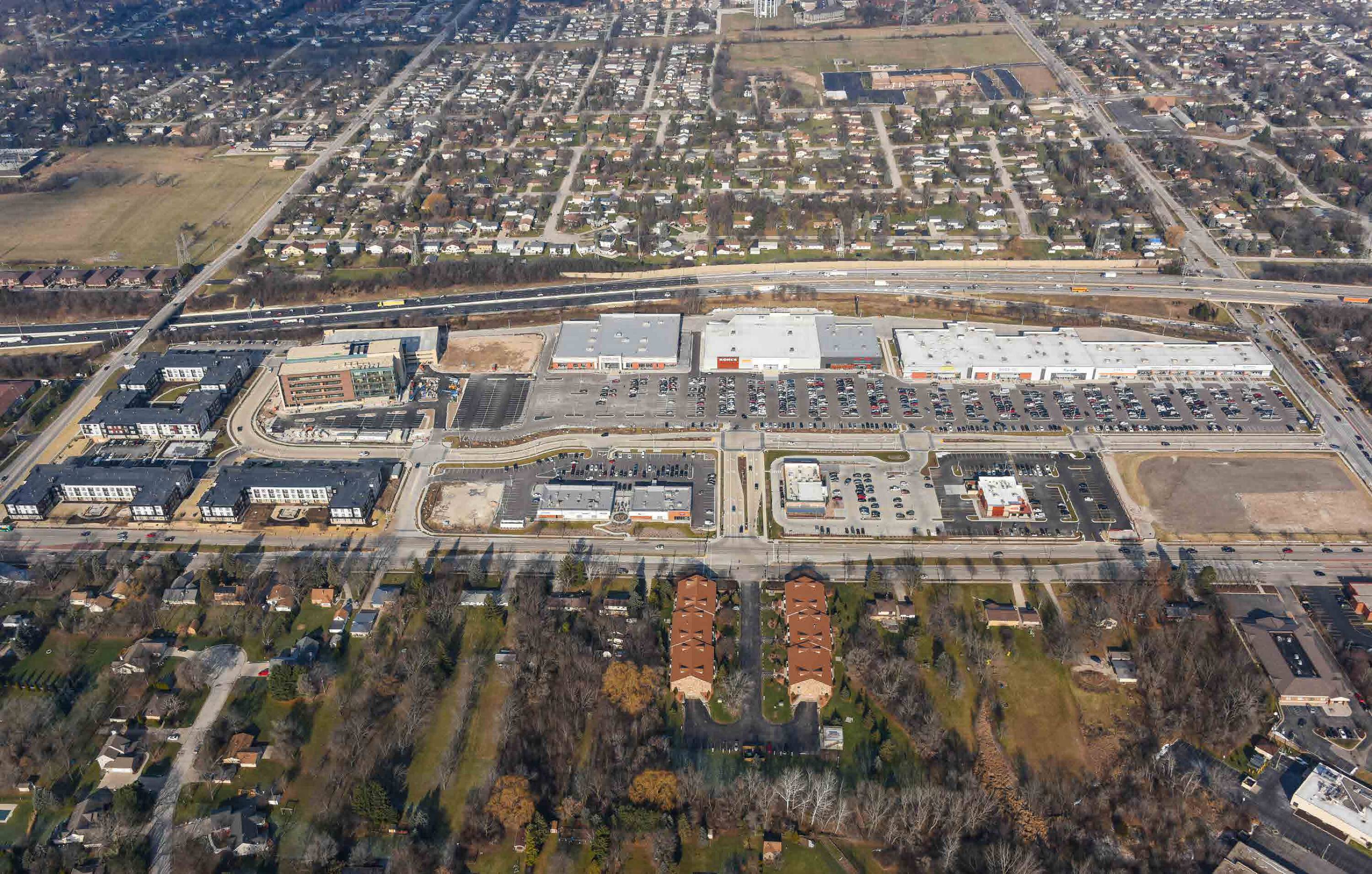 Mixed-use development with retail, restaurant, medical, and residential spaces.