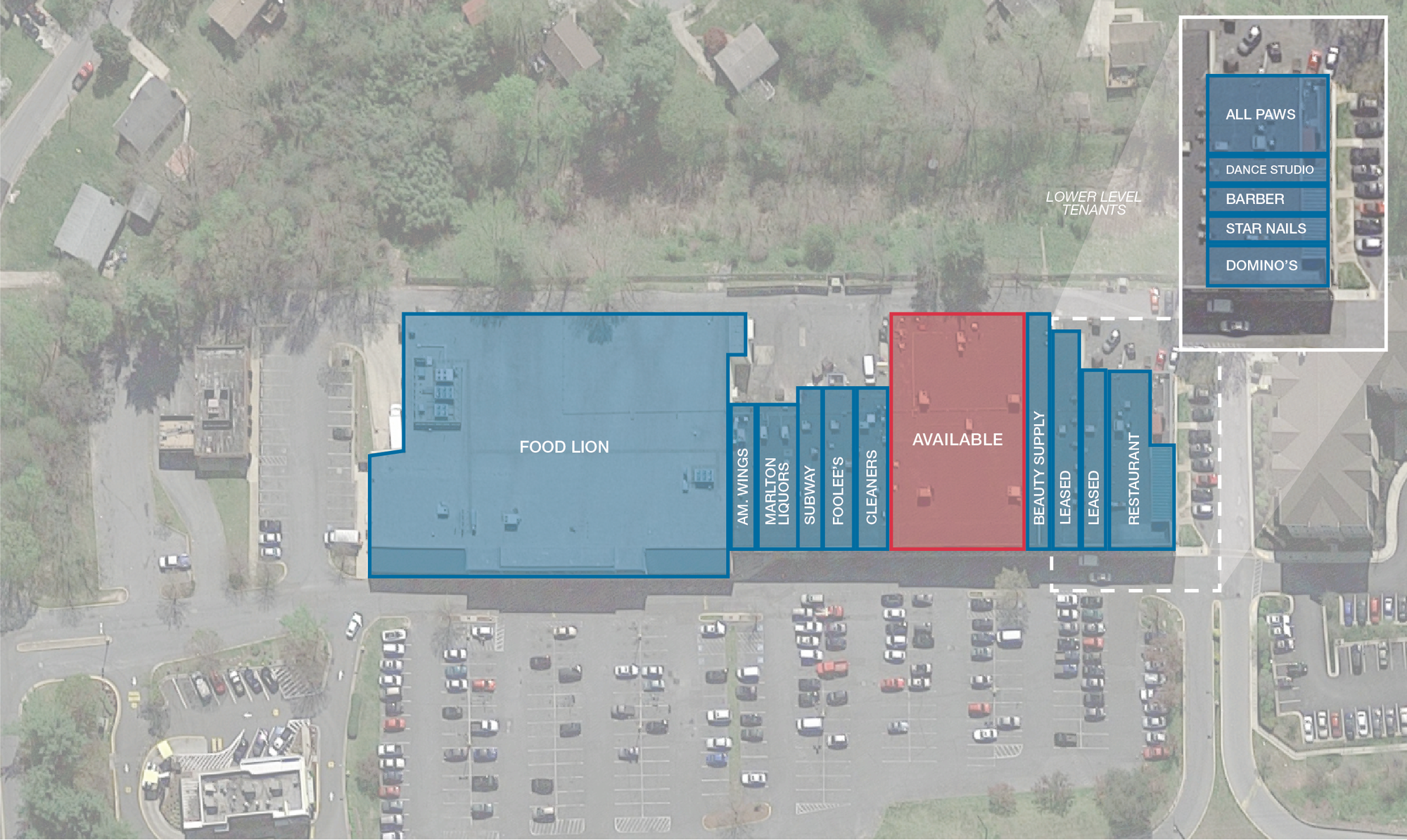 Highly visible shopping center anchored by Food Lion, Walgreens, McDonalds.