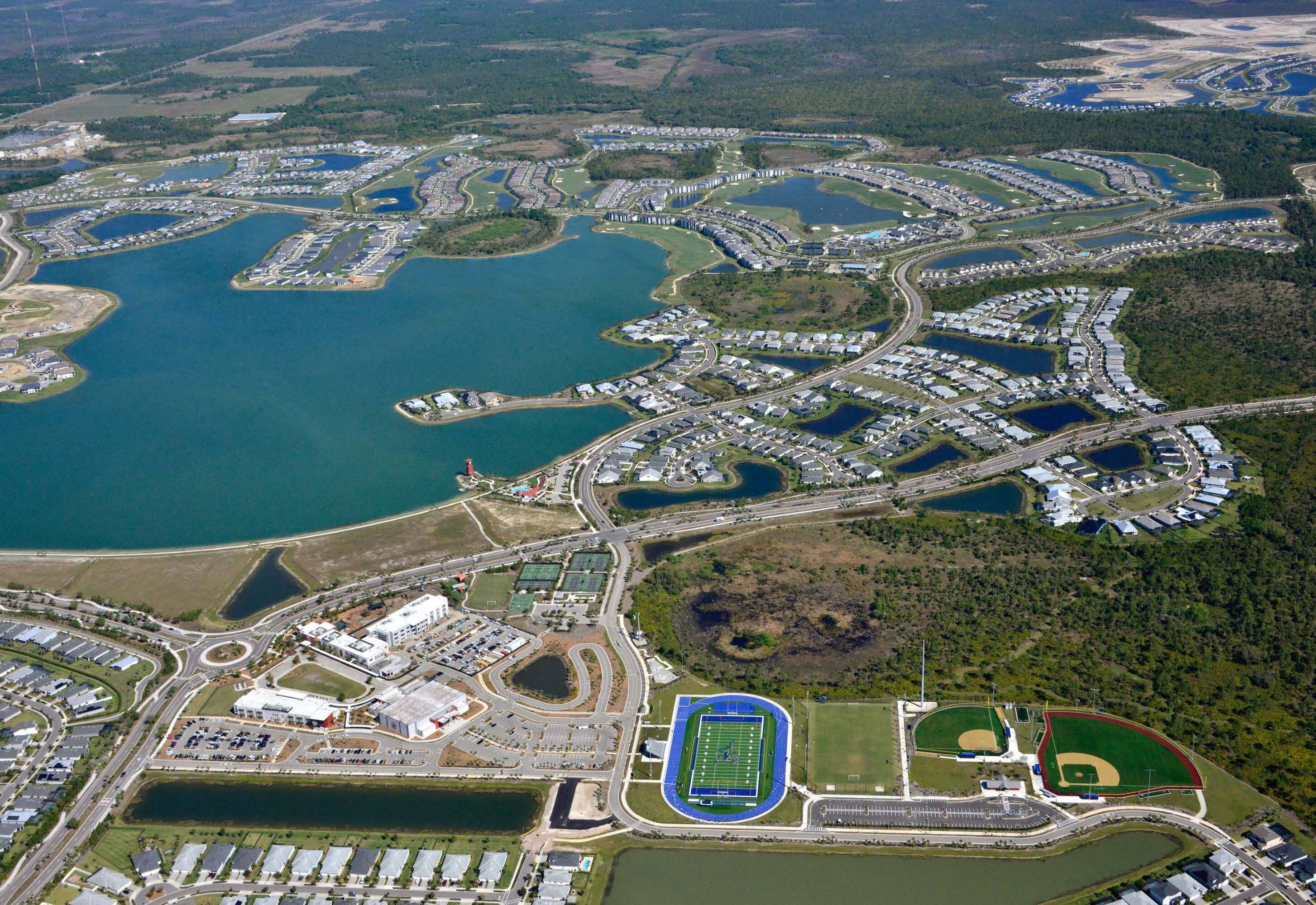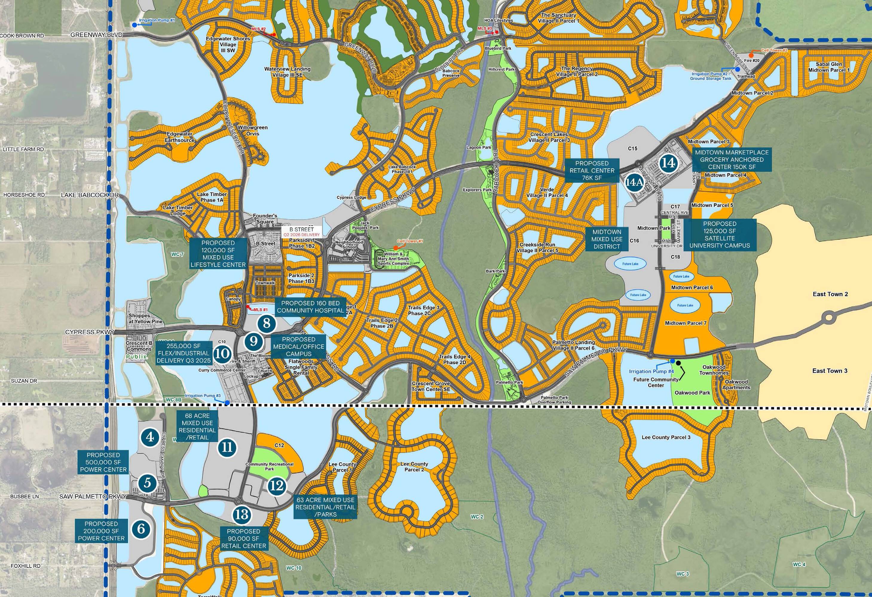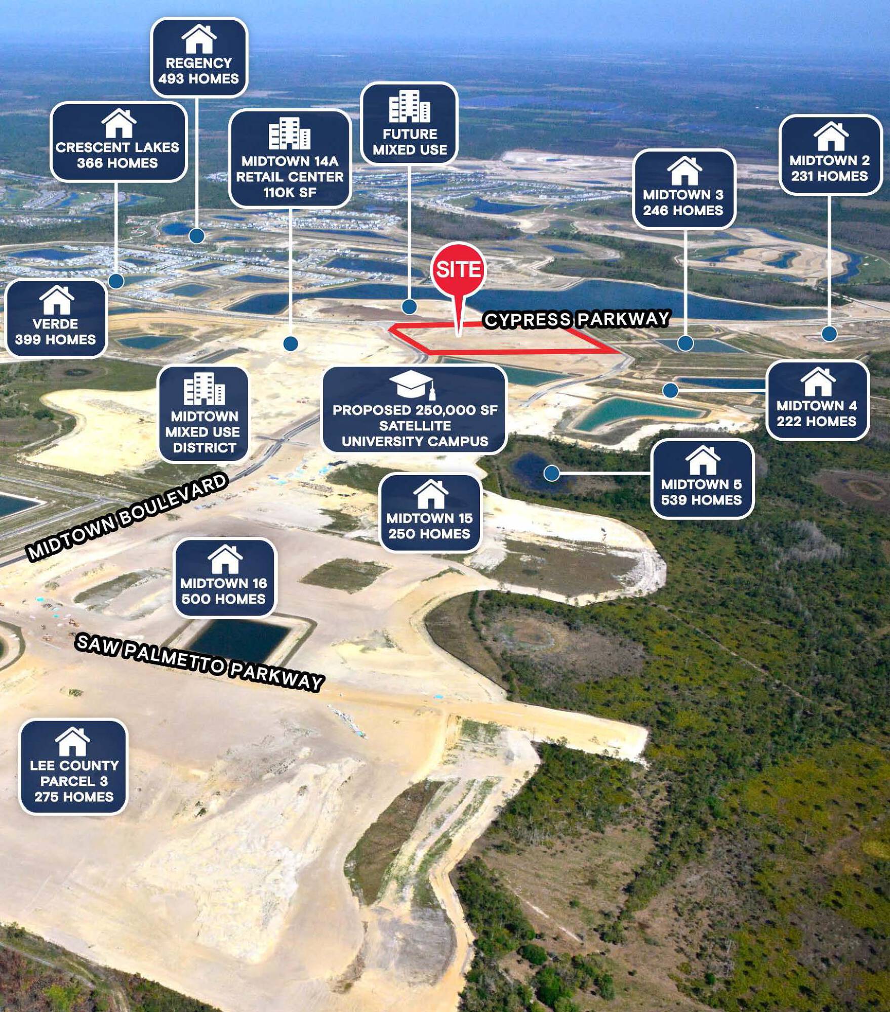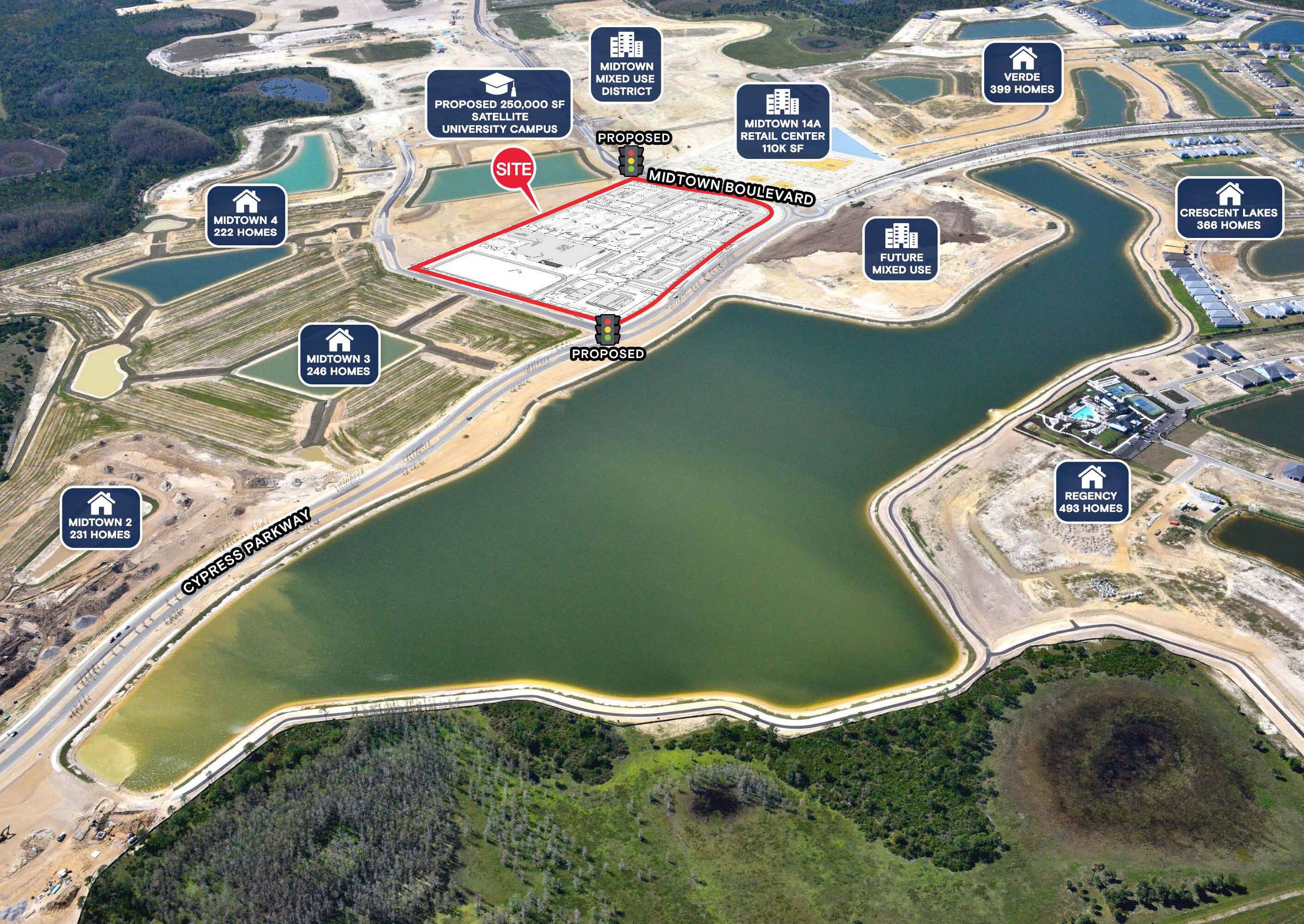 This commercial real estate offers 29 retail spaces available for lease. The spaces range in size from 1,110 square feet to 4,200 square feet. The property is located on Cypress Parkway in Babcock Ranch, Florida.