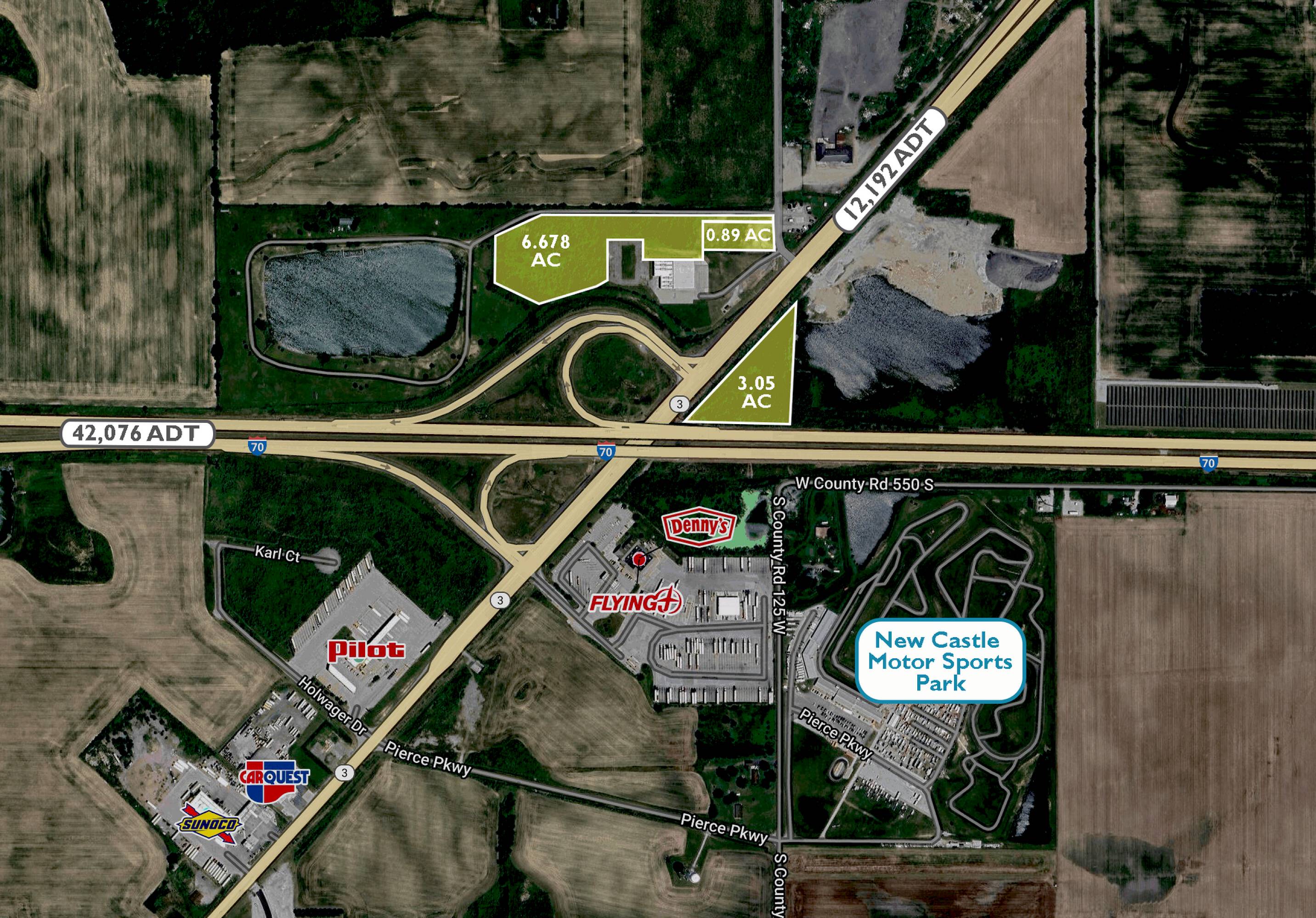 Three individual parcels of land, totaling 10.6 acres, are available for purchase. Located just off I-70 in New Castle, Indiana, these parcels can be purchased together or separately. All three parcels benefit from high visibility from I-70, which sees an Average Annual Daily Traffic (AADT) count of 42,076.