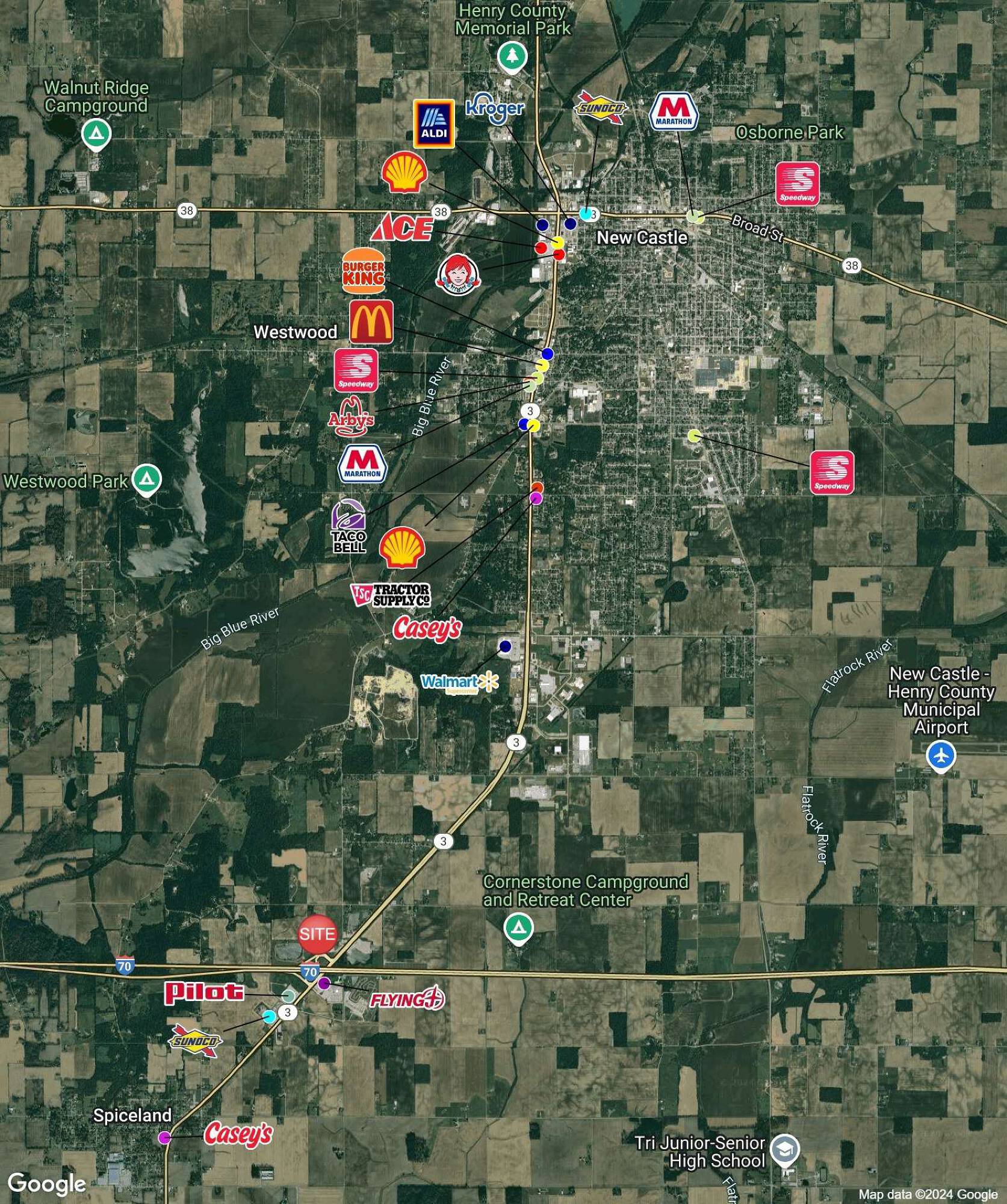 The property is located at 5223 IN-3 New Castle, IN.
