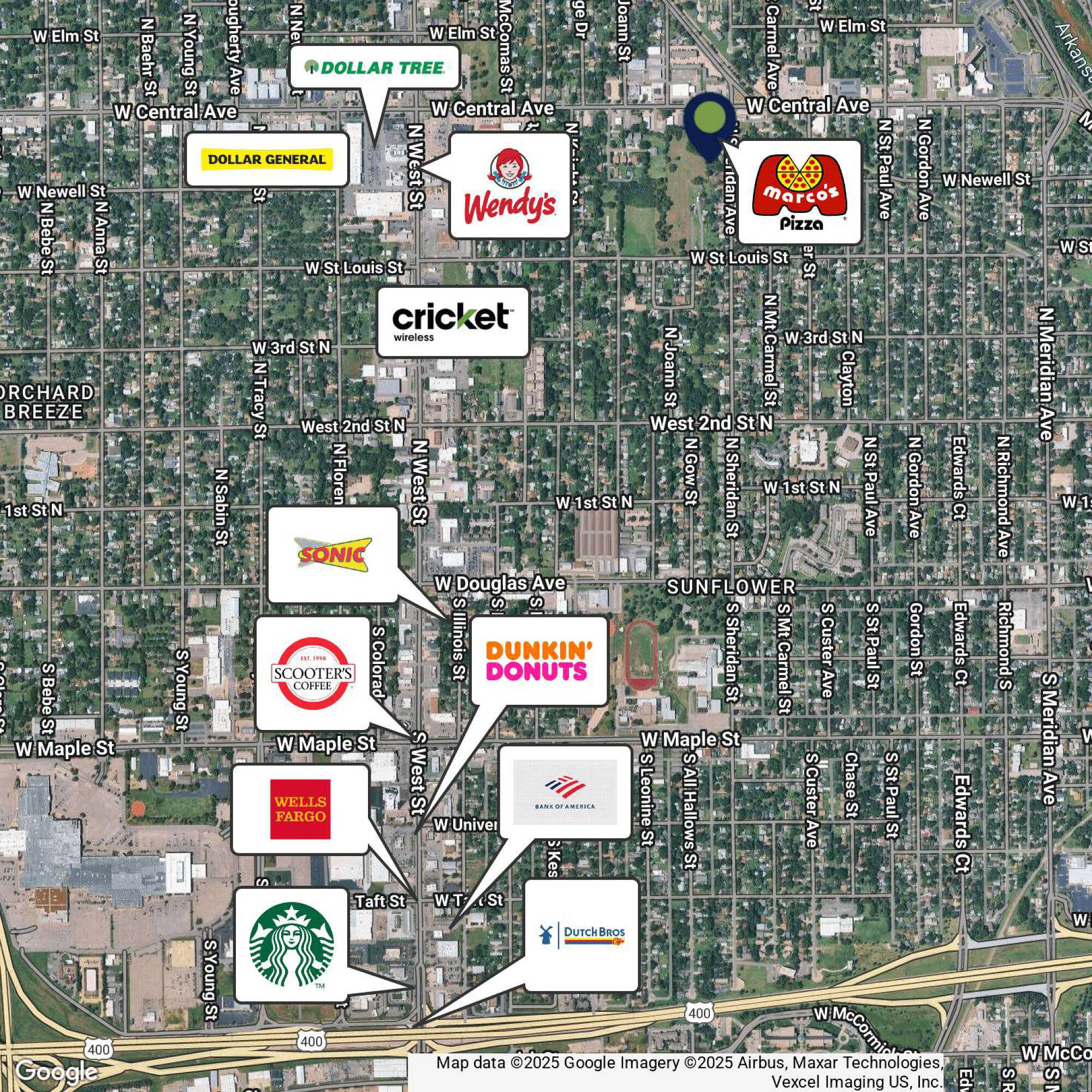 The property at 3305 W. Central, Wichita, KS, is situated in a bustling retail district. The location offers access to major roadways and a diverse array of shopping centers, restaurants, and entertainment venues, making it suitable for a Retail/Strip Center tenant. The Central and West Shopping Center and Riverside Park are nearby. The area features a mix of residential neighborhoods and commercial activity.