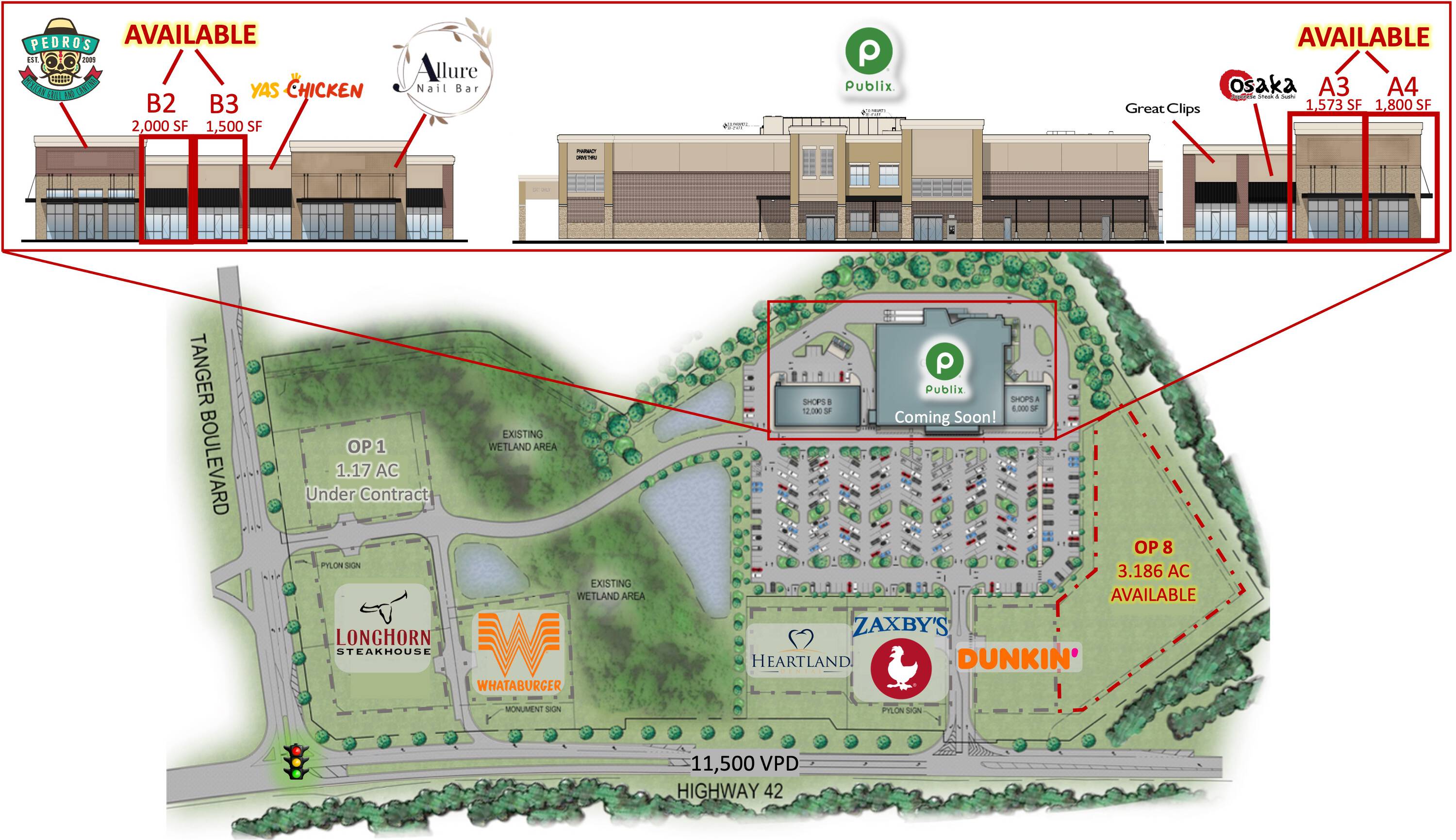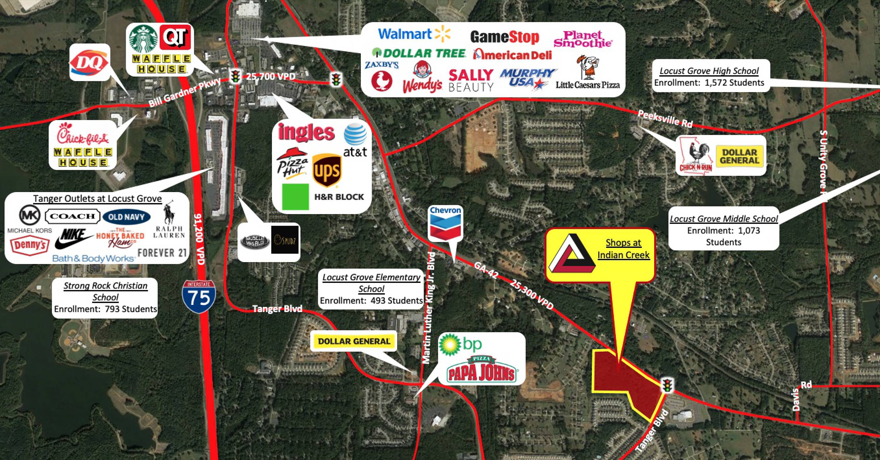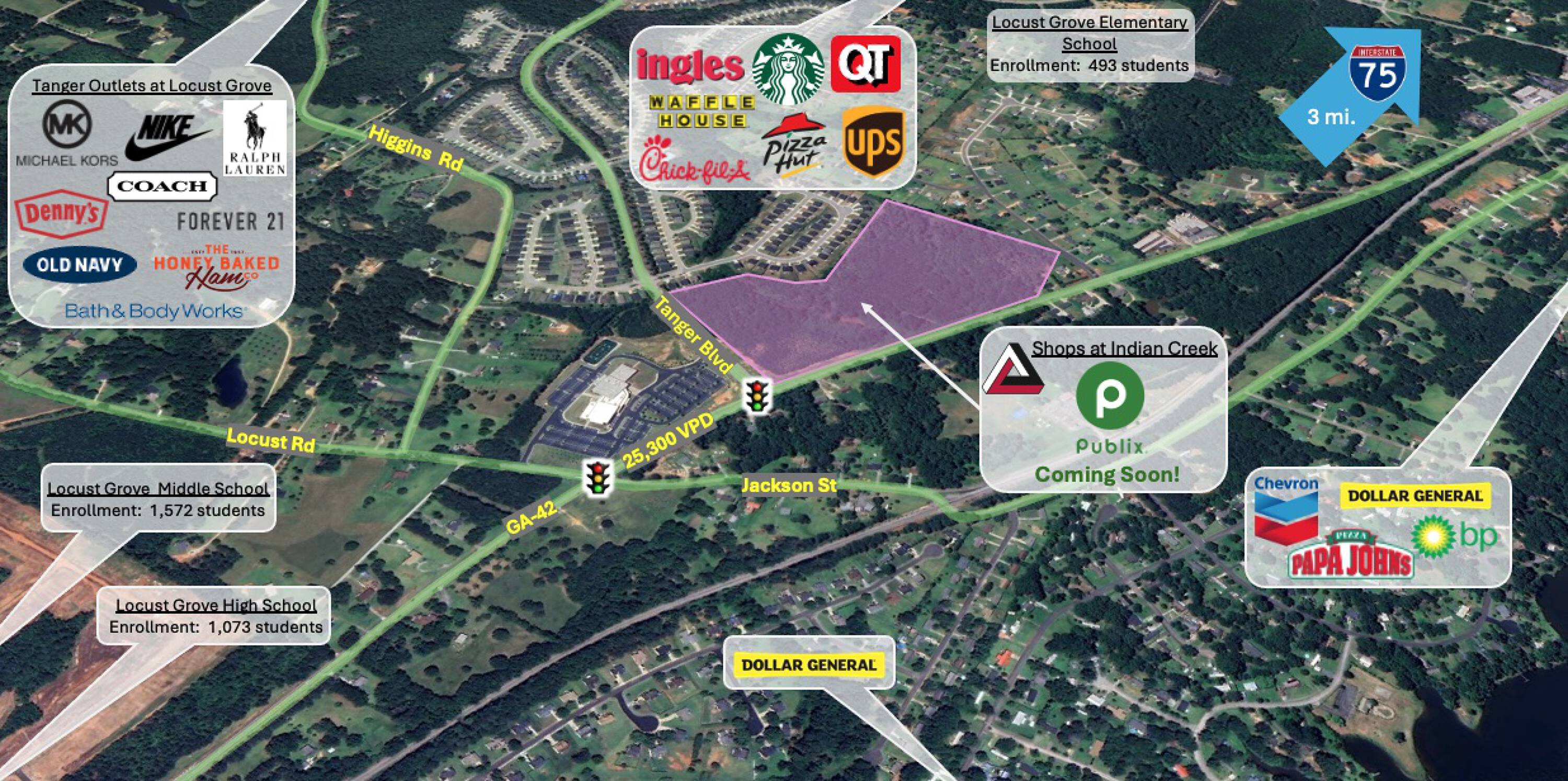 This property features: Publix‑anchored shopping center delivering Q4 2025; New traffic light approved for GA 42 and Tanger Blvd intersection; Located 2.5 miles from Tanger Outlets Locust Grove (4 million annual visitors)