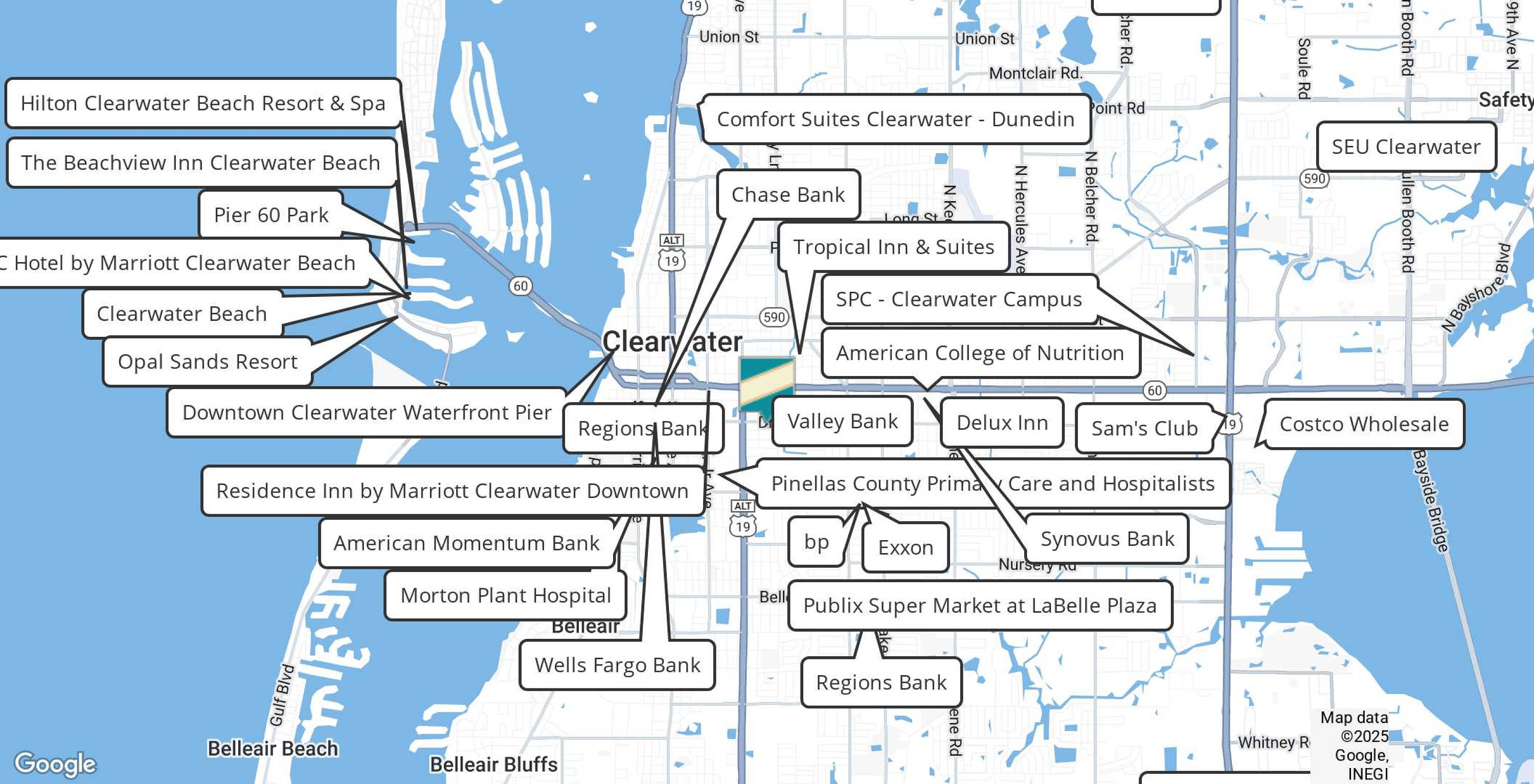Office spaces are available for rent in Clearwater, Florida, with lease rates starting at $750 per month. There are no hidden NNN fees, and tenants are responsible for their own electricity. Water is provided at no cost. The building features two oversized parking lots located on the west and east ends. The property is situated approximately 3.6 miles from Clearwater Beach, which offers a variety of restaurants, shops, and hotels. Clearwater Beach is a leading destination on the Gulf Coast, attracting over 6.5 million overnight visitors and contributing more than $4 billion to the economy. Downtown Clearwater is undergoing an $84 million waterfront development project called Imagine Clearwater, which includes a gateway plaza, park space, a pedestrian promenade, a playground with a splash pad, and a 4,000-seat covered amphitheater. The property is located 1.6 miles from Saint Petersburg College. The site is located within minutes of Morton Plant Hospital, HCA Florida Largo hospital, Mease Dunedin Hospital, HCA Florida Largo West, and assisted living facilities such as Twin Oaks ALF, Americus Total Care ALF, and Midway Manor. The area has a high daytime population of 124,793 within a 3-mile radius. Current tenants include an accounting/CPA office, a men's health doctor, a chiropractor, and other professional services. The property includes a courtyard and two ample parking lots.