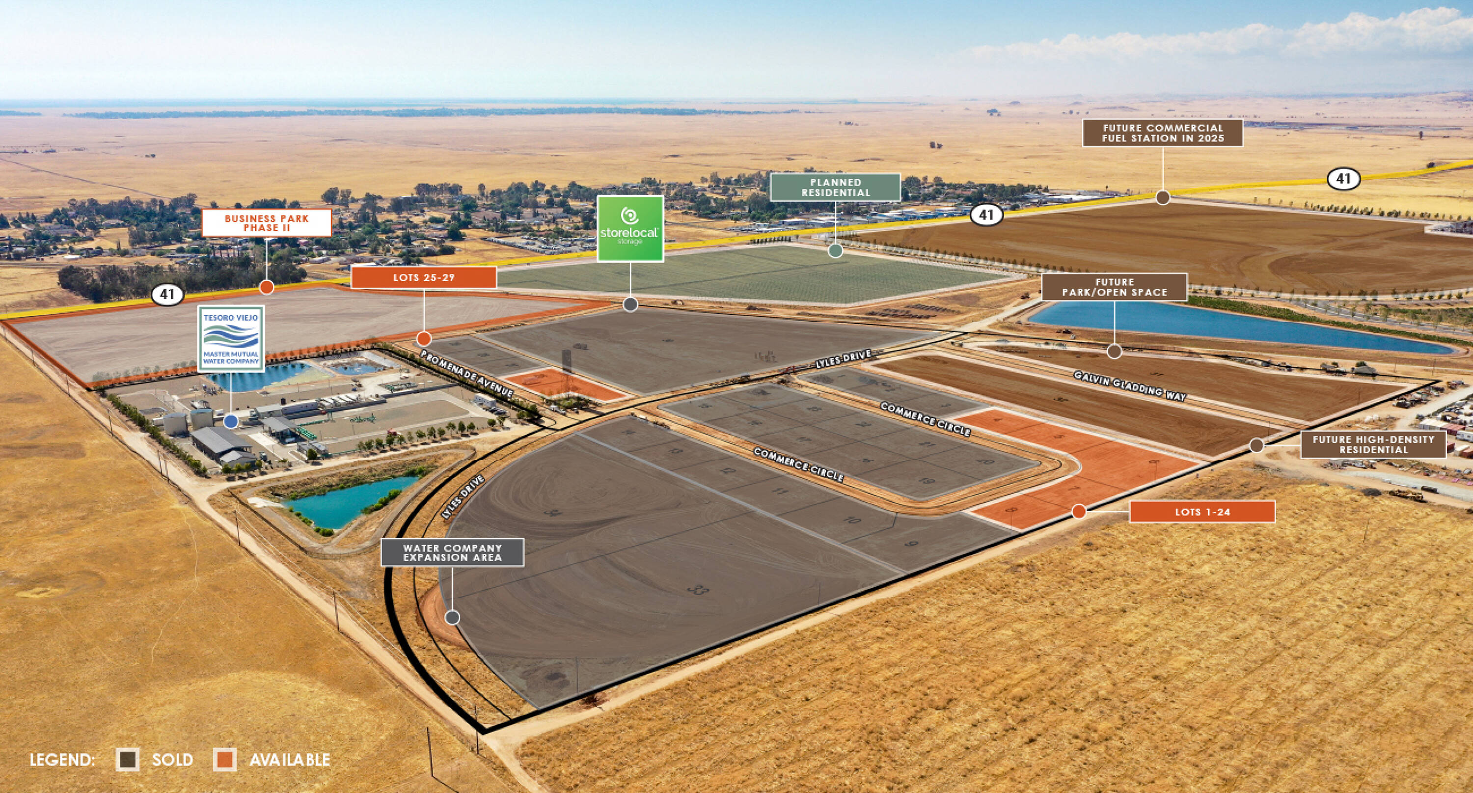 The Tesoro Business Park is part of the Tesoro Viejo Development Master Plan, offering a mix of light industrial uses with access to Highway 41. This development is planned to include up to 5,190 homes and approximately 3 million square feet of non-residential space. The business park aims to be a successful employment center, fostering a mixed-use environment where people can live, work, and play. Entitlements are underway for a self-service storage facility of approximately 166,300 square feet, featuring climate-controlled units and covered RV storage. Over 775 homes are currently occupied within the Tesoro Viejo community, with an anticipated 300 additional homes to be occupied each year. Tesoro Viejo is a master-planned community located in Madera, California, north of Fresno. Situated in the rolling hills of Central California, the community offers views of the Sierra Mountains, foothills, natural gorges, and preserved open space.