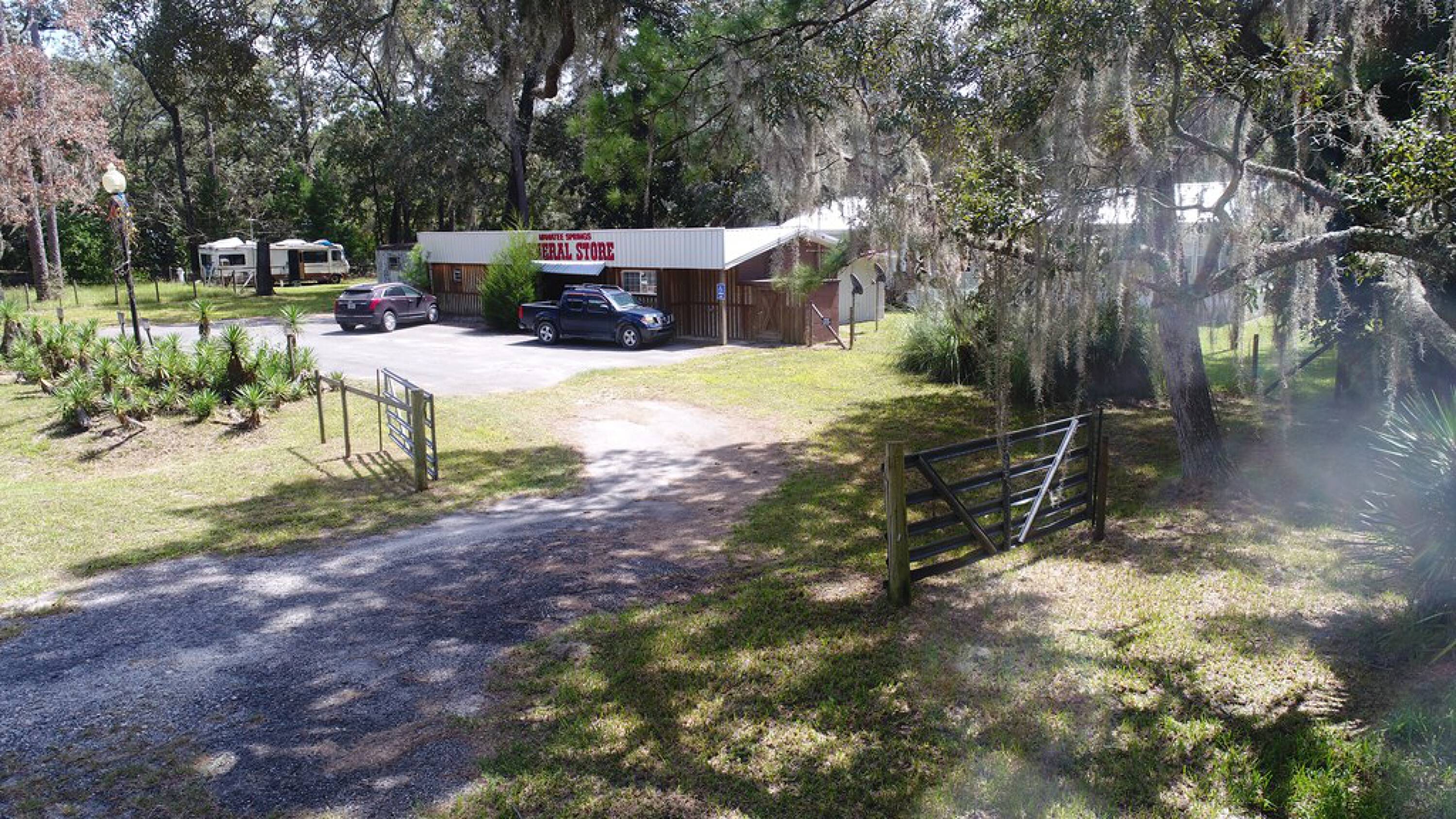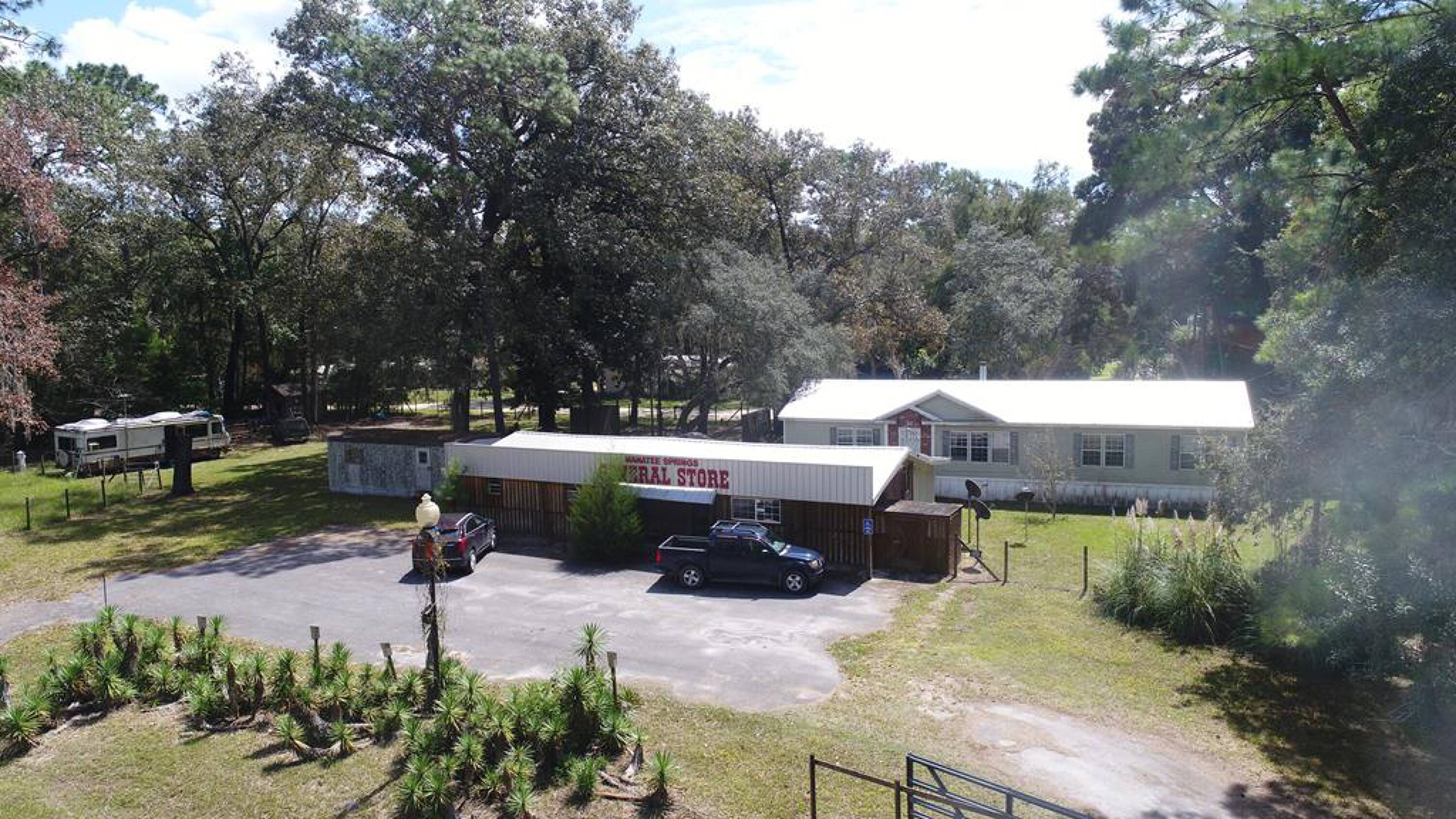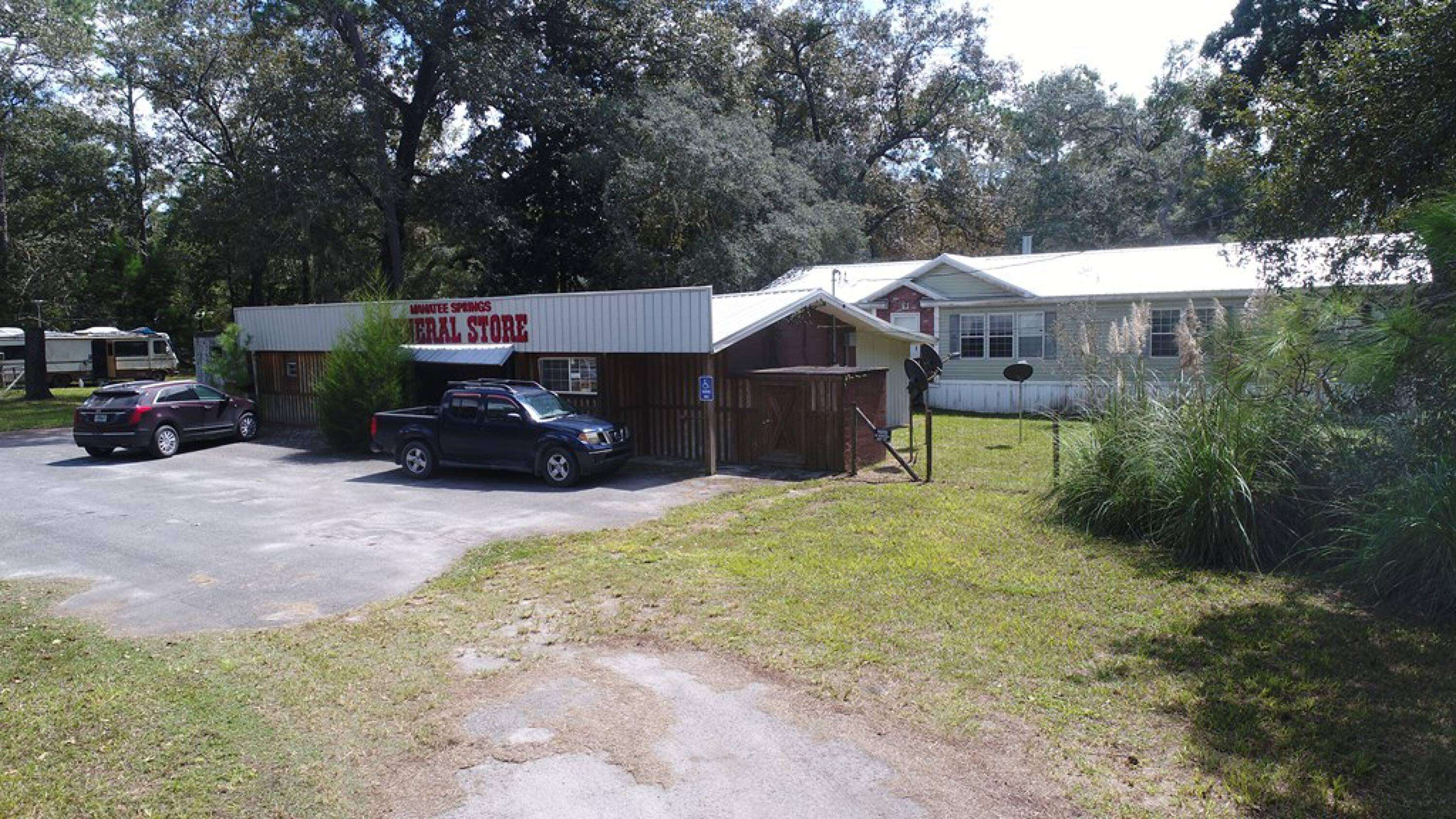 This mixed-use property is located just outside the entrance to Manatee Springs State Park on the Suwannee River. The property includes three RV hookups, a doublewide mobile home, and a concrete block building that was formerly operated as a general store. The general store has 1233 conditioned square feet and features a working walk-in cooler, retail area, shelving, and one full bath. Currently used as an office building, it offers flexible potential. The 2006 doublewide mobile home located behind the store has 1664 conditioned square feet with 3 bedrooms and 2 bathrooms, suitable for living or renting out. The property also features three full RV hookups on the left side. Both the store and mobile home have metal roofs. There are three electric meters, one for the store, one for the mobile home, and one for the RV hookups. The property is located on heavily traveled Hwy 320, adjacent to Springside Retirement Village and Hideaway Park. The zoning is rural mixed-use, with a list of permitted uses attached. The property is not in a flood zone. This property offers the opportunity to live on-site and run a business.