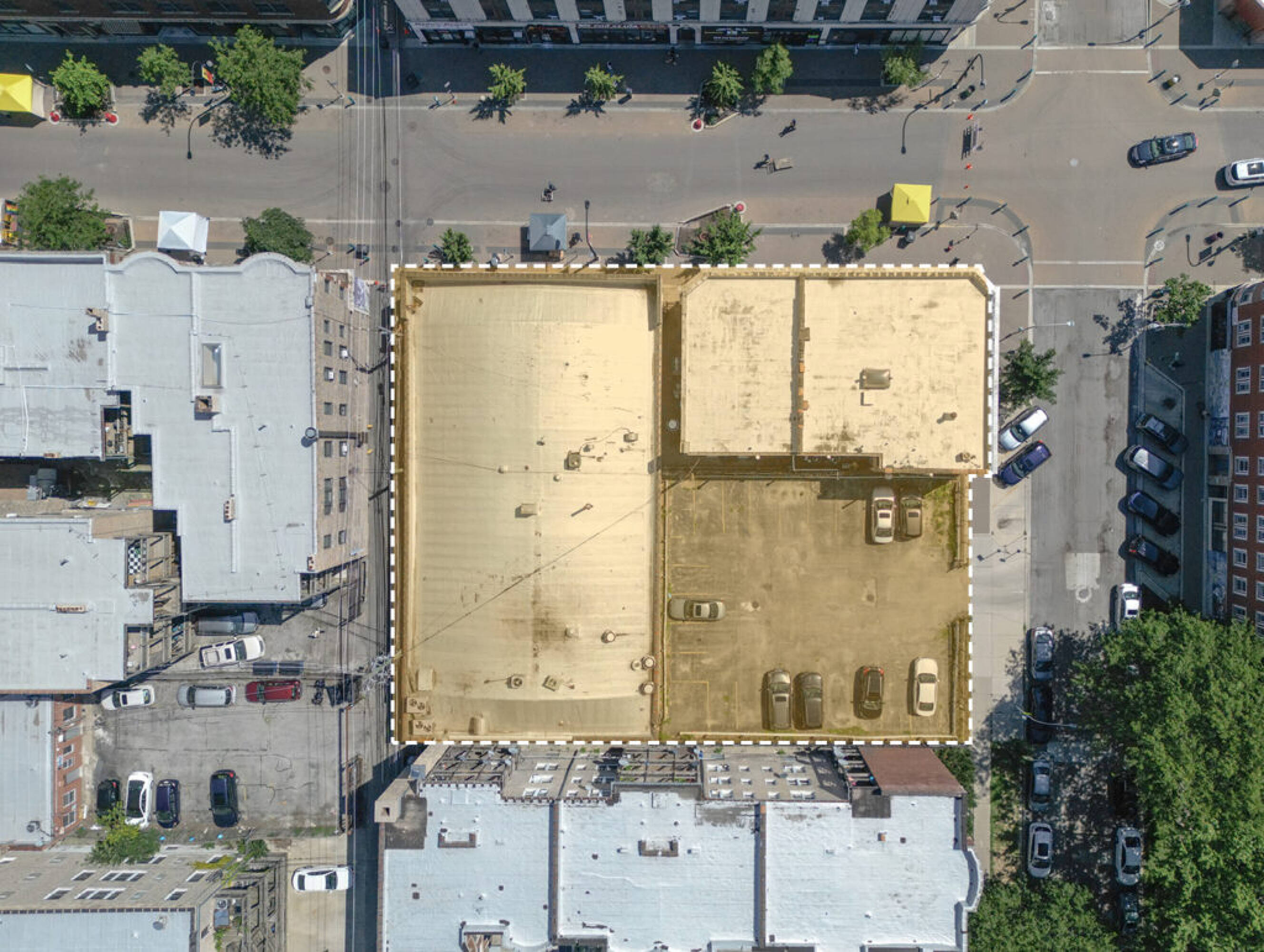 Fully occupied building with storefronts, restaurants, and office spaces.