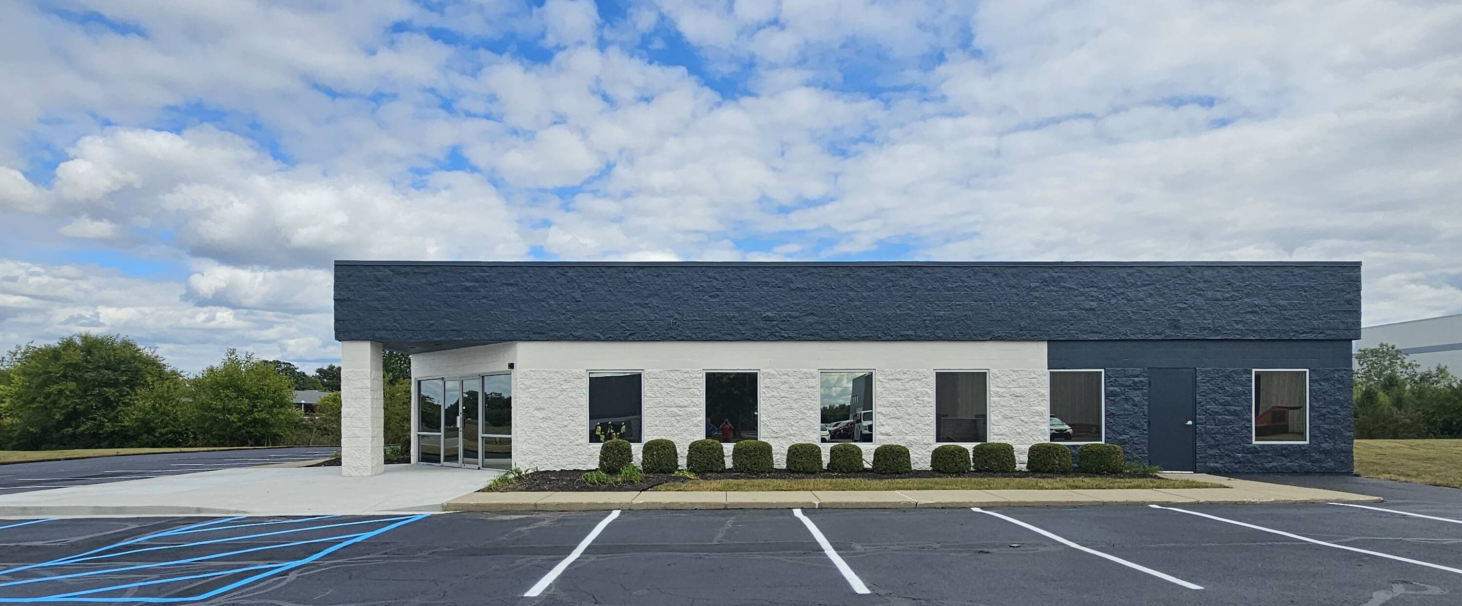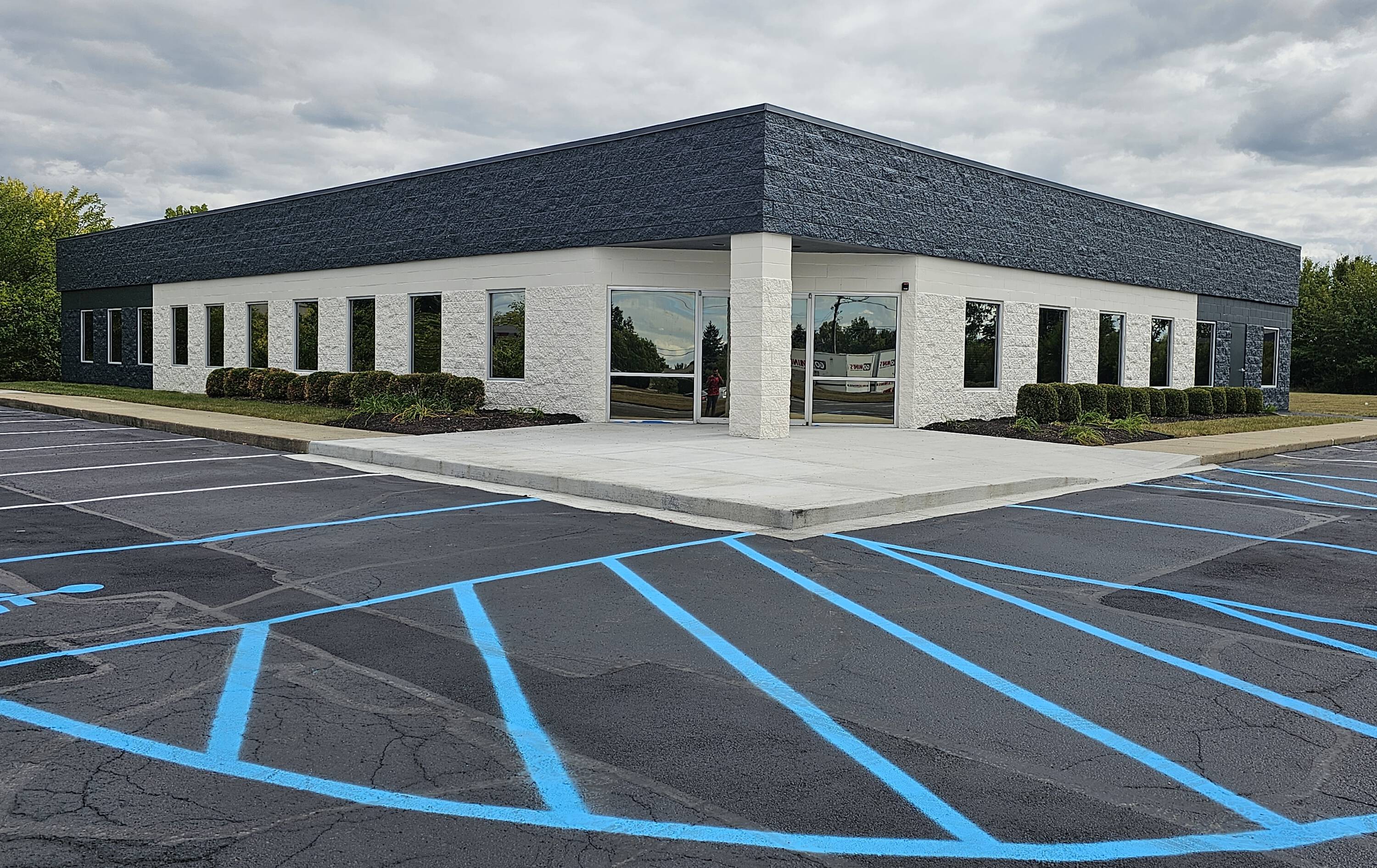Single-story commercial building with ample parking near downtown Fishers.