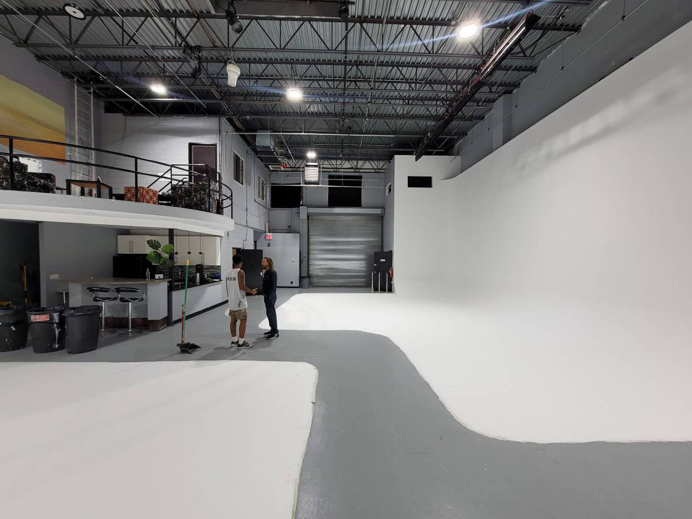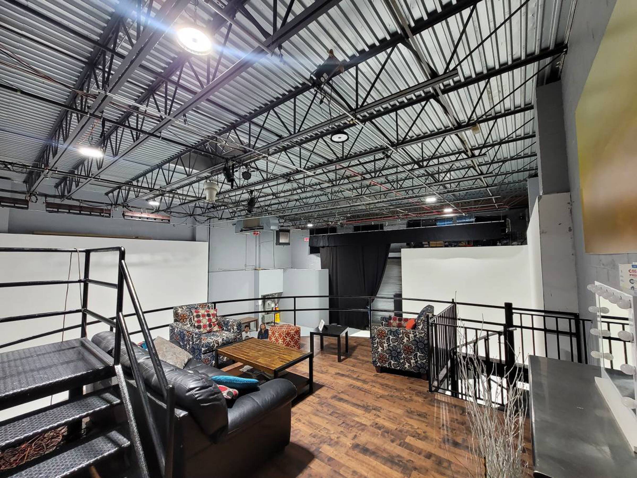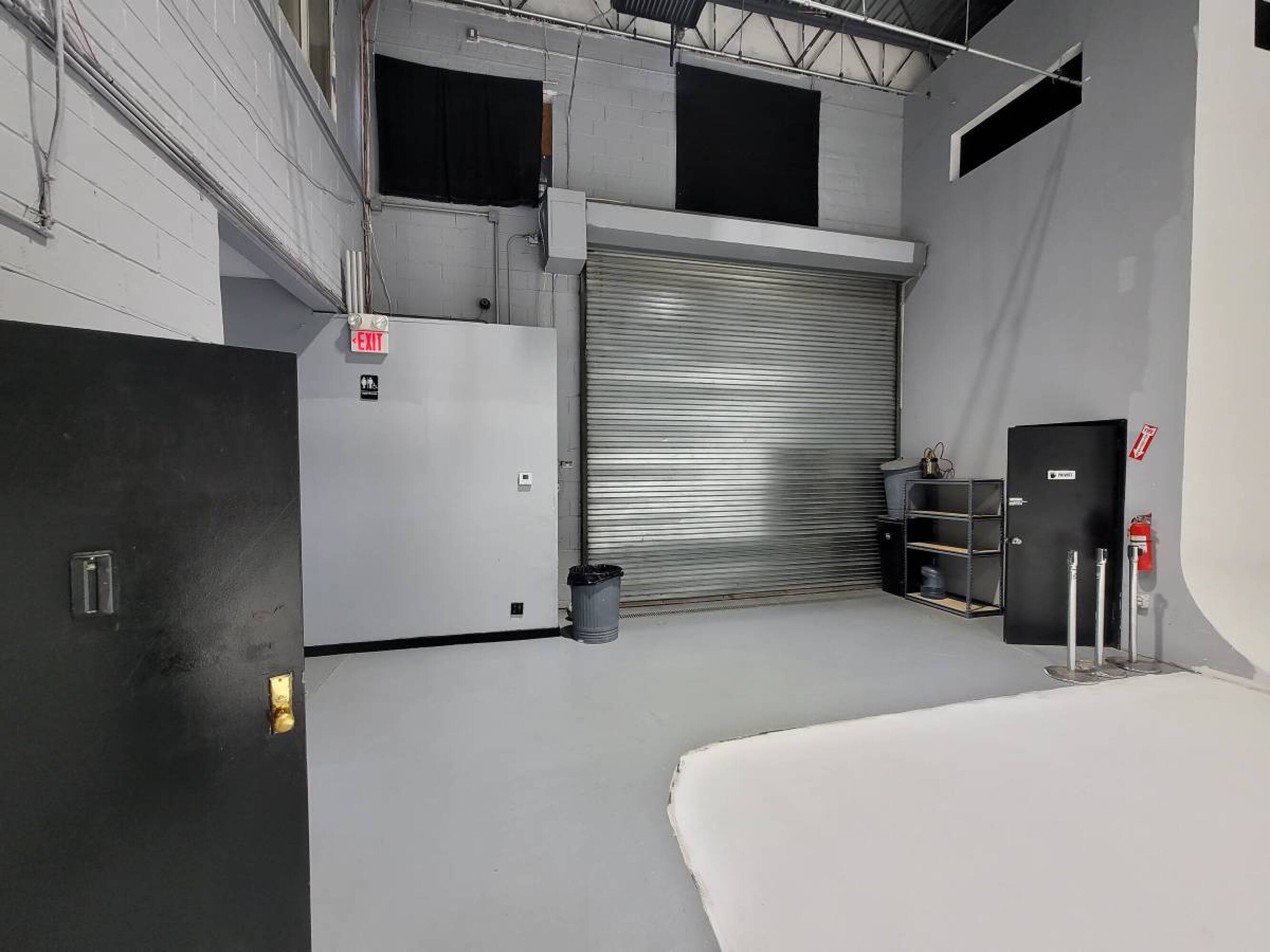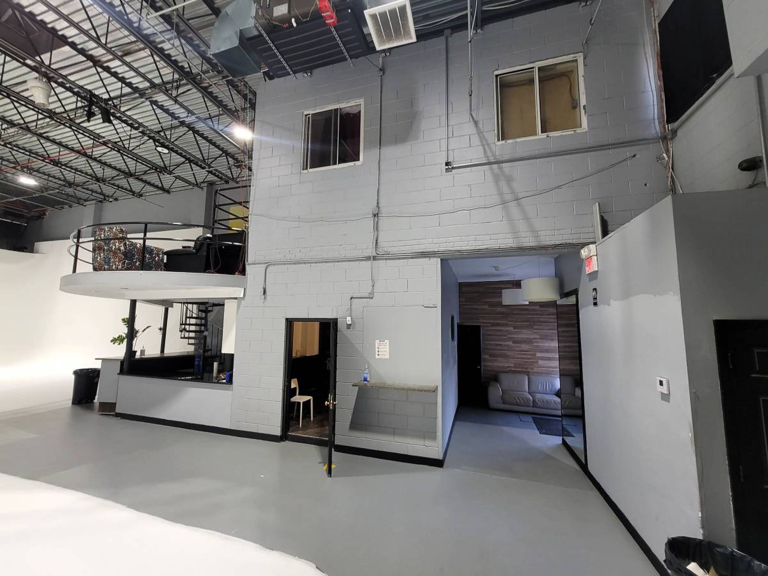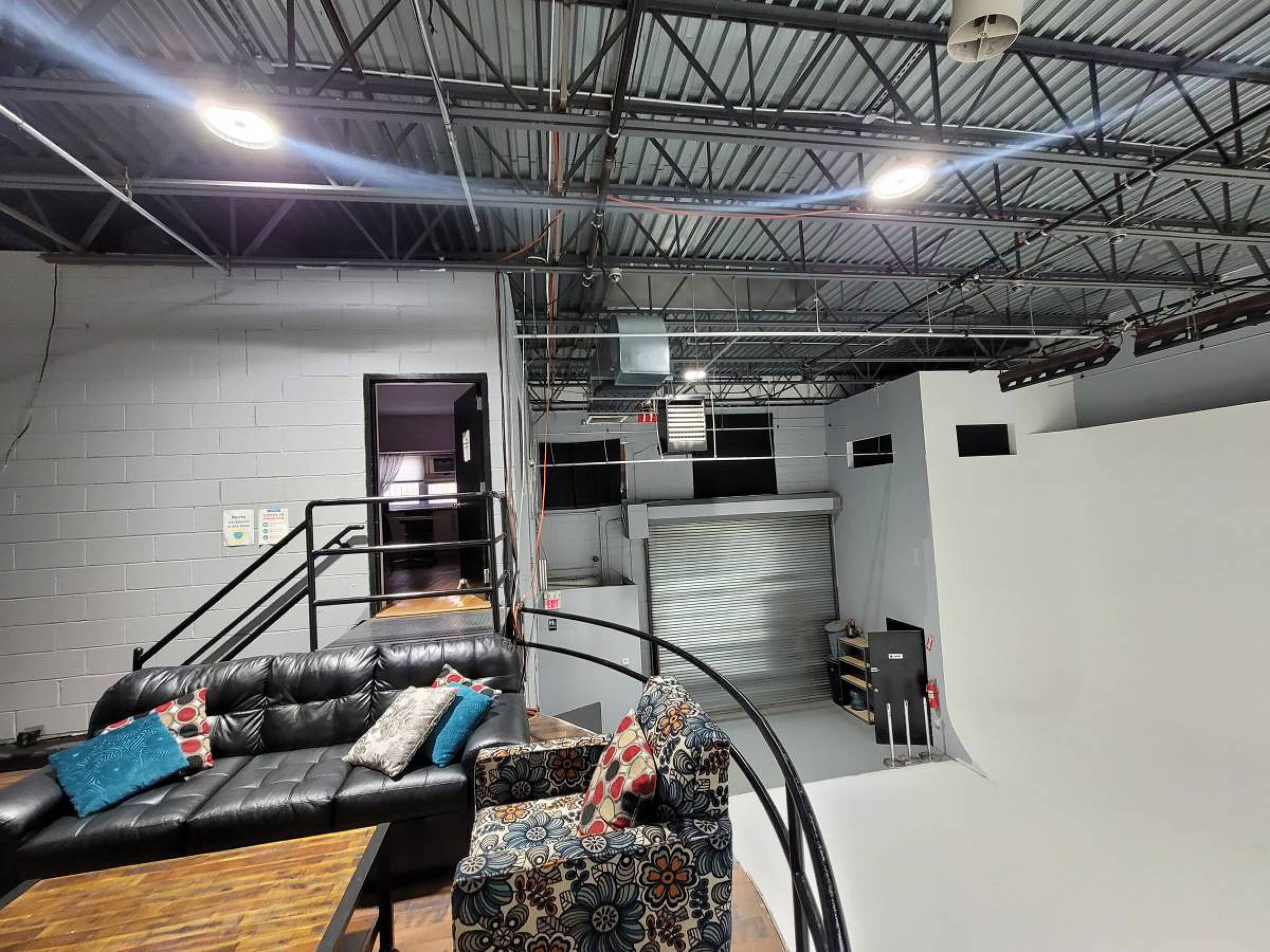 Versatile commercial space with high ceilings, kitchen, and drive-in gates.