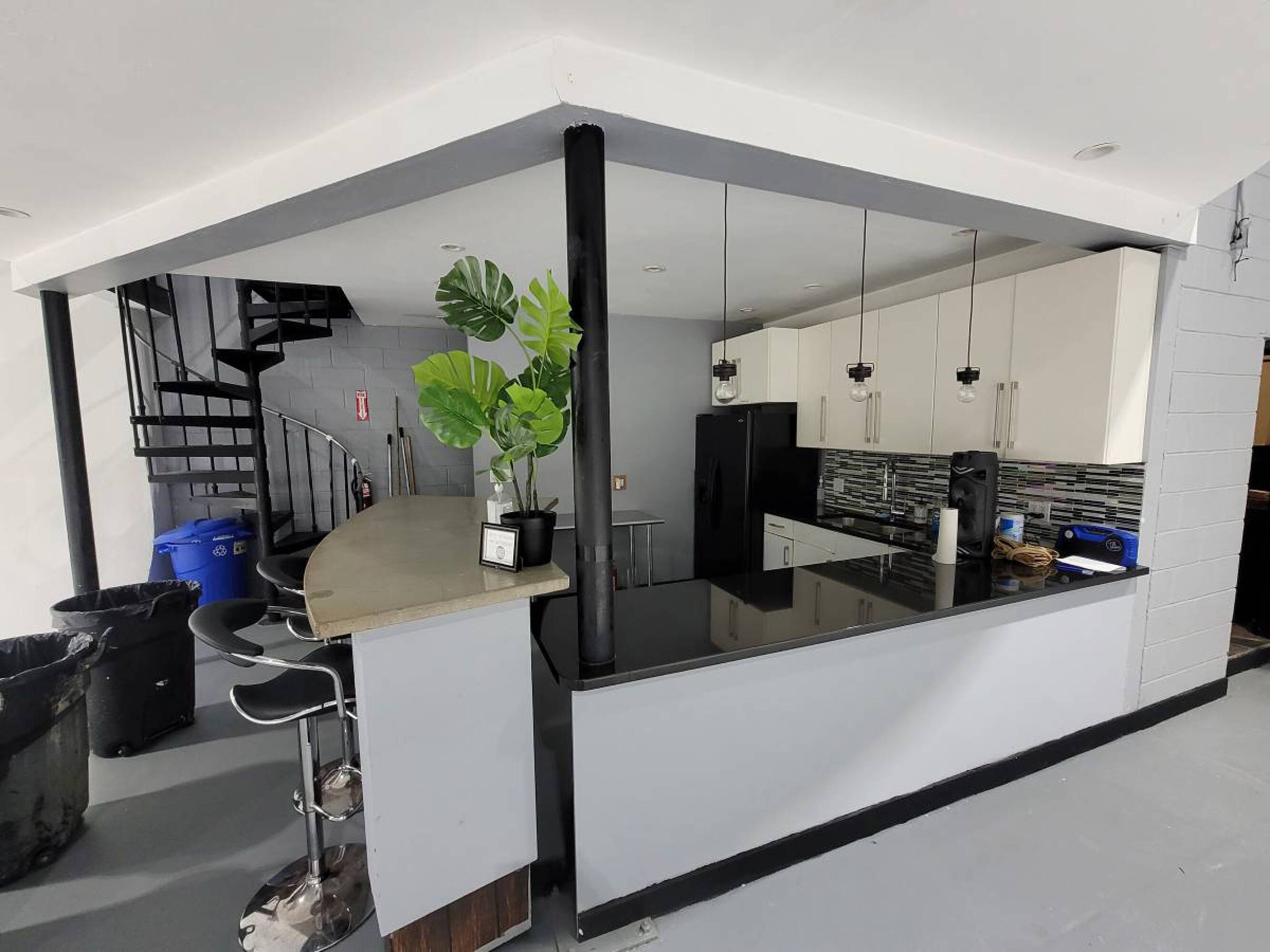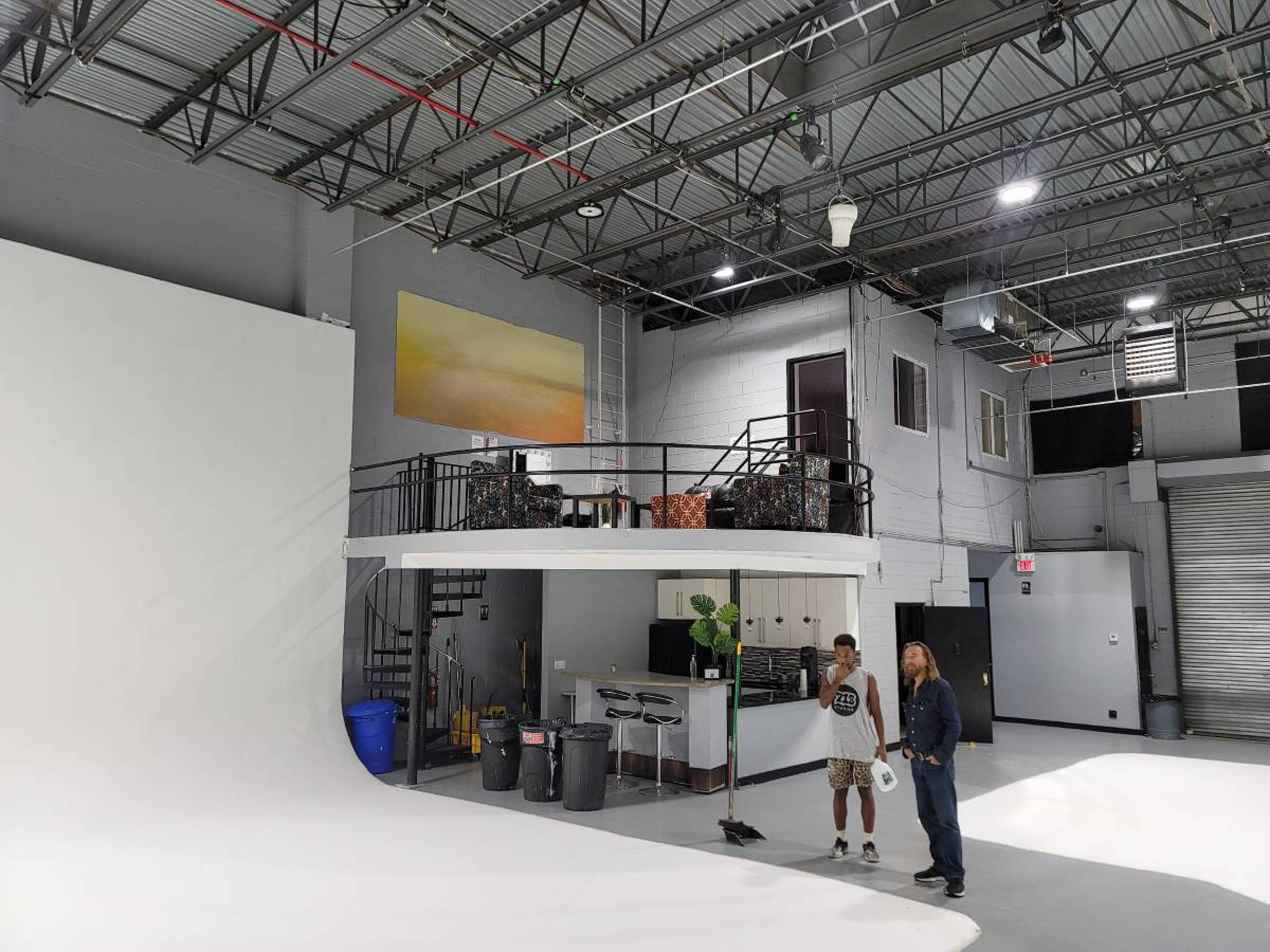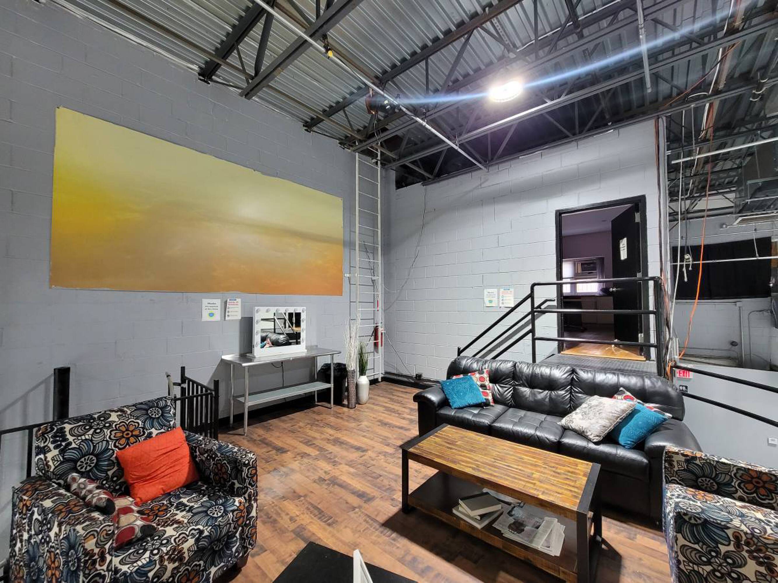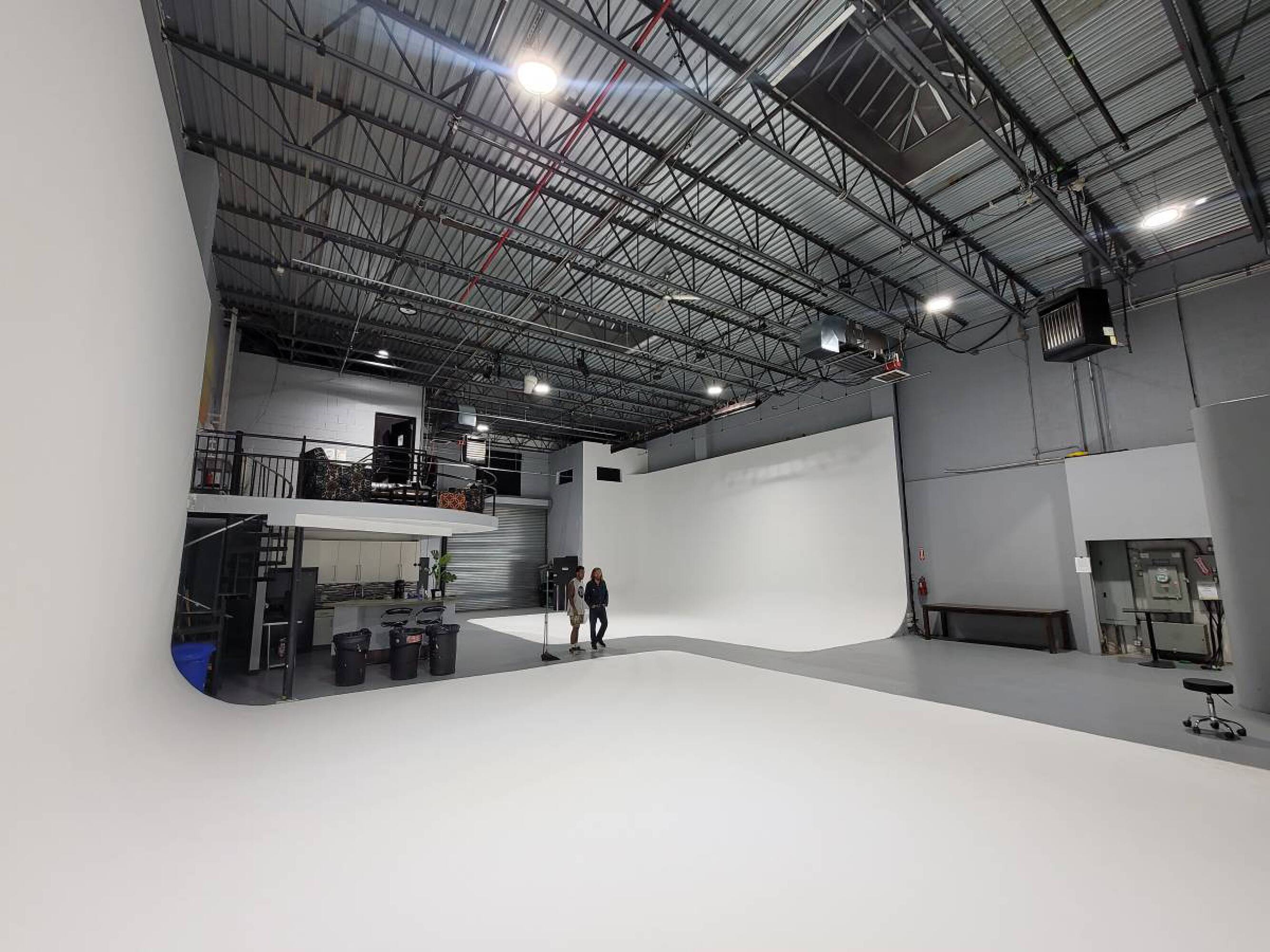 Versatile commercial space with high ceilings, kitchen, and drive-in gates.